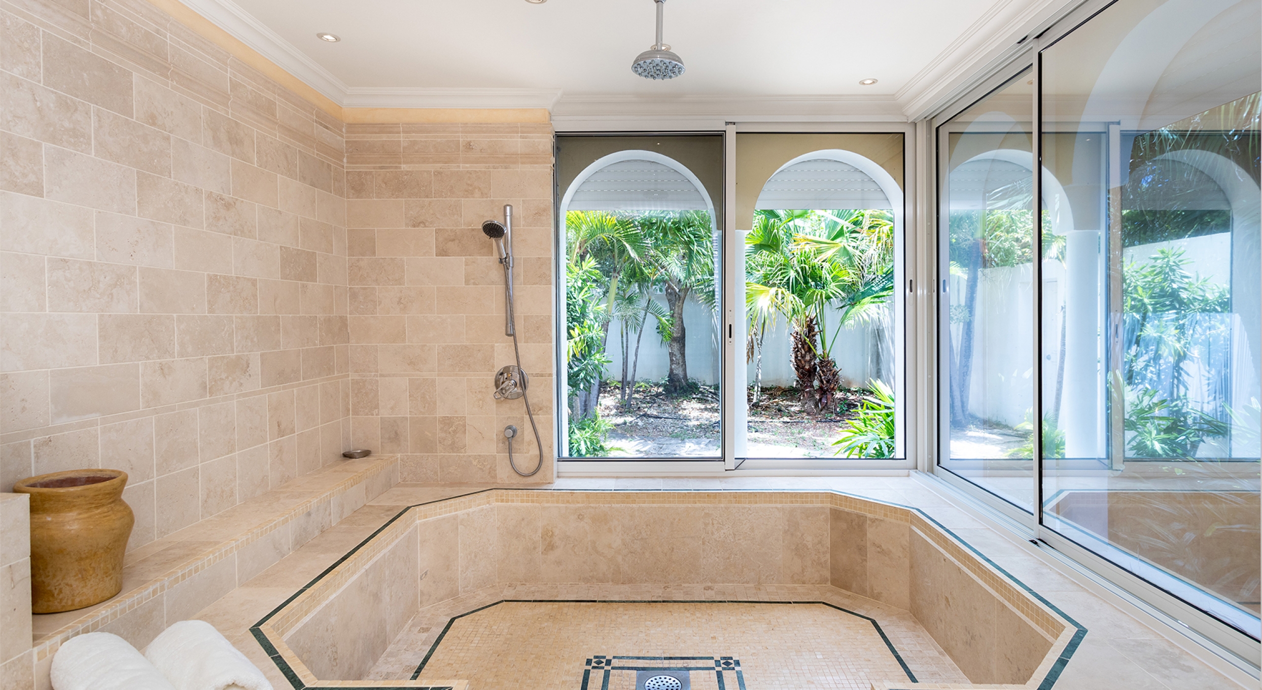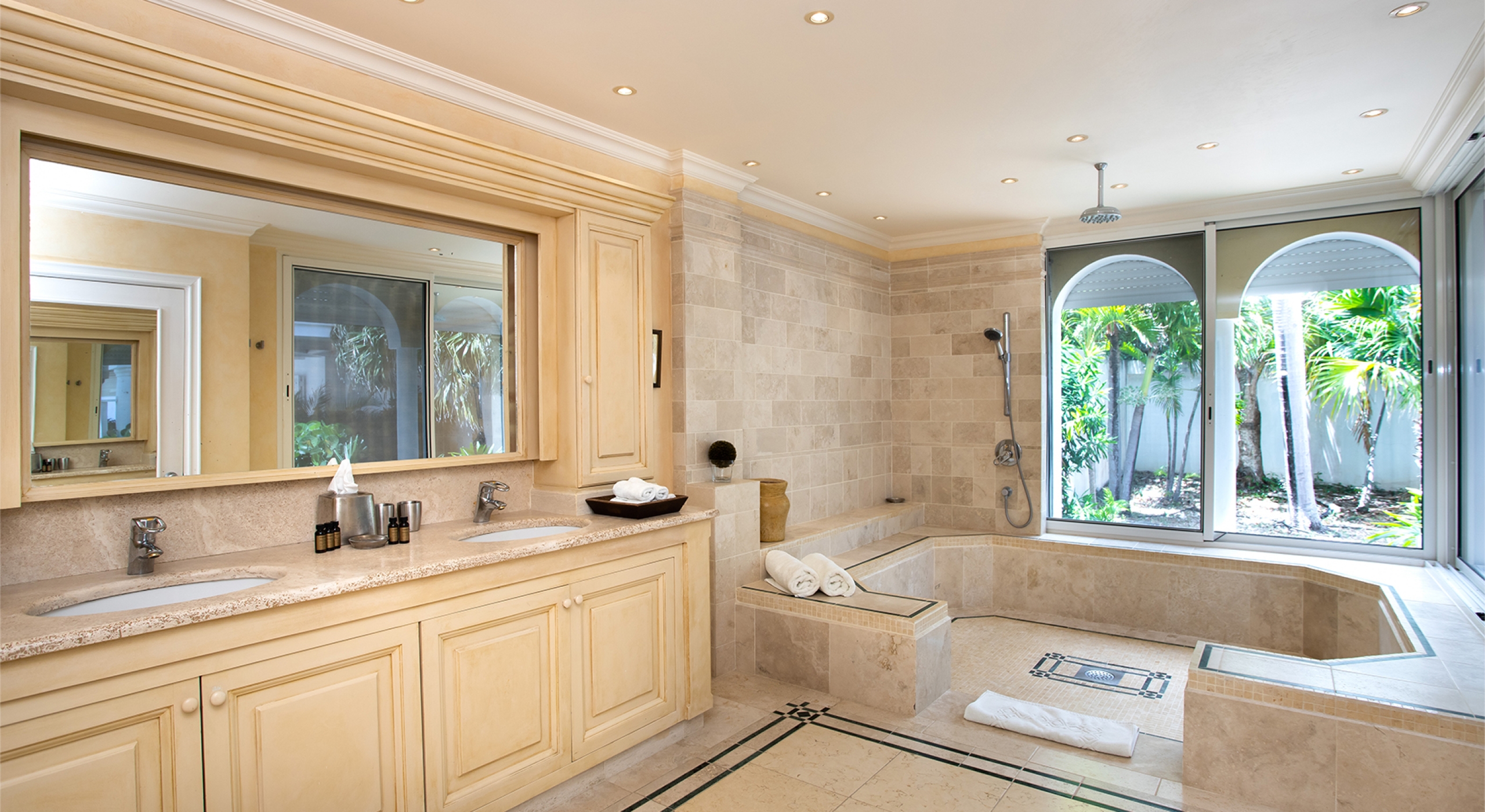 The villa features three oversized master suites, each beautifully finished in Italian tumbled marble and offering panoramic sea views, even from the en-suite bathrooms. Each suite opens onto its own private terrace and either a secluded patio or garden, allowing guests to connect with the outdoors in complete privacy.