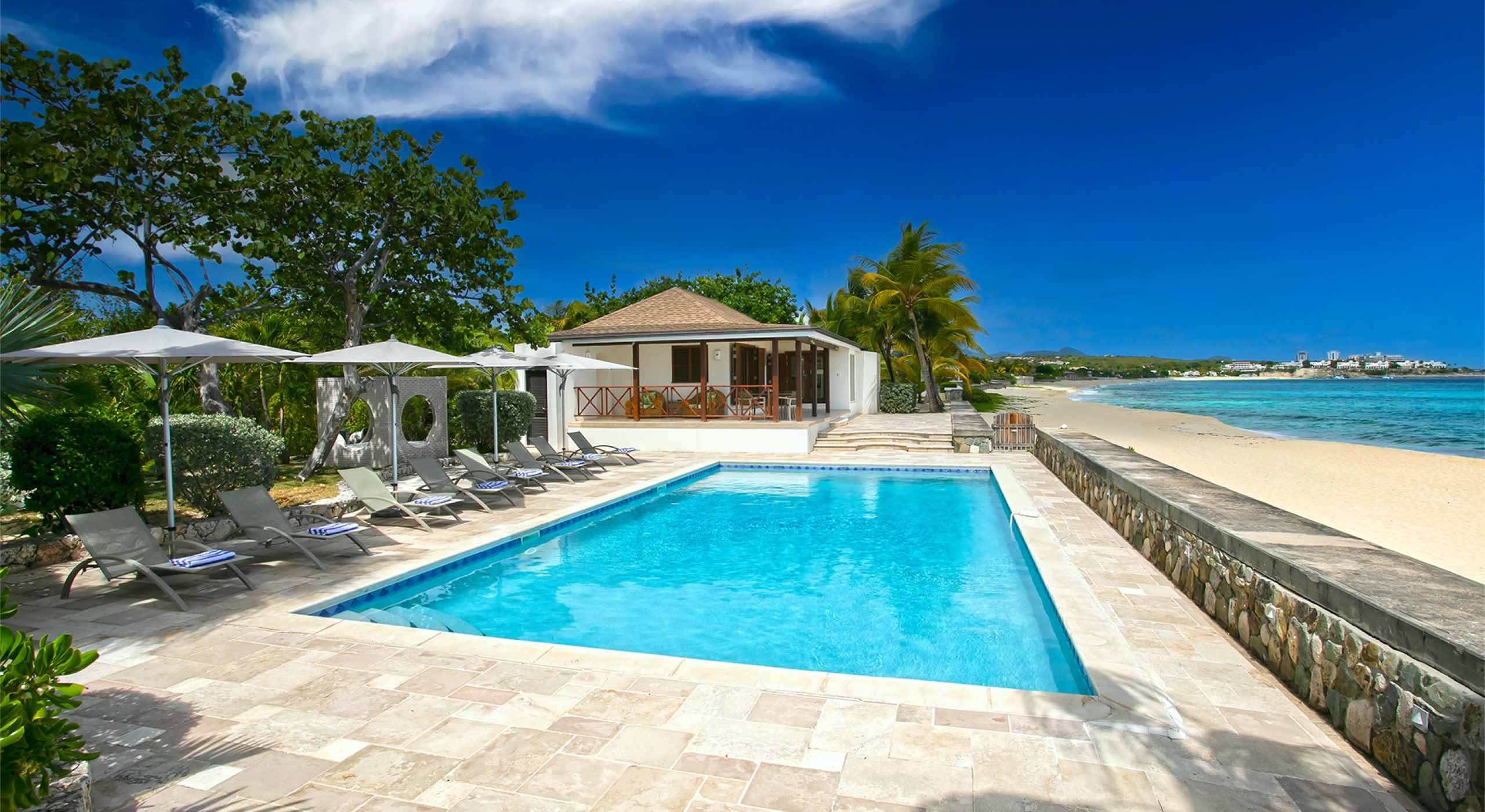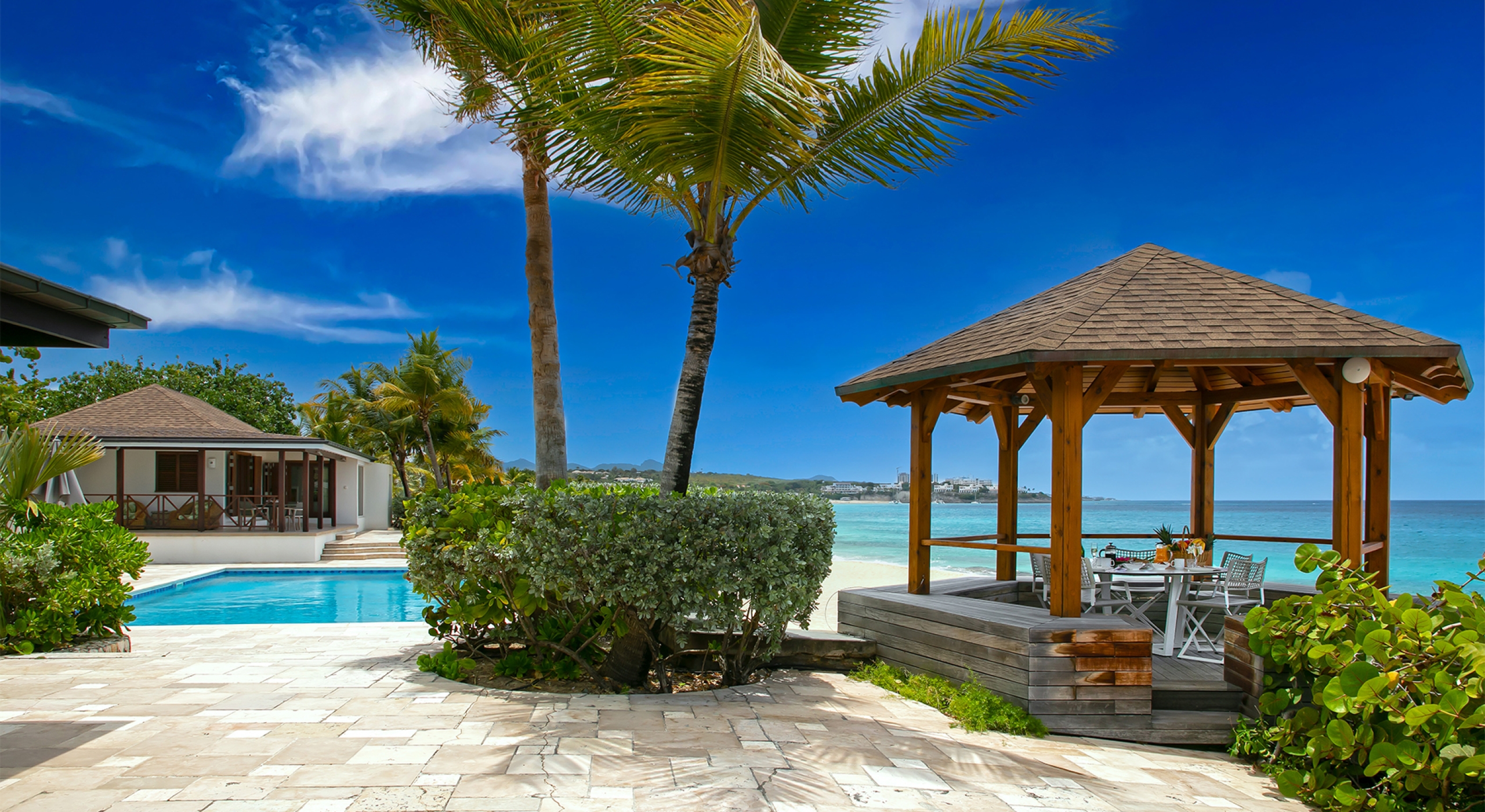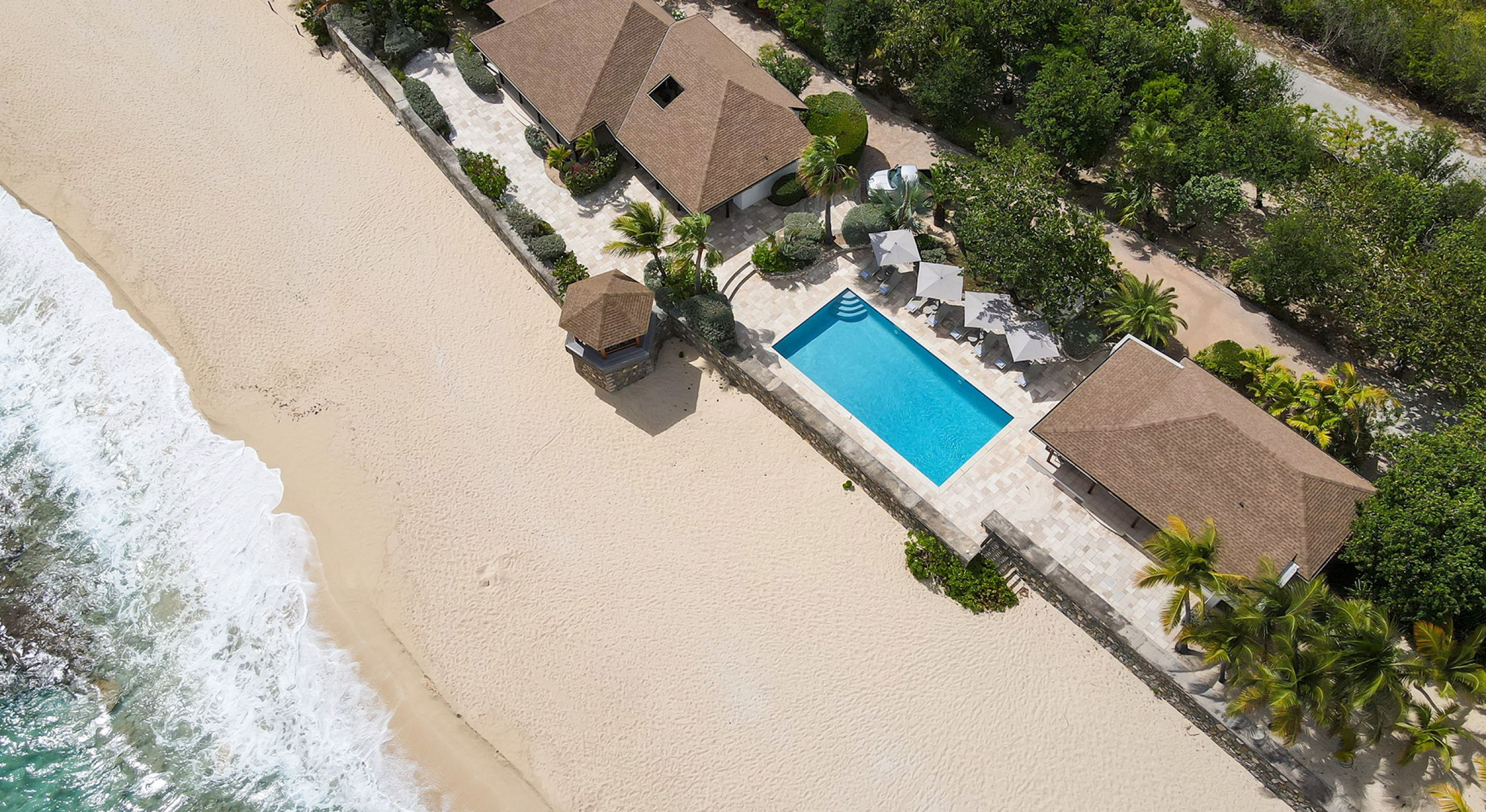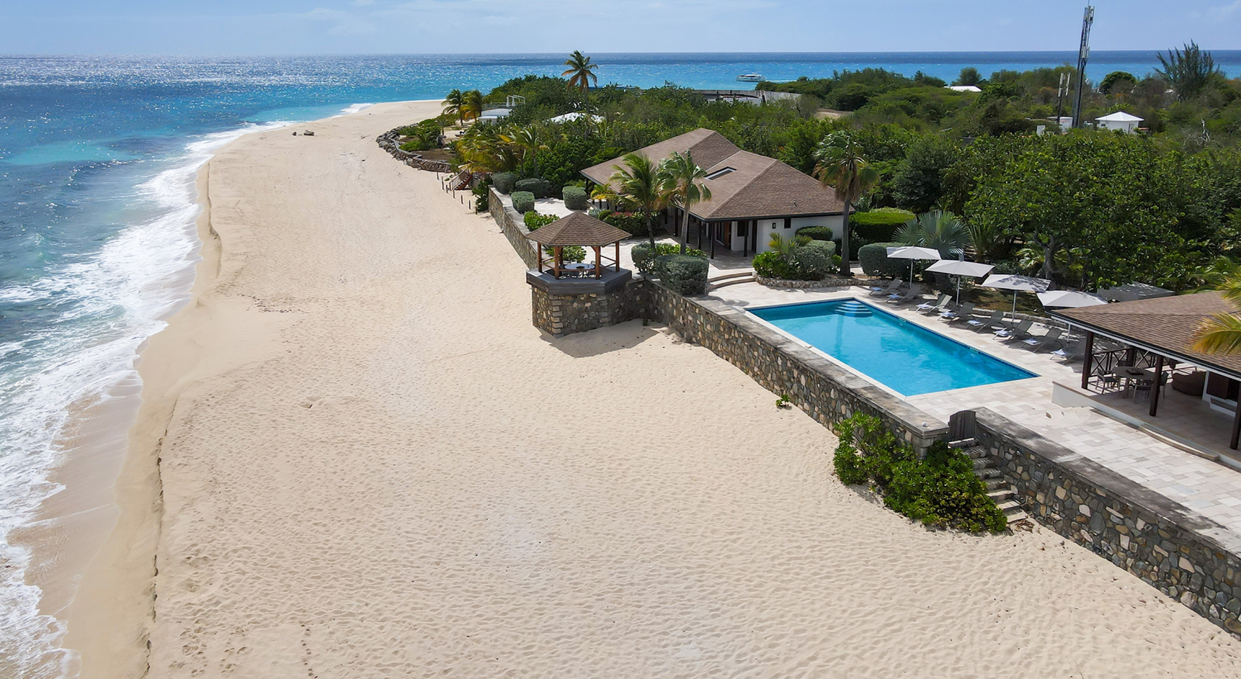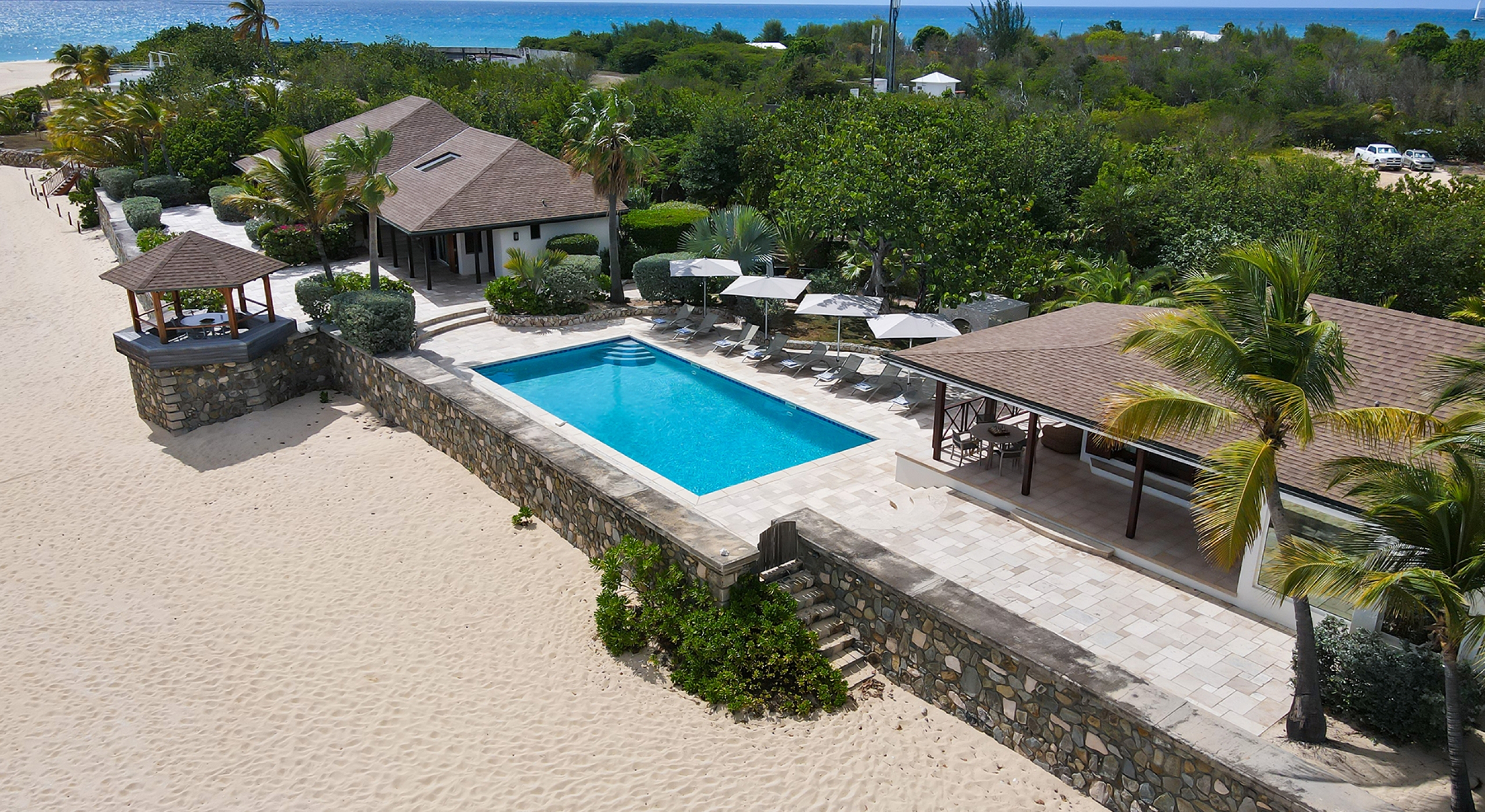Embedded in lush tropical gardens, the house is composed of two wings flanking a large pool centered in a tumbled travertine terrace that expands the full length of the residence. Built on multi-levels, sweeping carved stairs connect the terrace spaces. The entire structure is just steps from the sandy shore. A pretty gazebo for watching sunsets sits at the terrace edge. At one end of the verandah is a two-bedroom cottage with a private patio. Both bedrooms have sea views; one has a kitchenette. The decor is romantic; serene, white, and comfortable. Beautiful custom mahogany Creole windows and doors add to the atmosphere. Each bedroom has an en-suite bathroom in pretty tiles.