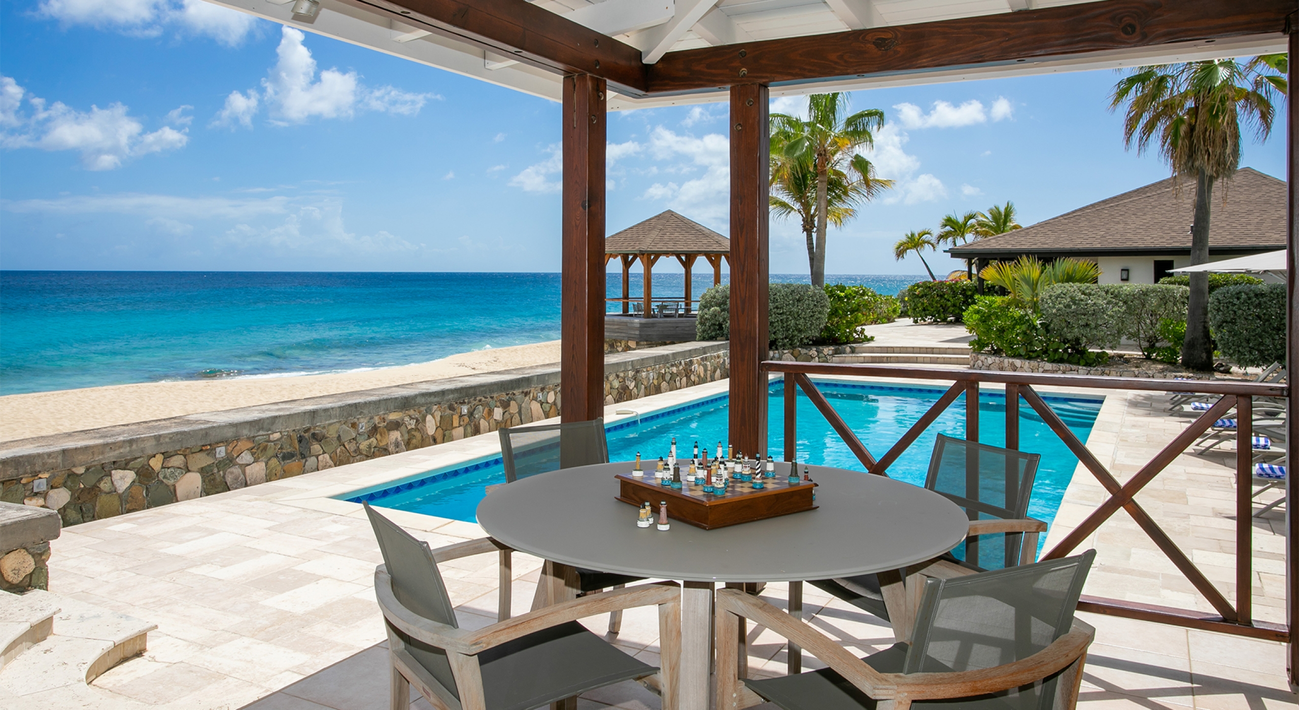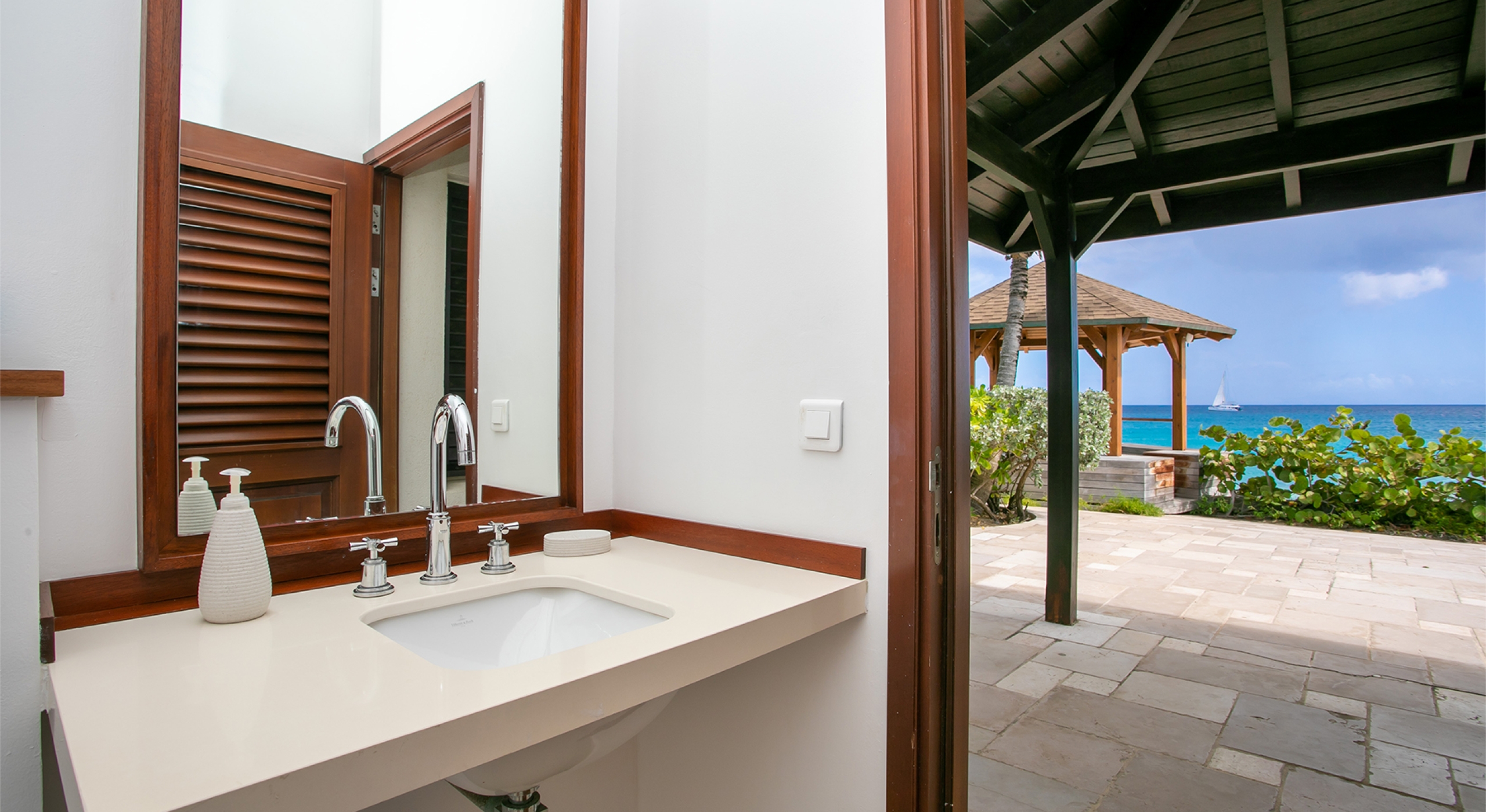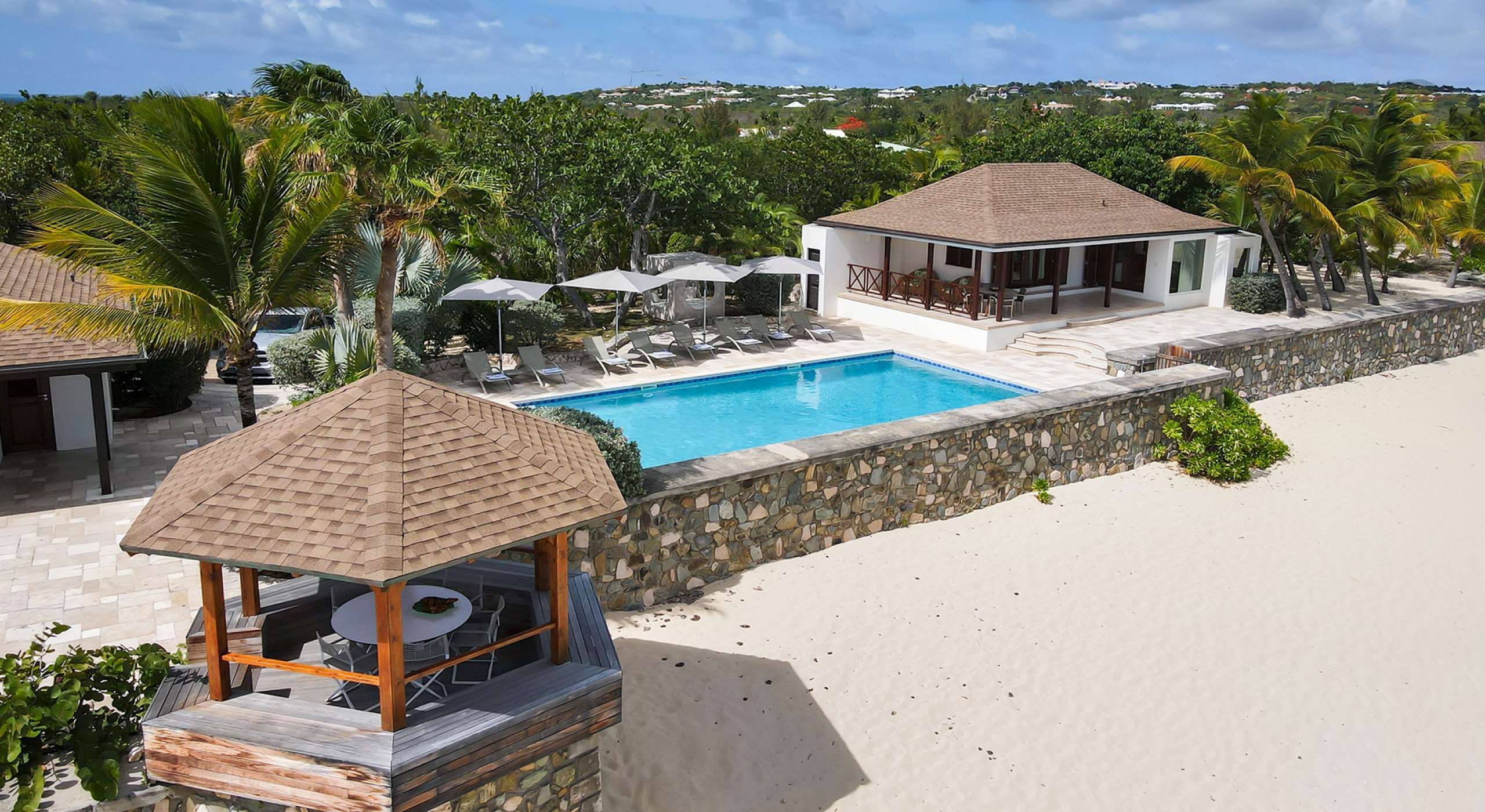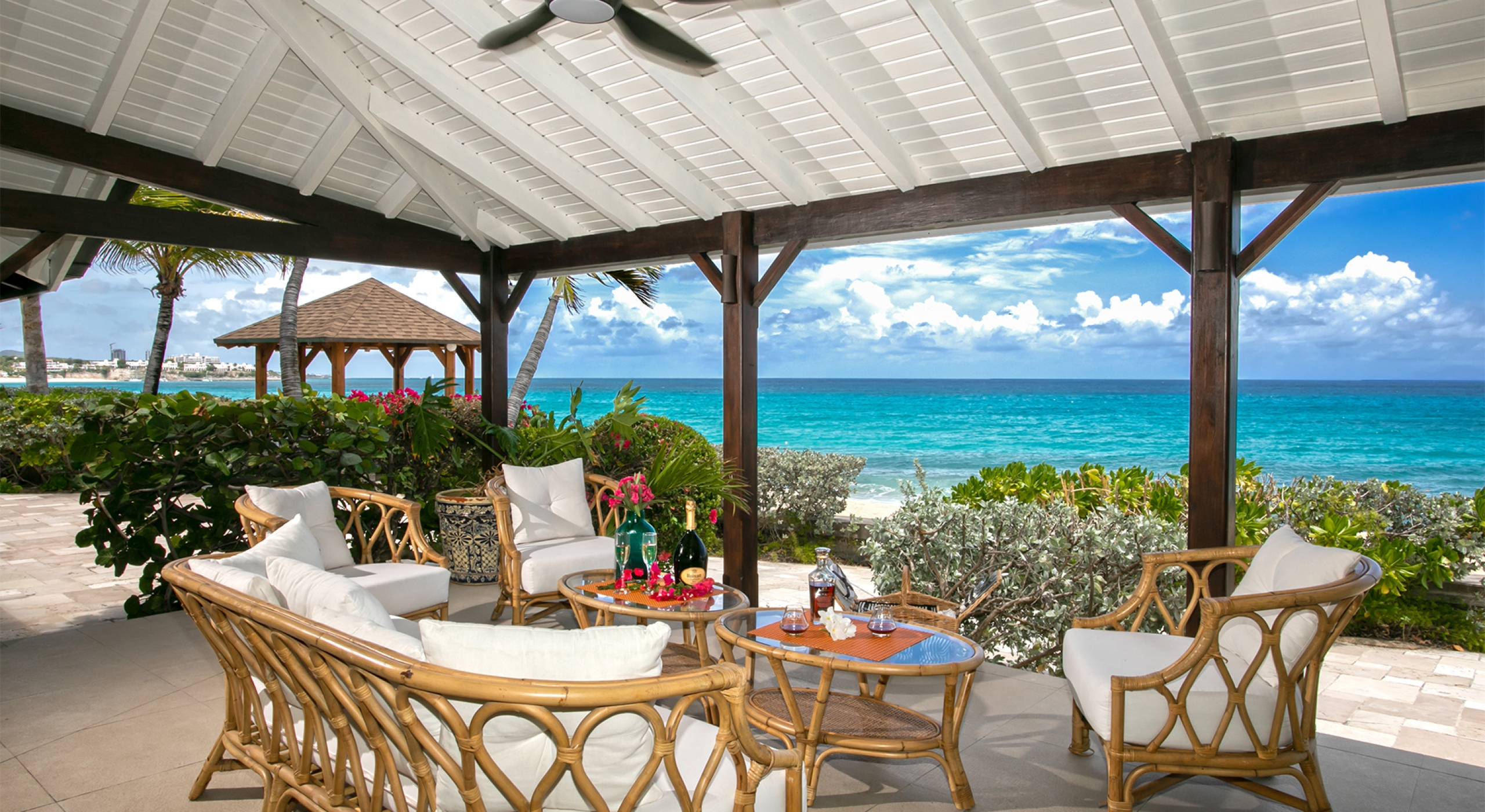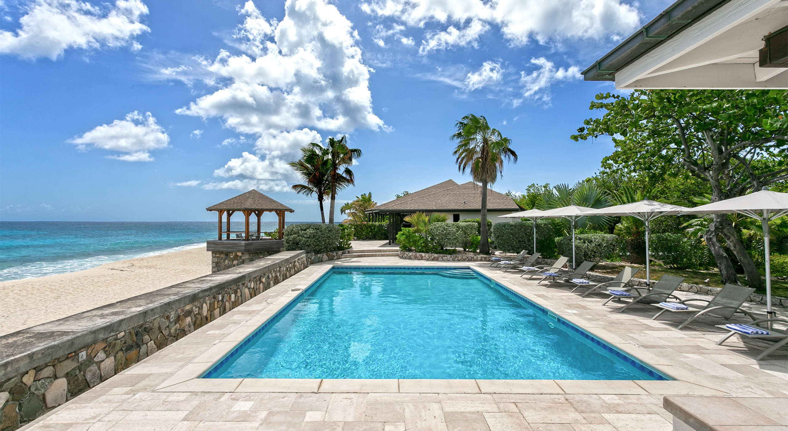 Embedded in lush tropical gardens, the house is composed of two wings flanking a large pool centered in a tumbled travertine terrace that expands the full length of the residence. Built on multi-levels, sweeping carved stairs connect the terrace spaces. The entire structure is just steps from the sandy shore. A pretty gazebo for watching sunsets sits at the terrace edge. At one end of the verandah is a two-bedroom cottage with a private patio. Both bedrooms have sea views; one has a kitchenette. The decor is romantic; serene, white, and comfortable. Beautiful custom mahogany Creole windows and doors add to the atmosphere. Each bedroom has an en-suite bathroom in pretty tiles.