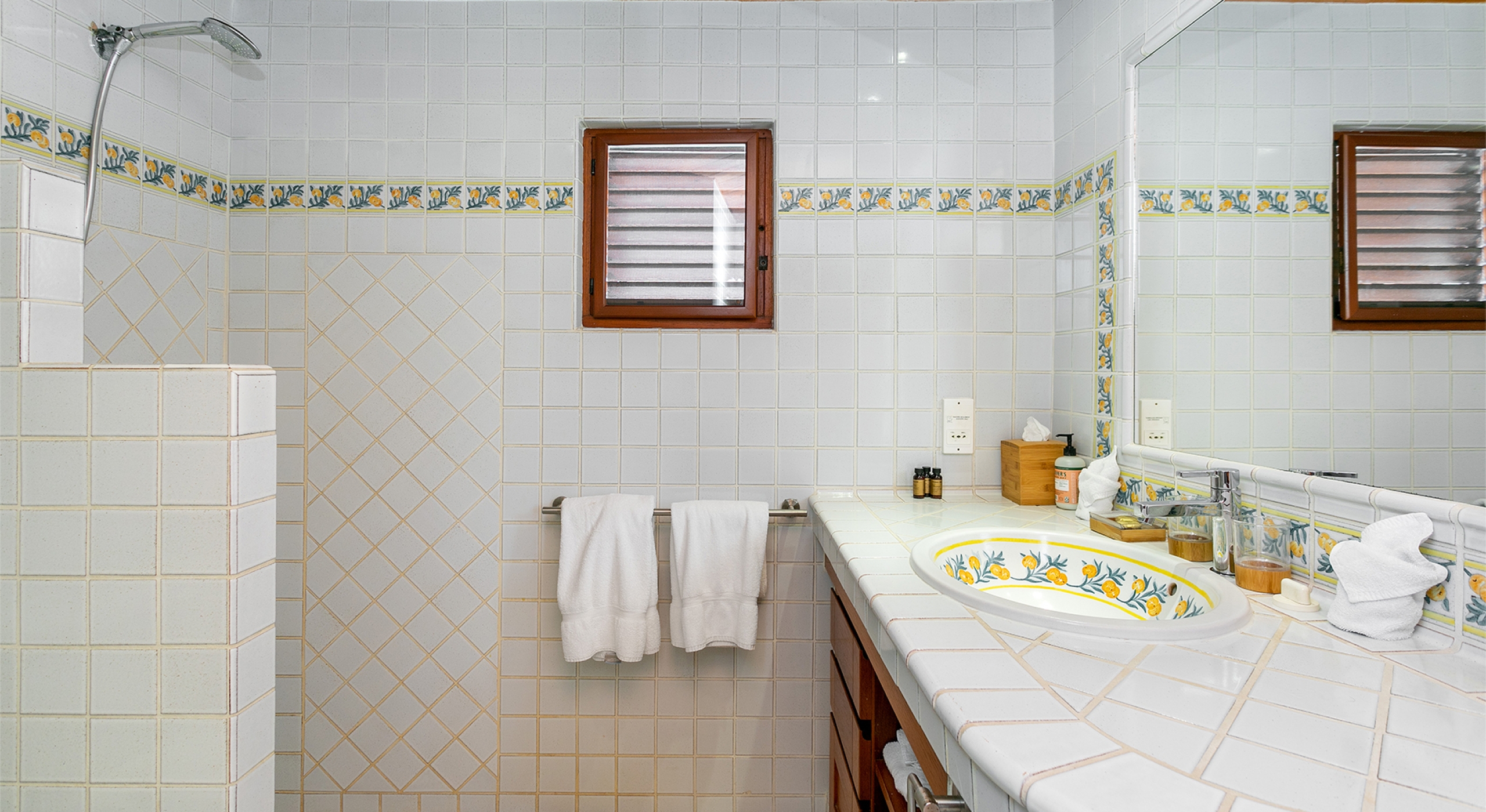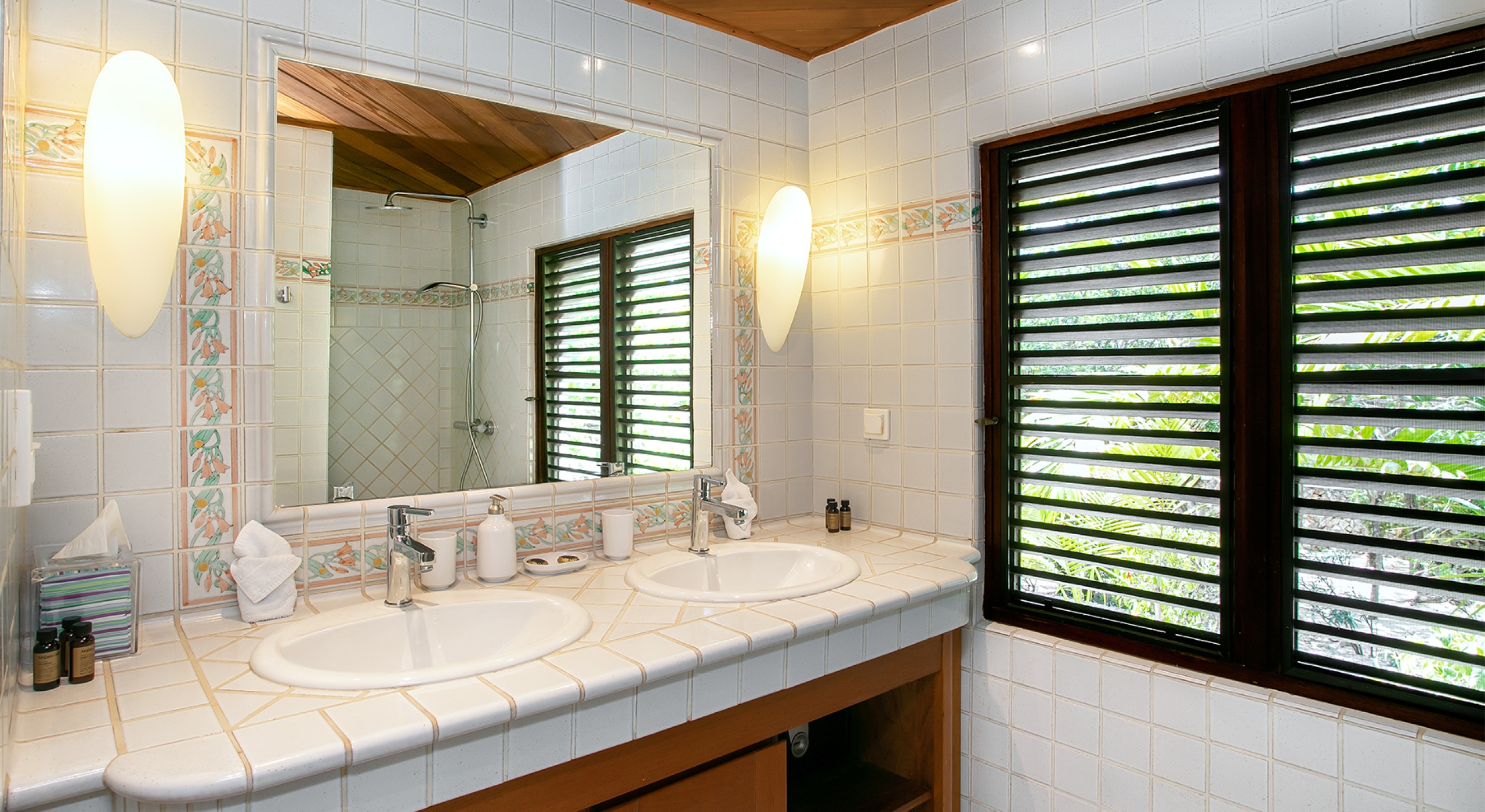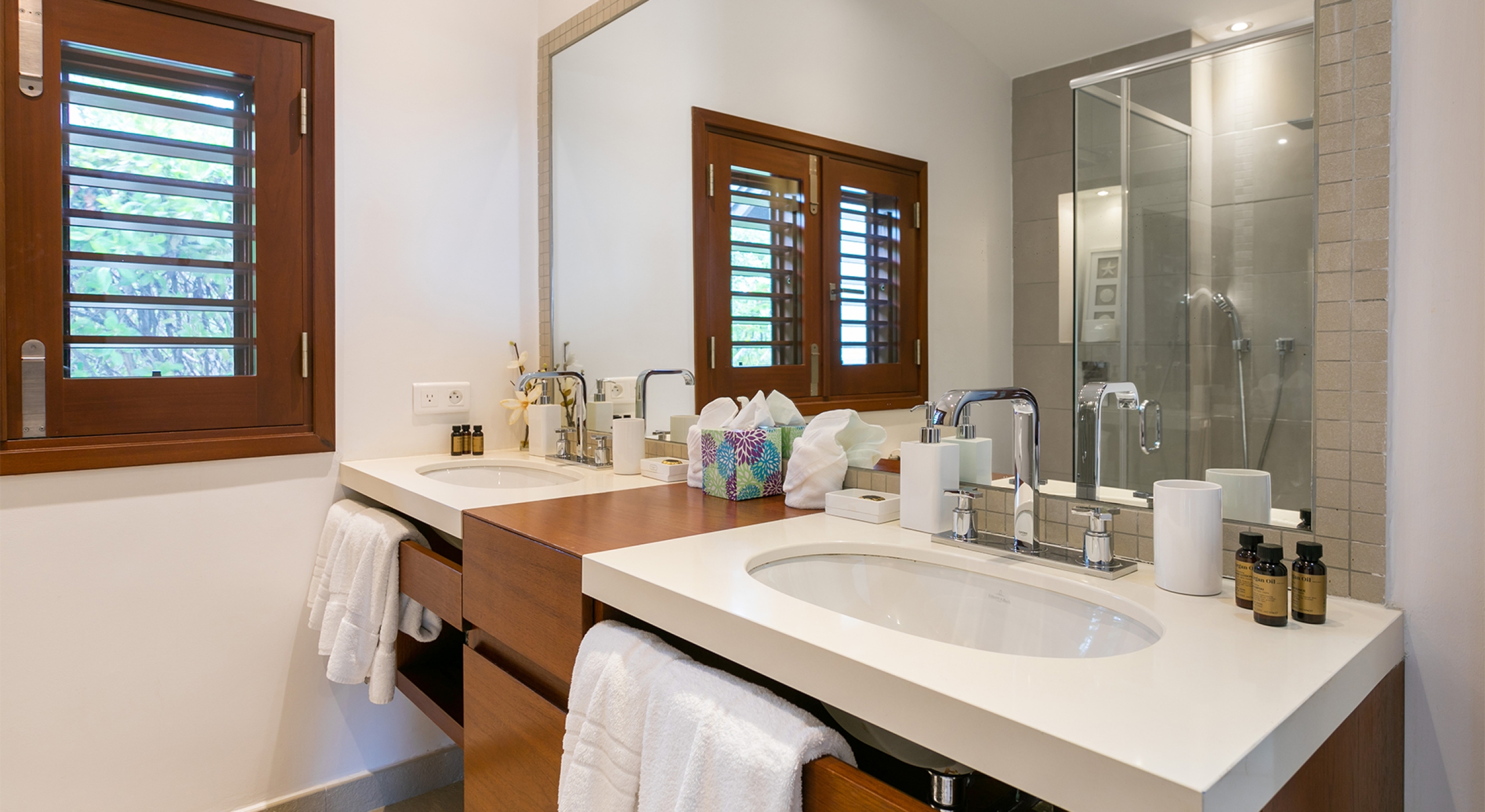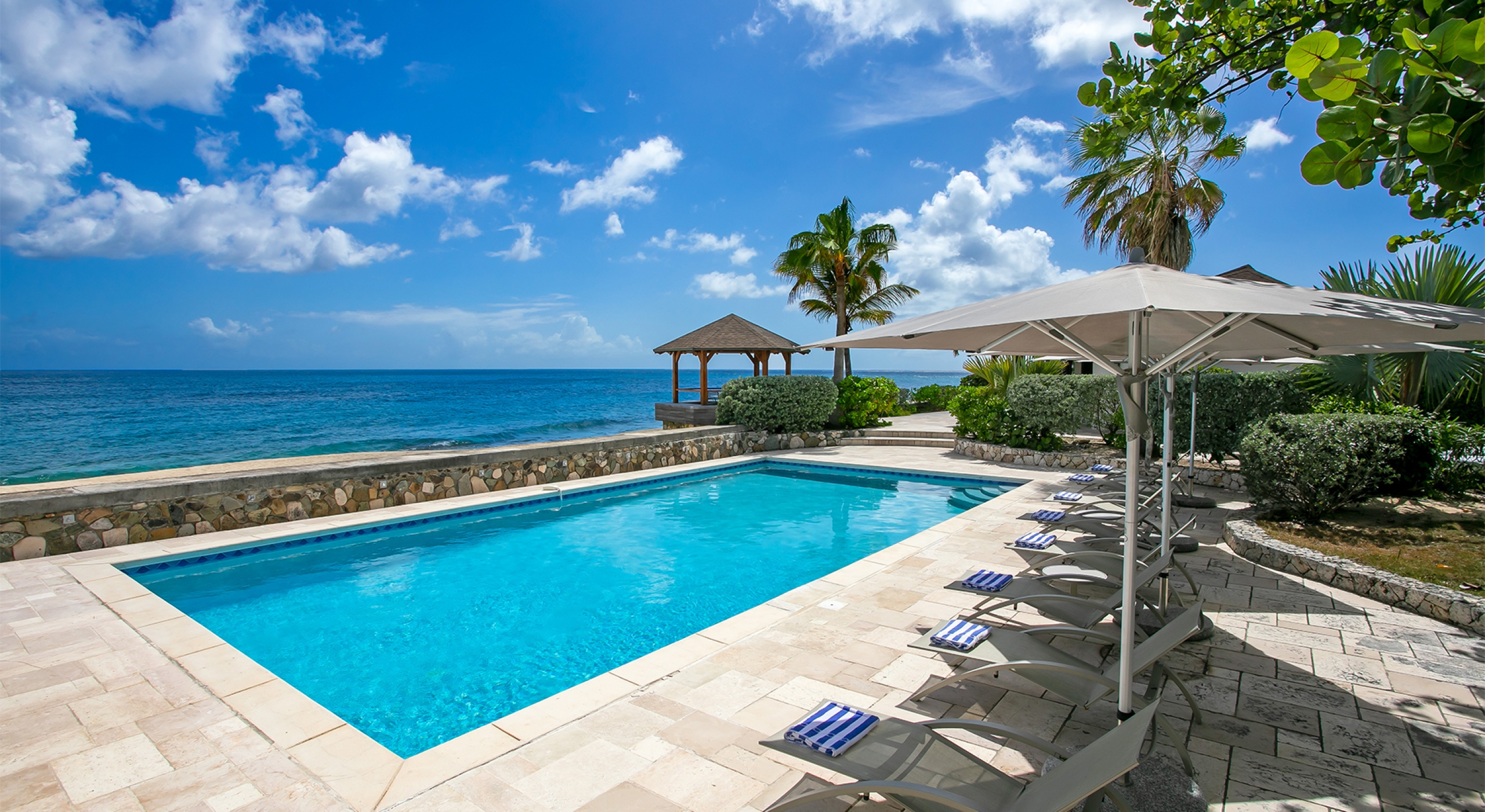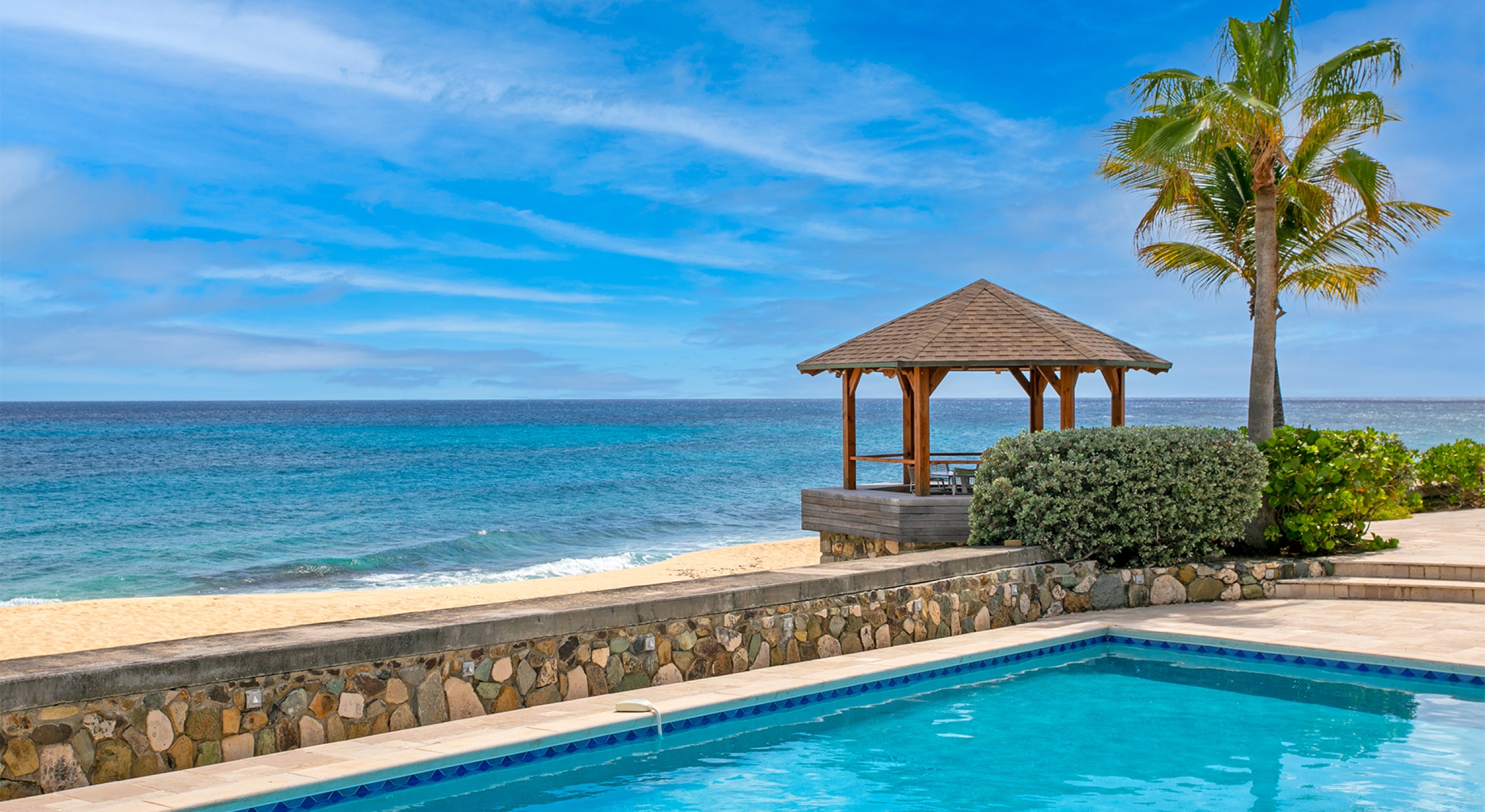 Embedded in lush tropical gardens, the house is composed of two wings flanking a large pool centered in a tumbled travertine terrace that expands the full length of the residence. Built on multi-levels, sweeping carved stairs connect the terrace spaces. The entire structure is just steps from the sandy shore. A pretty gazebo for watching sunsets sits at the terrace edge. At one end of the verandah is a two-bedroom cottage with a private patio. Both bedrooms have sea views; one has a kitchenette. The decor is romantic; serene, white, and comfortable. Beautiful custom mahogany Creole windows and doors add to the atmosphere. Each bedroom has an en-suite bathroom in pretty tiles.