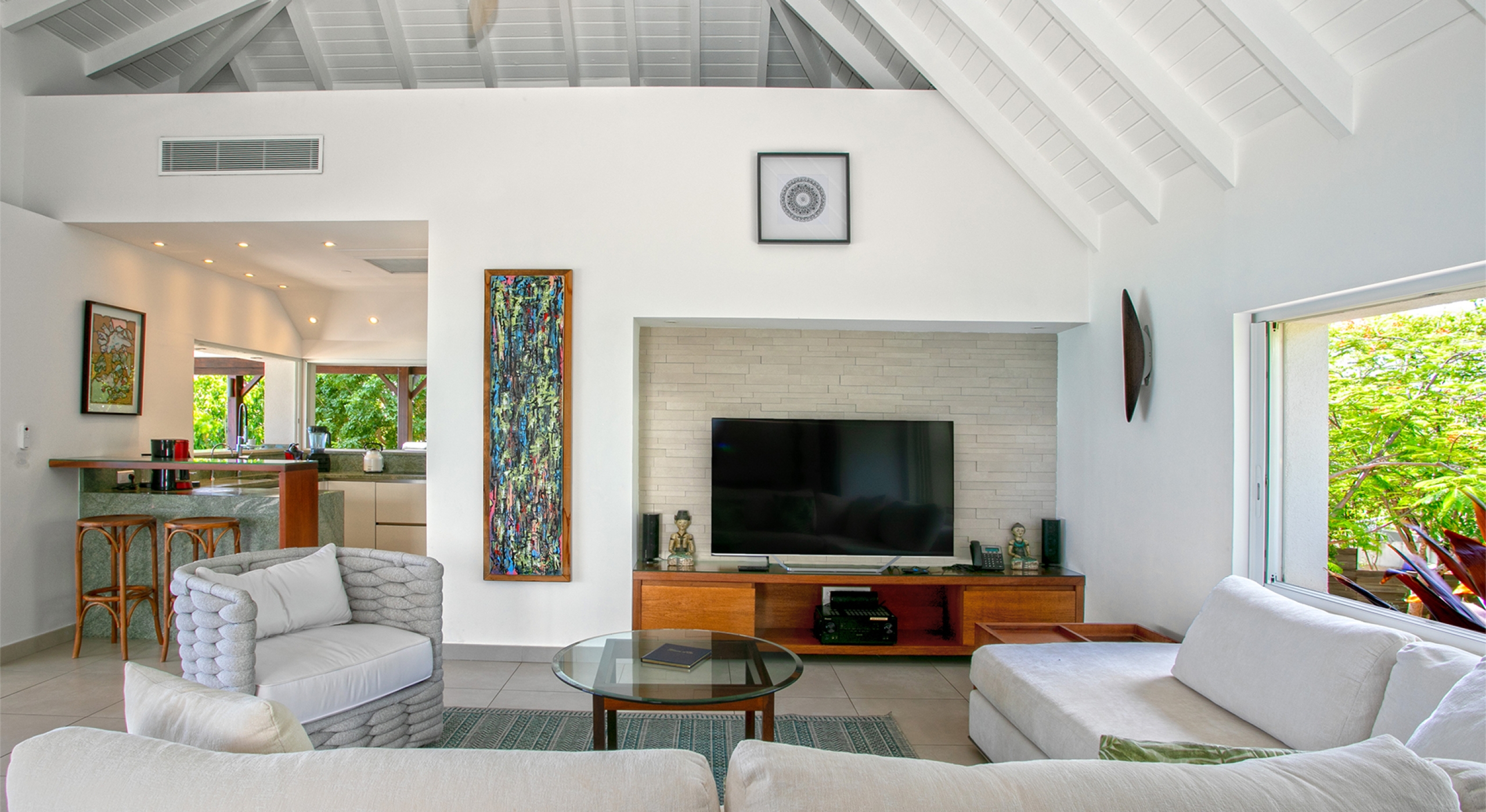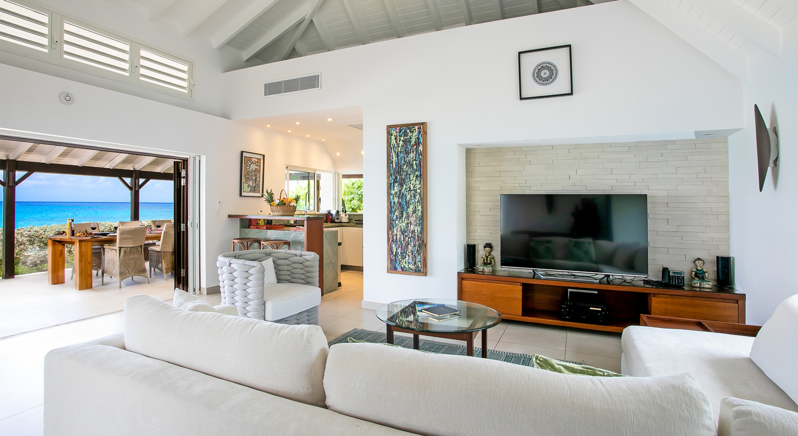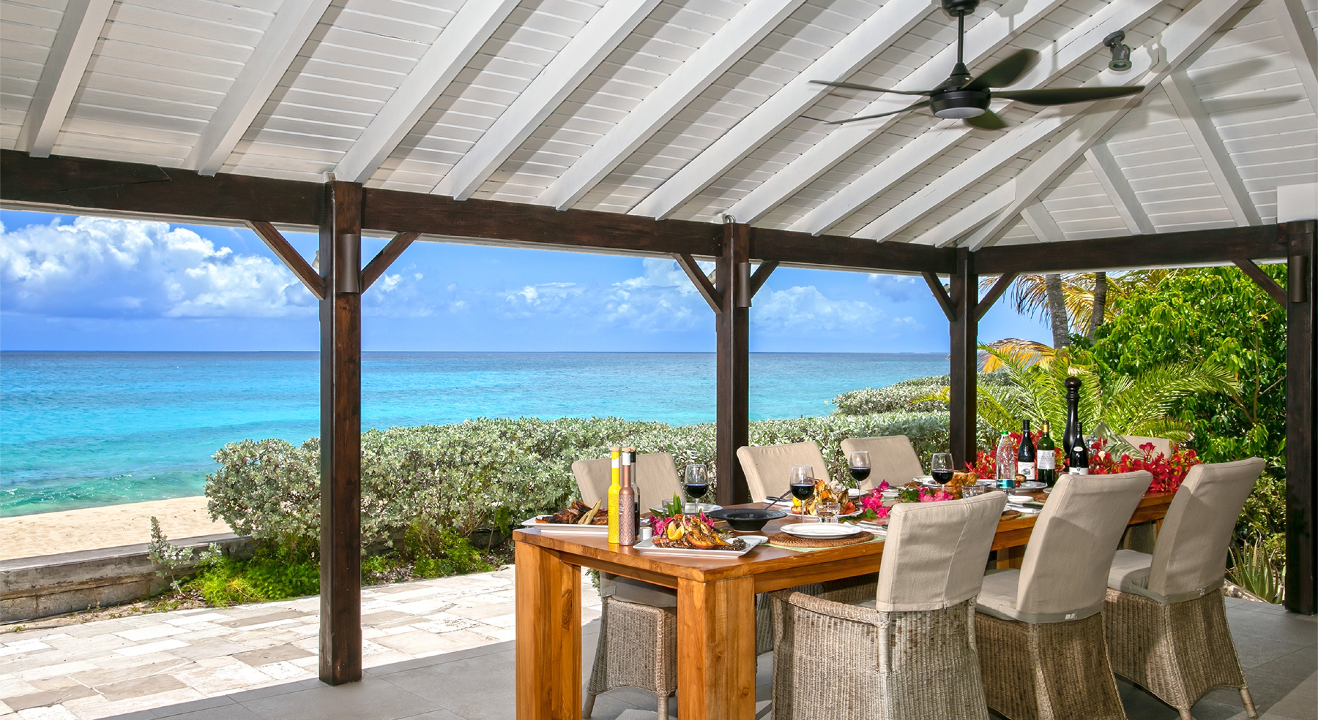 The main wing sits at the opposite end of the terrace. The open, airy great room, fully open to the view and the breezes, has spacious seating for relaxing. Rattan and teak furniture accented with tropical colors define the area. A well-equipped, modern galley style kitchen opens to the great room and the views. Deep covered verandahs with outdoor seating and dining spaces extend from the great room. You are steps from the ocean. A low coral stone sea wall, lined with silver buttonwood, palms, and bougainvillea, separates the terraces from the beach.