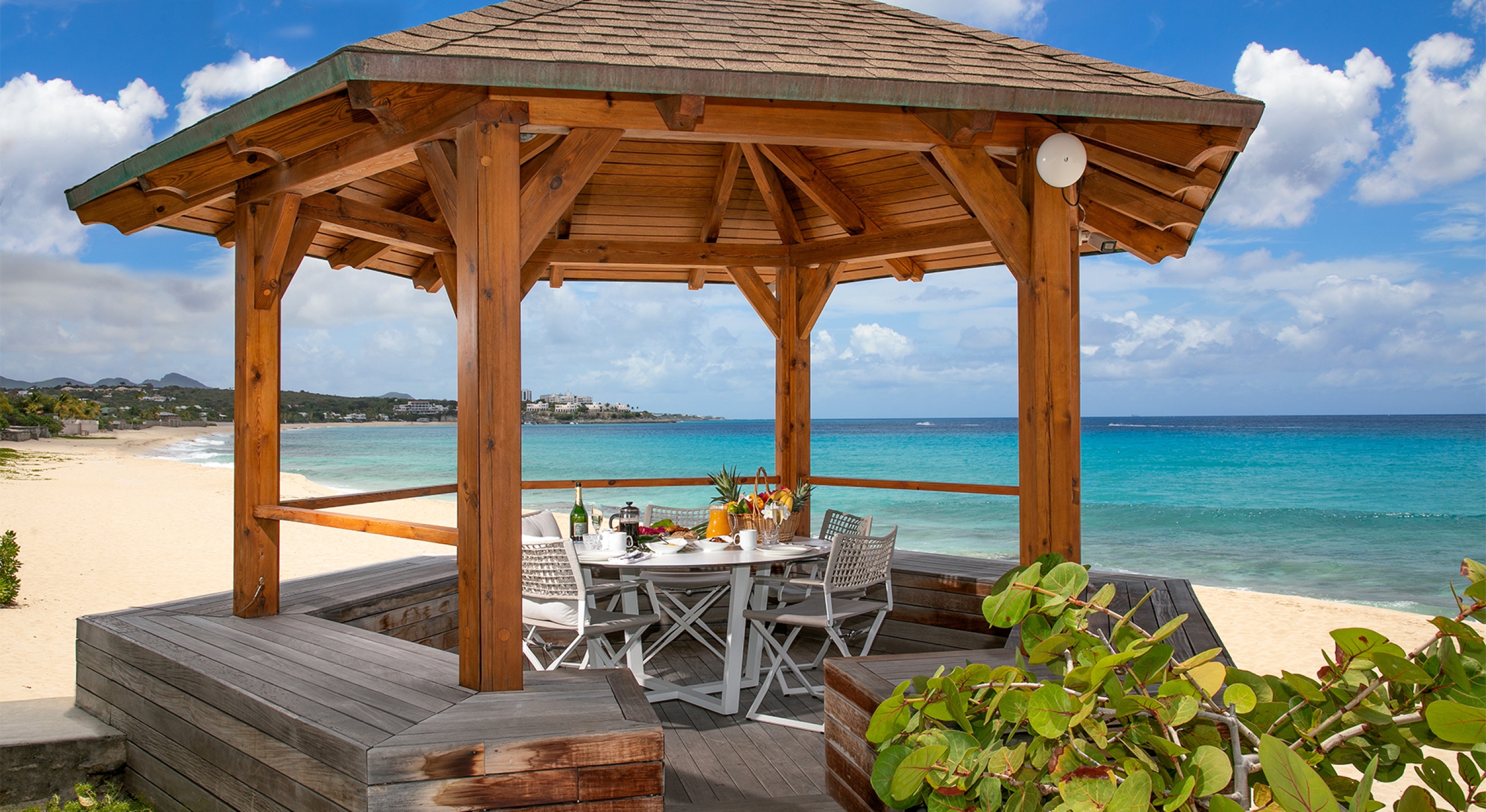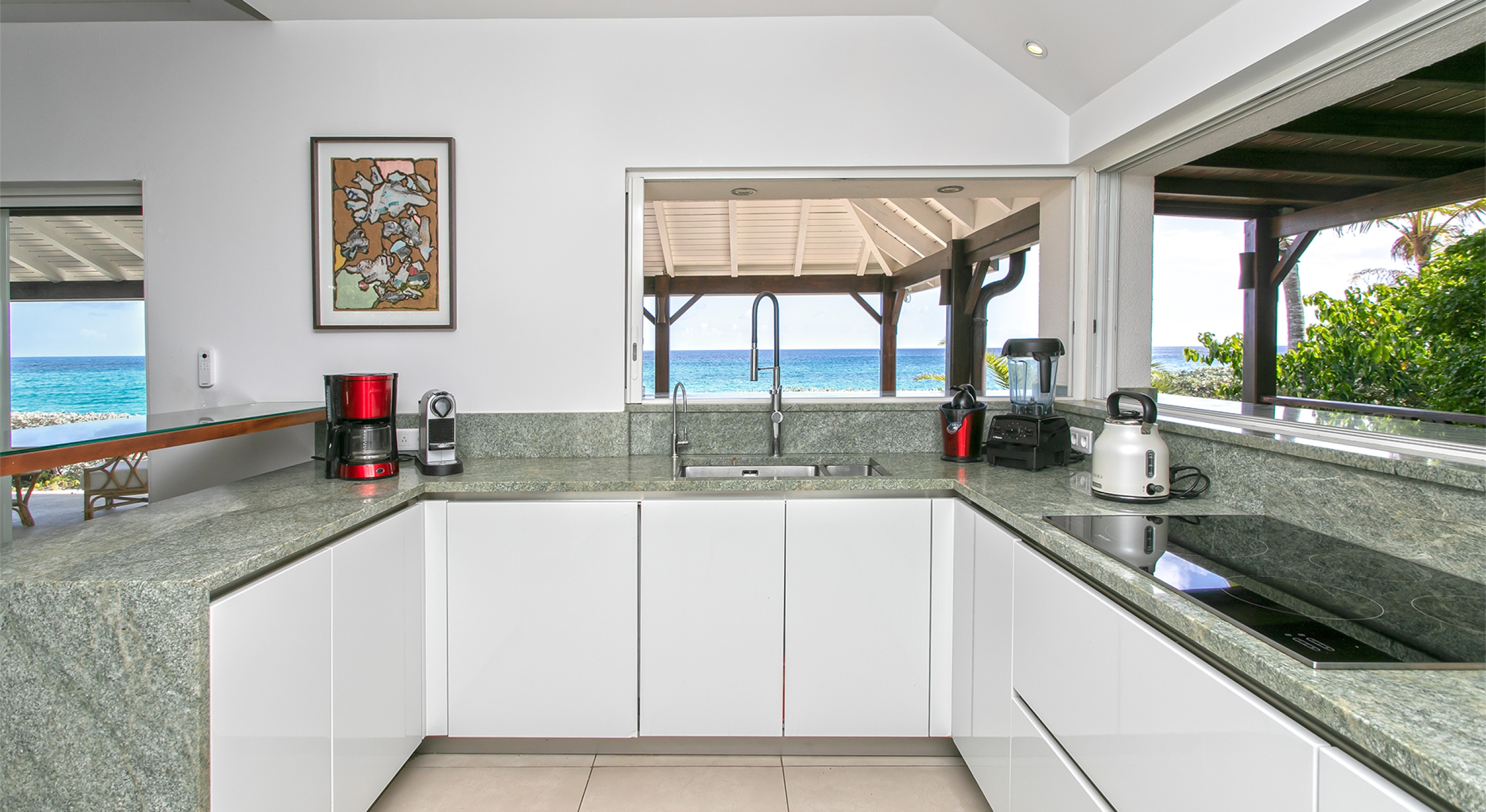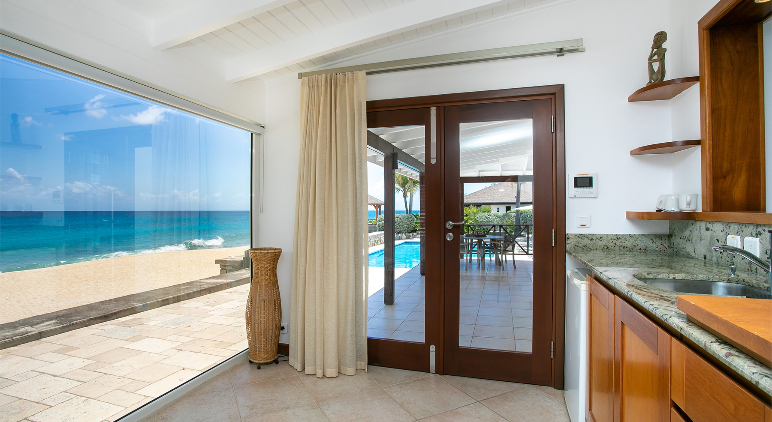 You are secluded, yet close to amenities. The beach is right in front of you. The fabulous restaurants and food purveyors in Baie Nettle and Porto Cupecoy are a few minutes' drive. You are 10 minutes to the French capital of Marigot, with its shops, restaurants, markets, and galleries, and 8 minutes to the airport. Grand Case and Philipsburg are 30 minutes away.