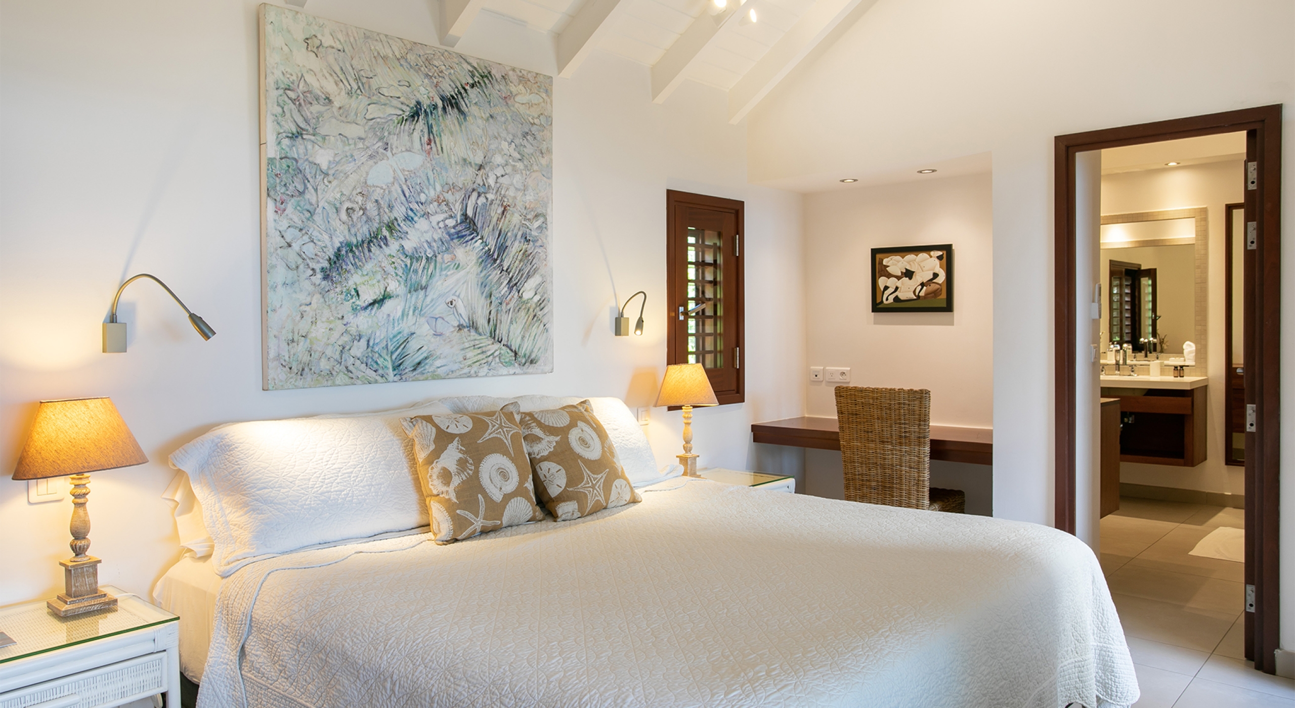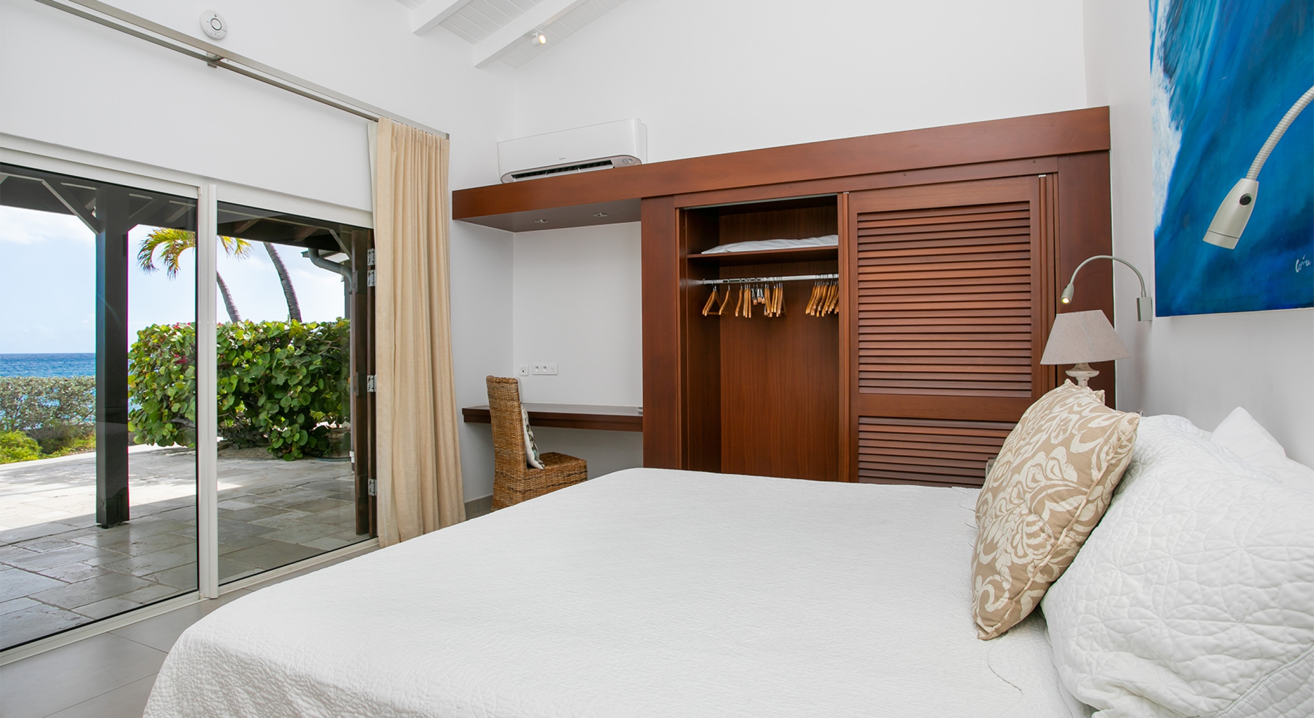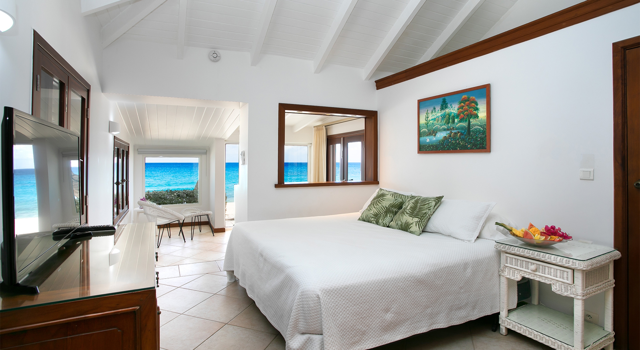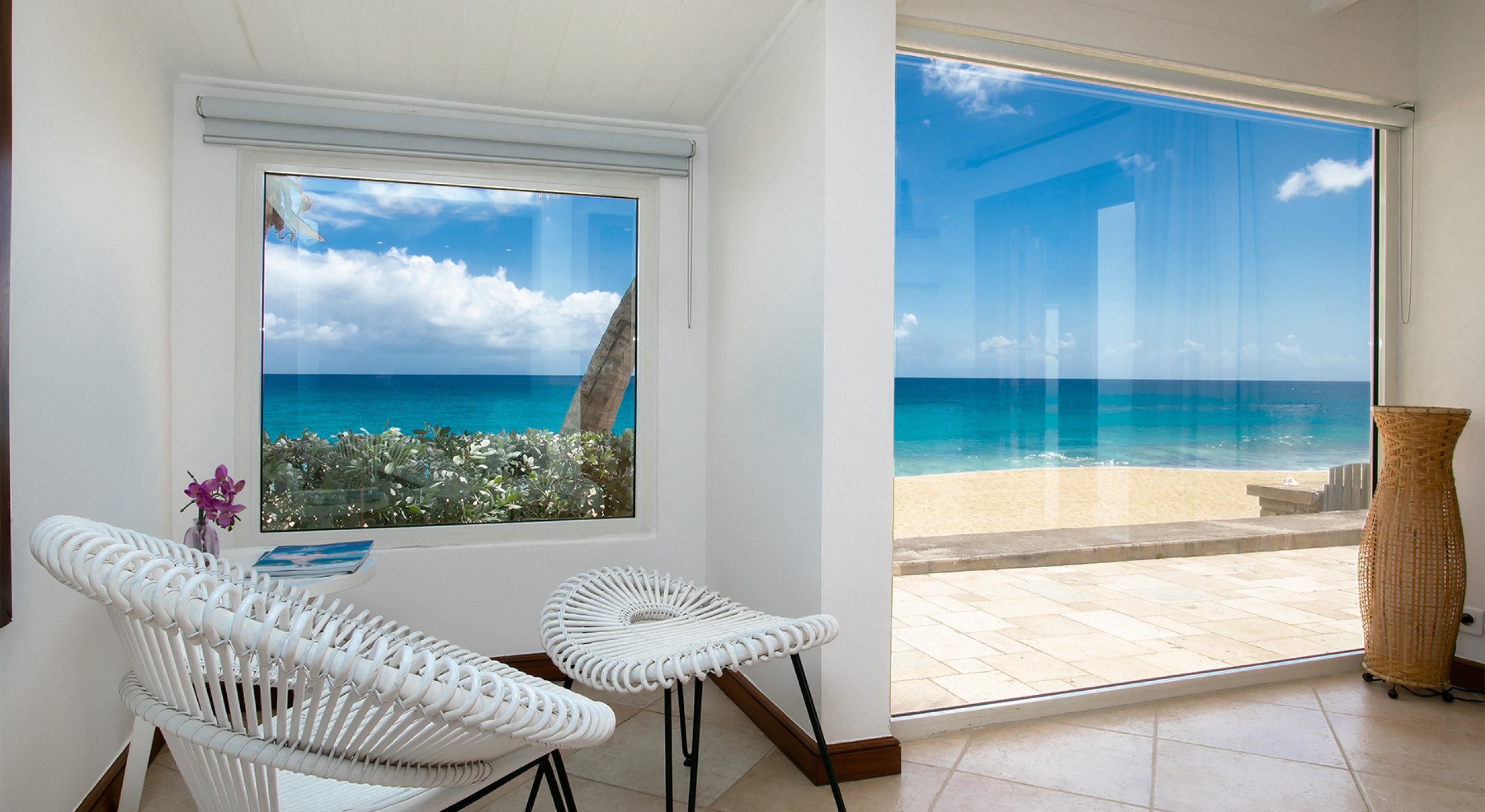 Two additional bedrooms are off the great room. Both have sea views, spa-style bathrooms, and charmingly furnished in rattan, wicker, and teak with white linens. To expand sleeping capacity, Blue Beach can be rented along with its sister villa, Turtle Nest, right next door. It's like having Baie Lounge Beach all to yourself.