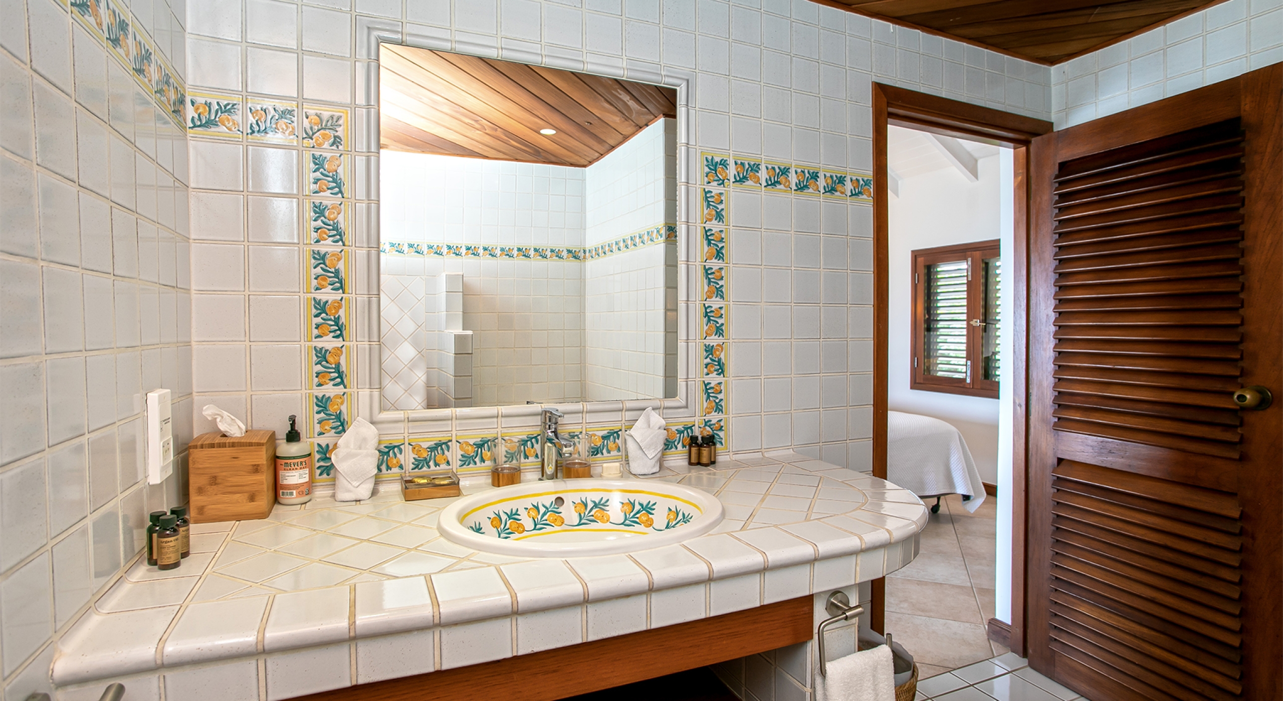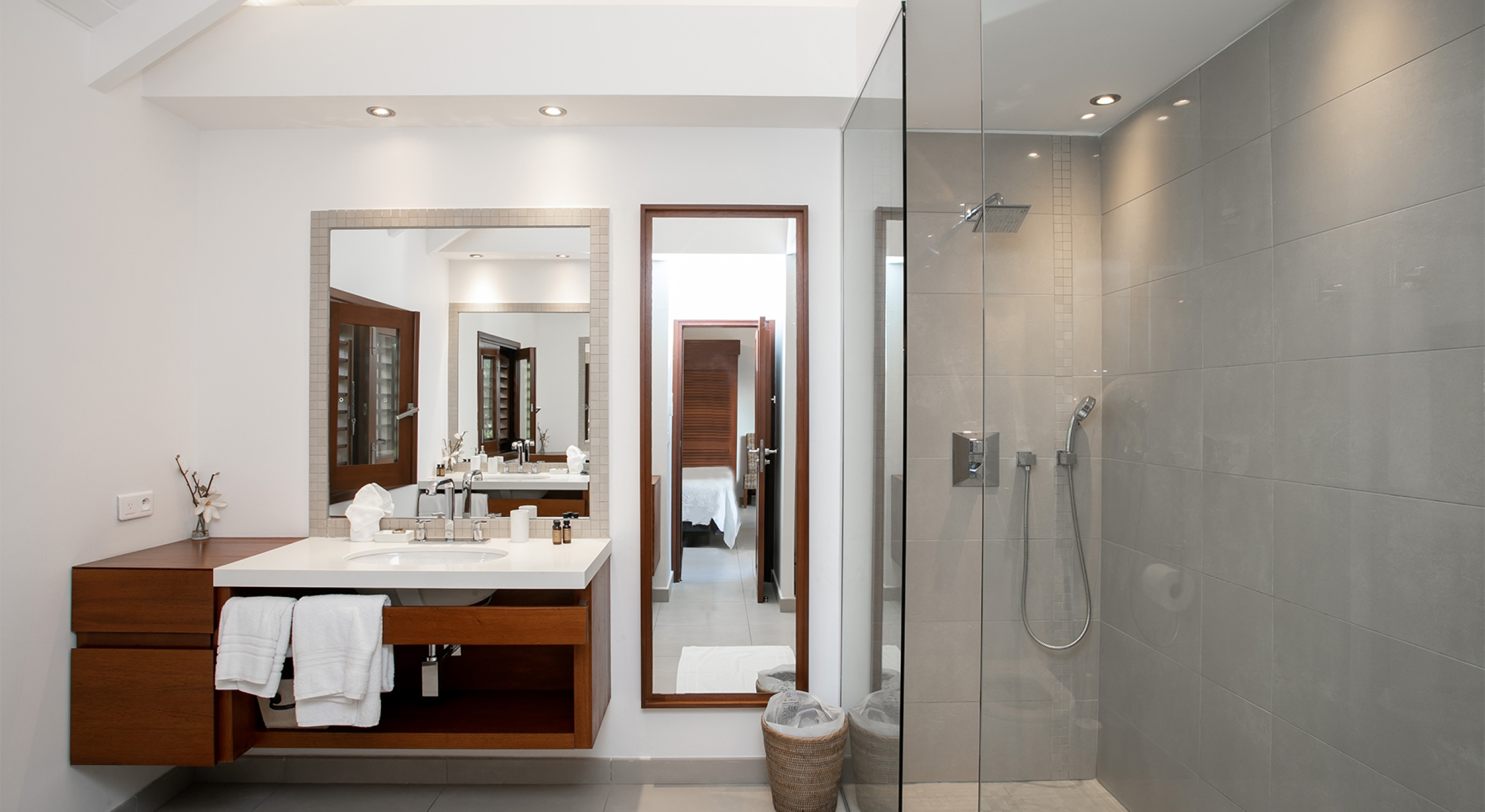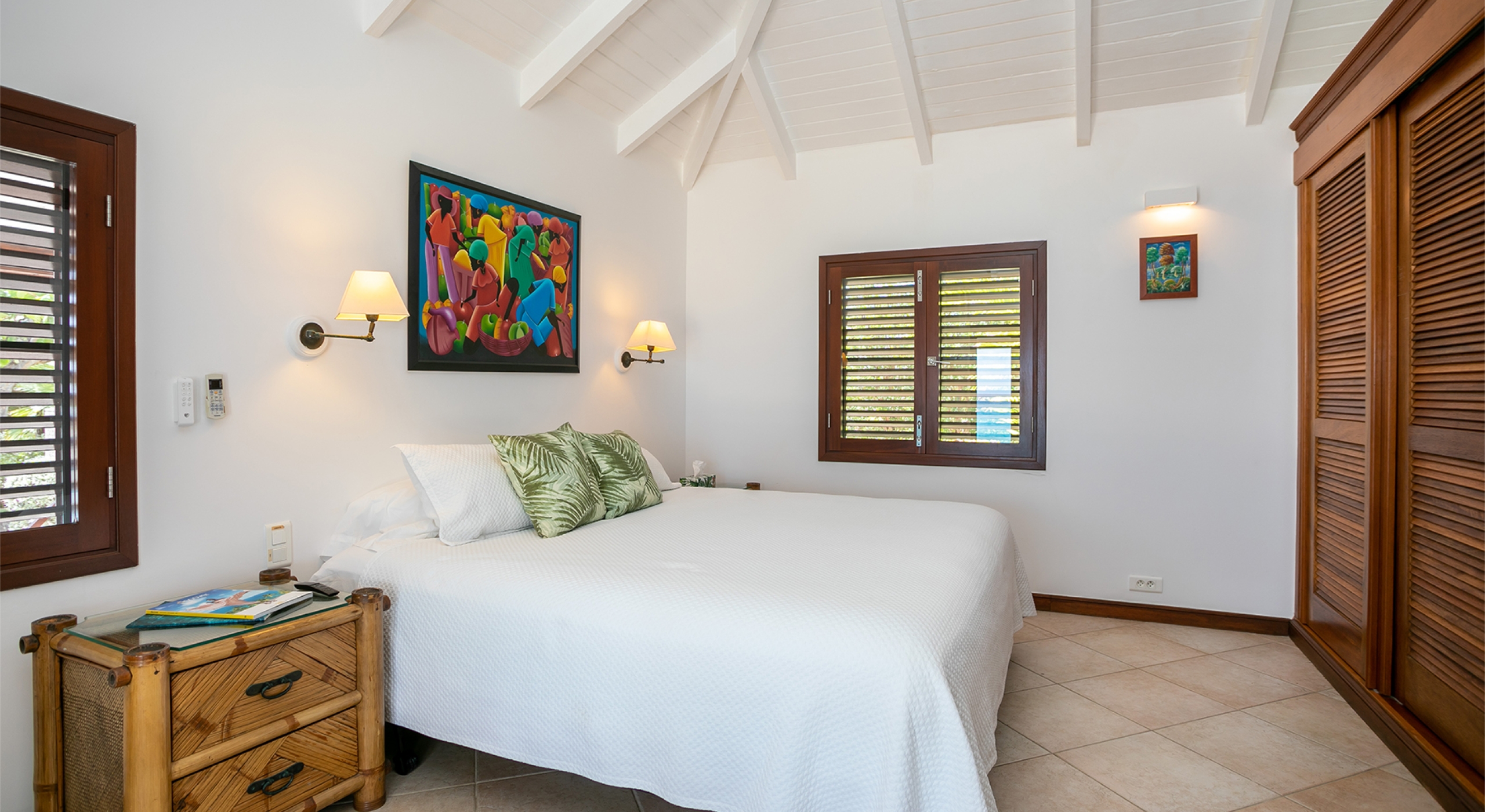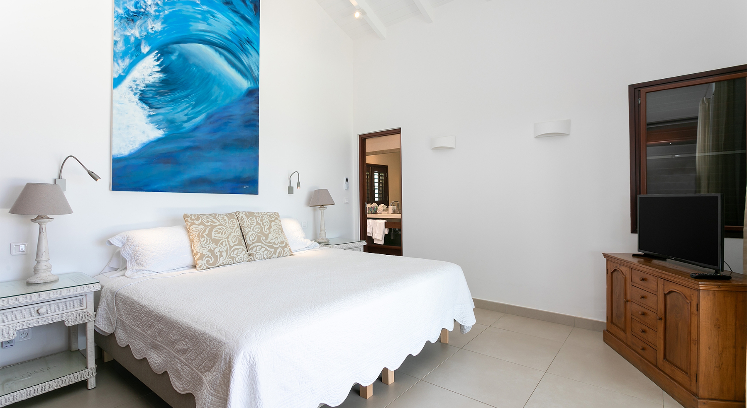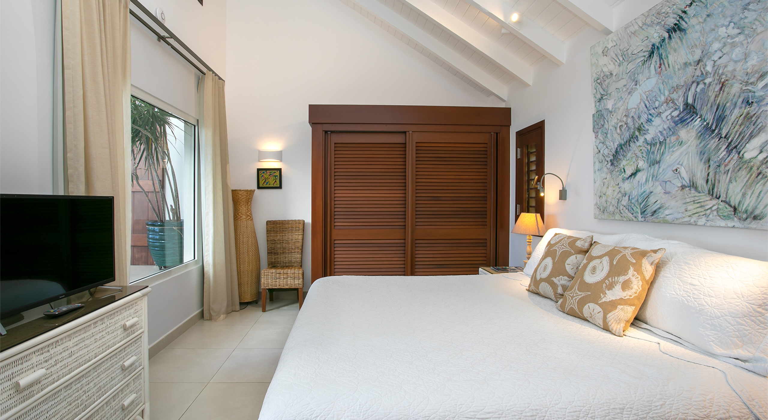Two additional bedrooms are off the great room. Both have sea views, spa-style bathrooms, and charmingly furnished in rattan, wicker, and teak with white linens. To expand sleeping capacity, Blue Beach can be rented along with its sister villa, Turtle Nest, right next door. It's like having Baie Lounge Beach all to yourself.