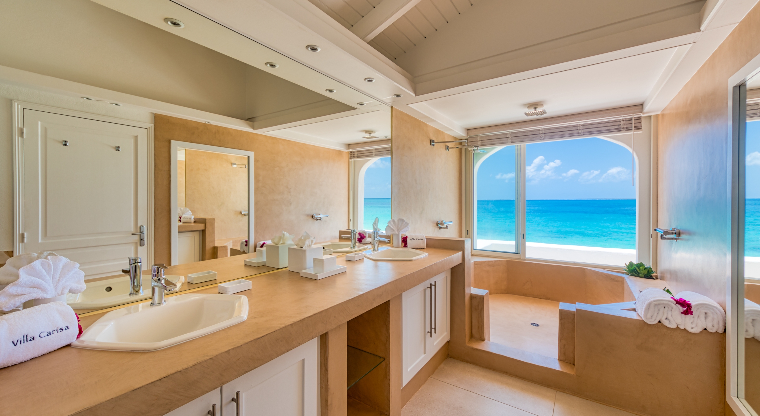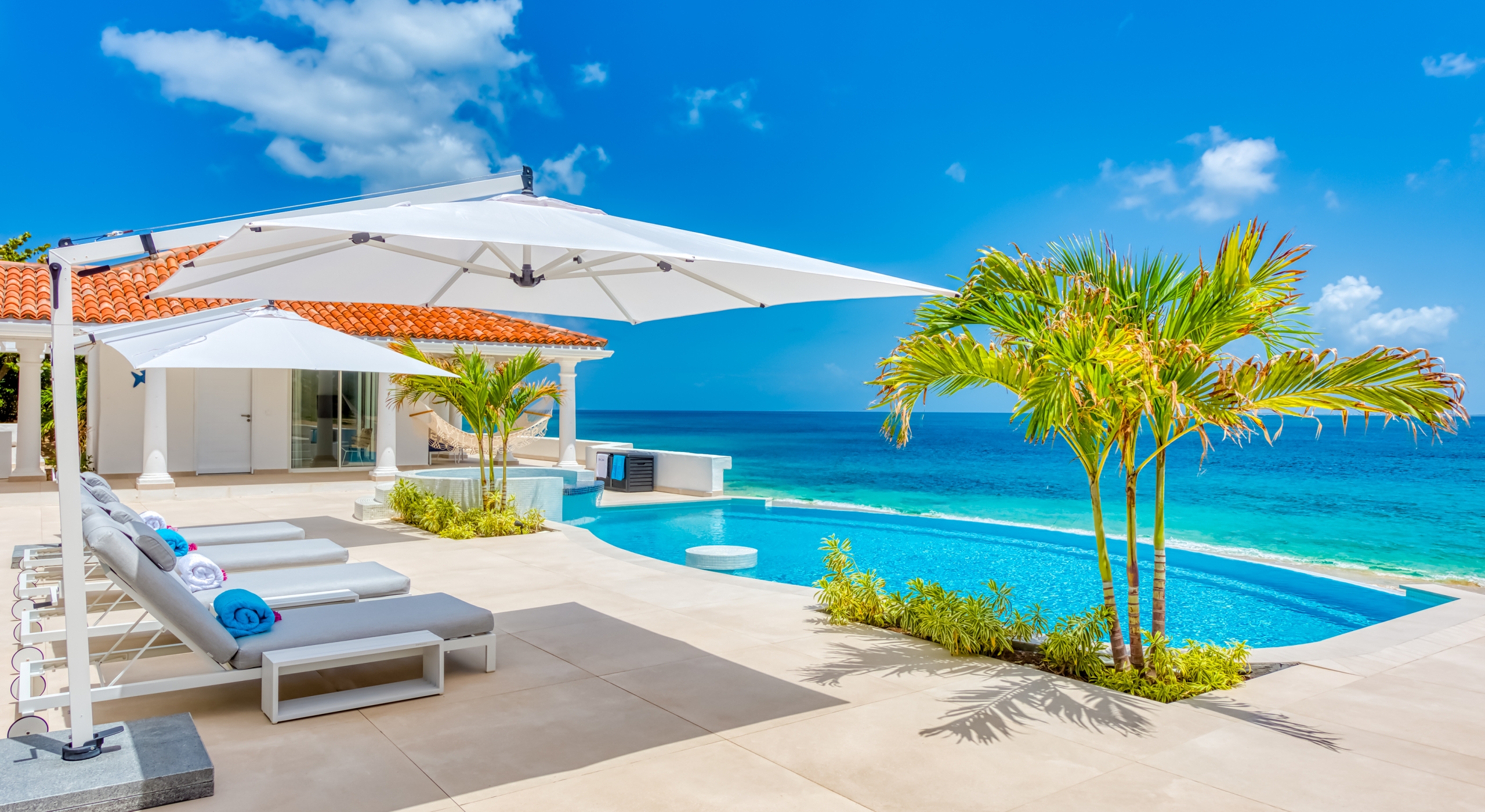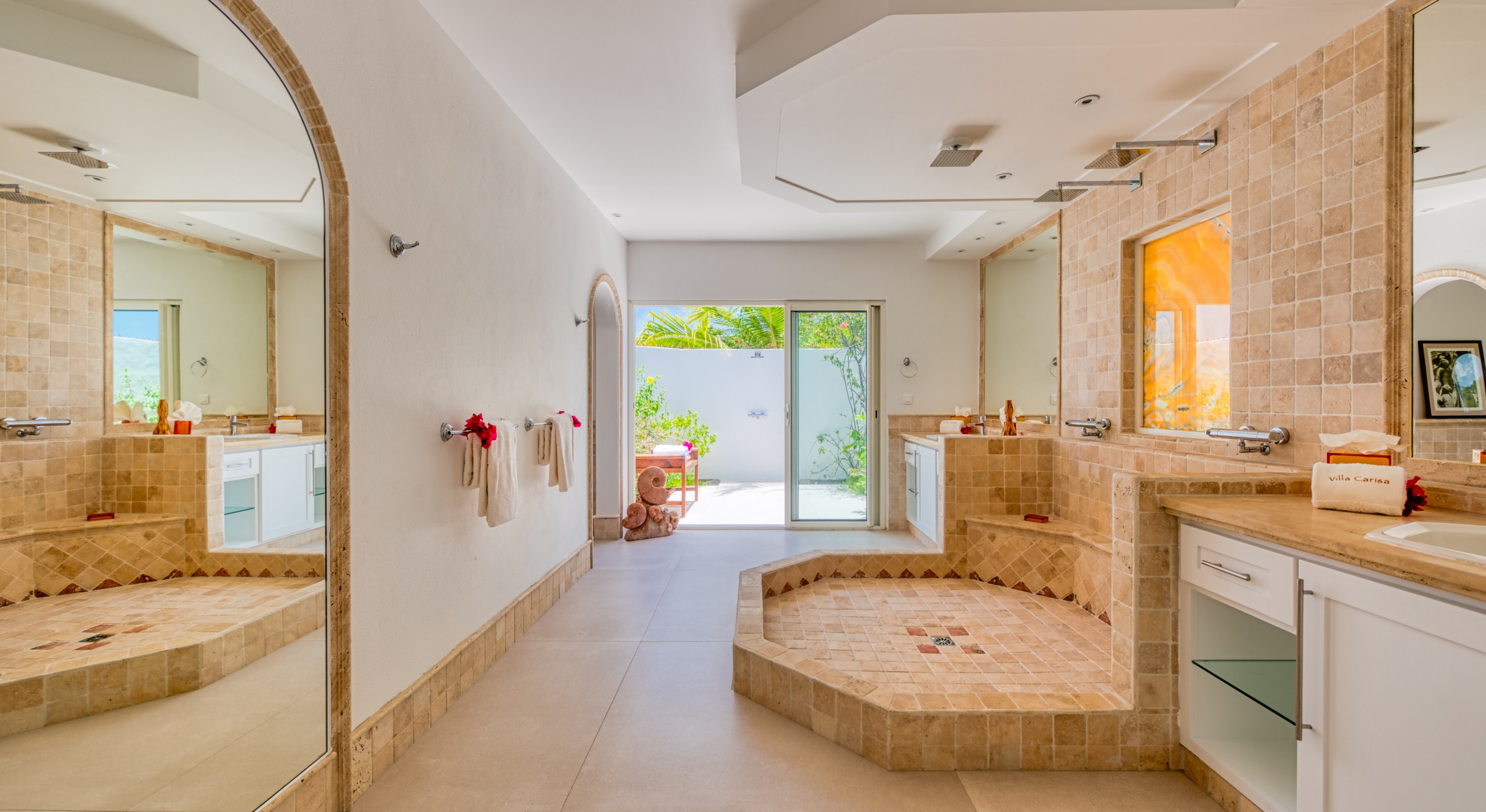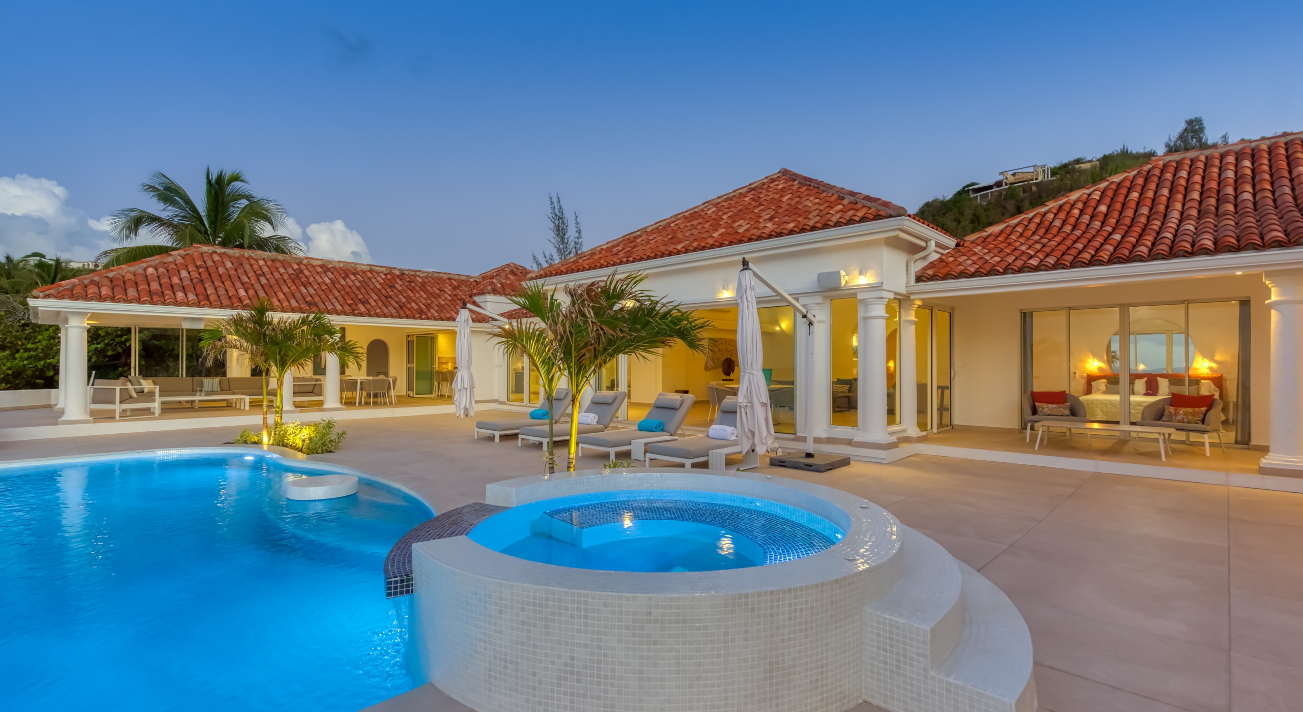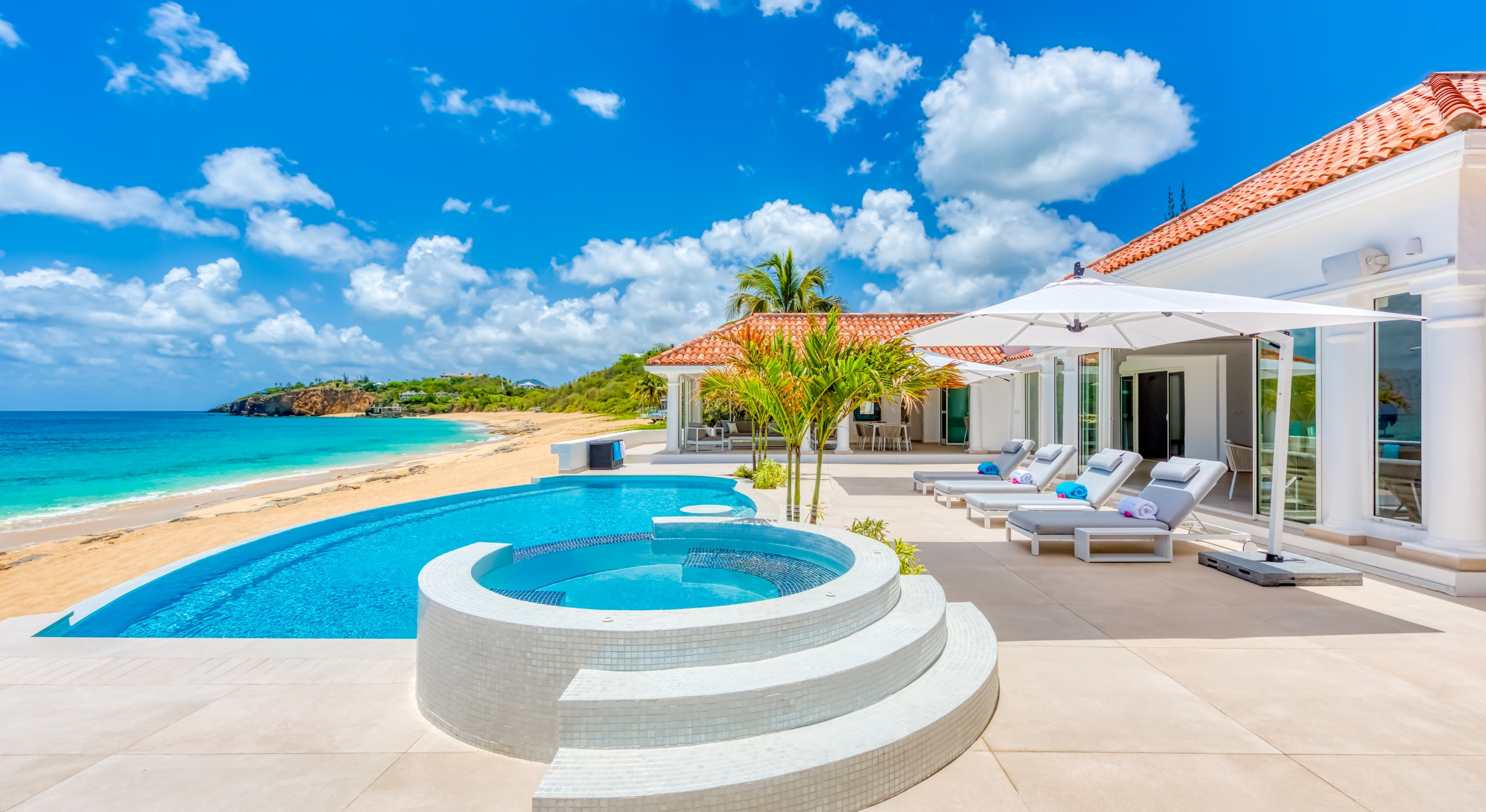 Located directly on Baie Rouge Beach, this Saint Martin villa rental is a gorgeous mix of contemporary styling and Caribbean relaxation. Carisa is a fully air-conditioned villa, and has a separate media room with a 60 inch Plasma TV and top quality THX audio system both for watching DVDs (you'll swear you are in the theatre) or listening to CDs. You can play music out to the open Gazebo, the pool area, or even listen to it in the raised heated Jacuzzi.