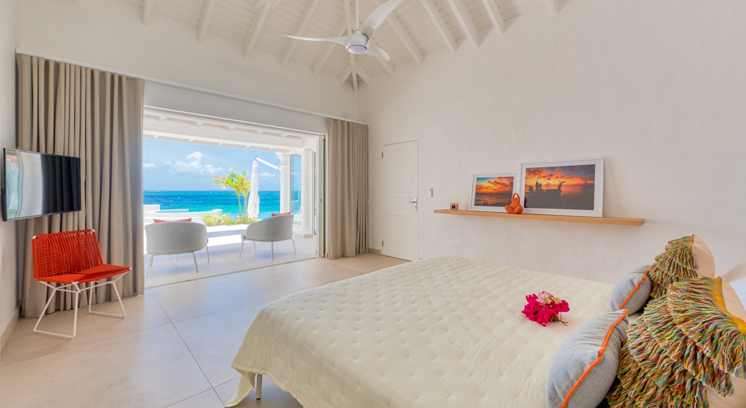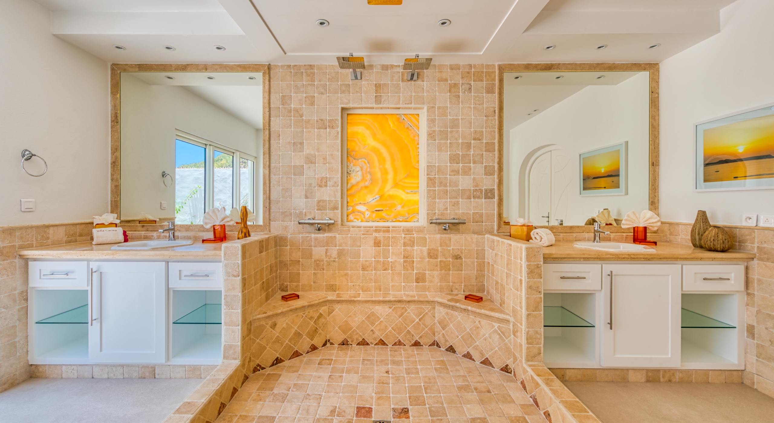 Bedrooms feature high-end plush mattresses, triple shower-heads, Popup plasma TVs, separate DVD players, and finally remote control roman shades on the windows. This means, you press a button, and the drapes go up and the view of the ocean comes pouring in. Can be rented as a 1 or 2 bedroom villa.