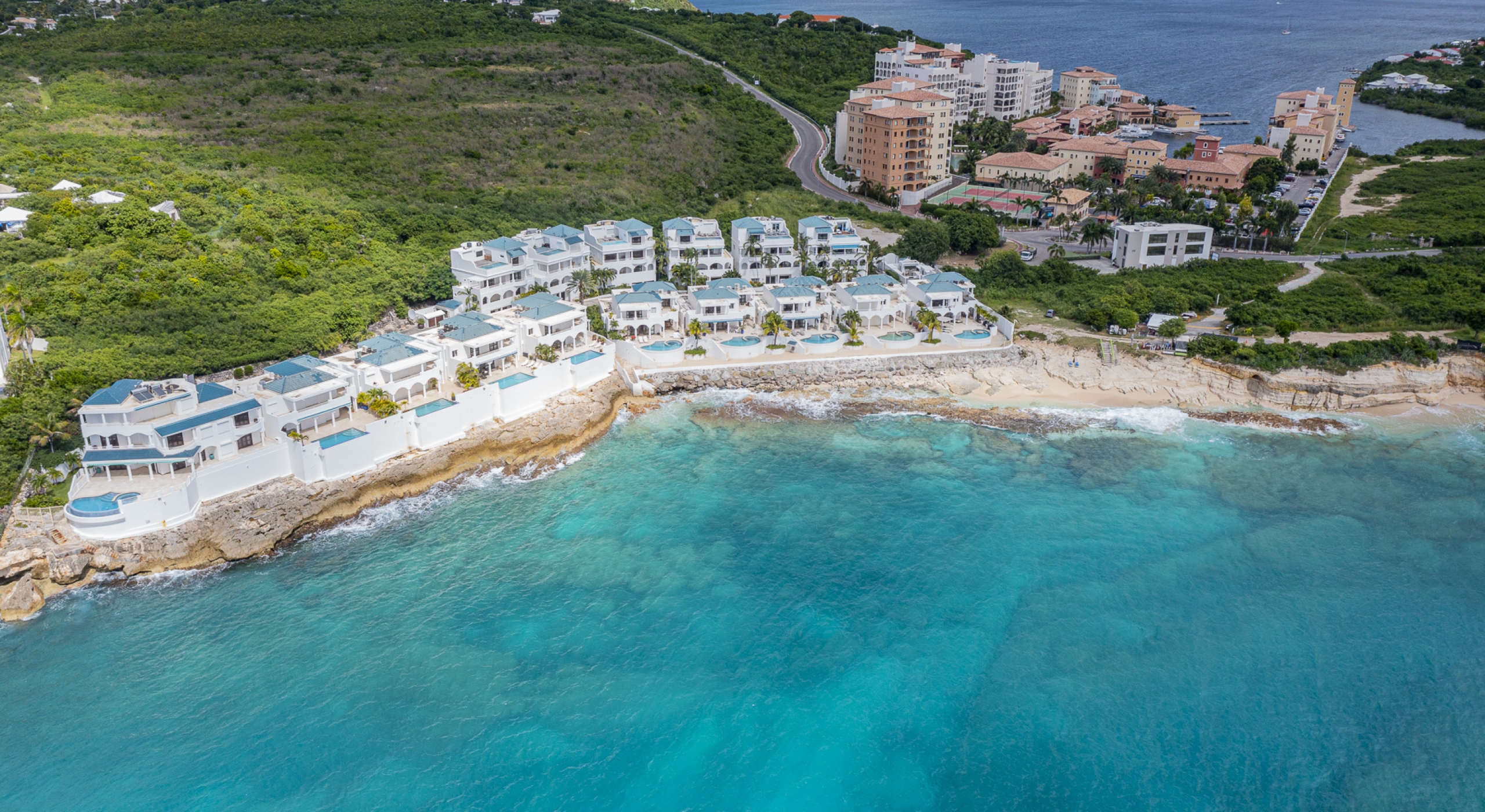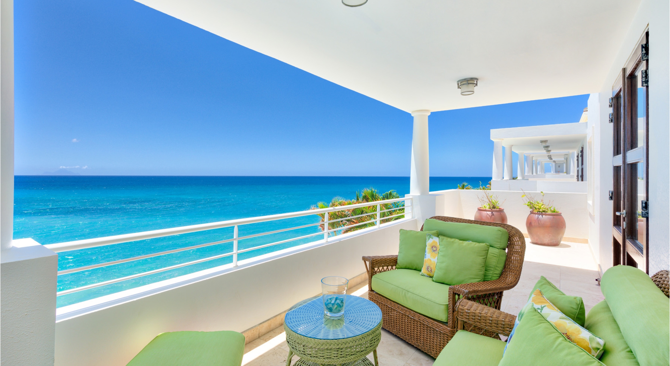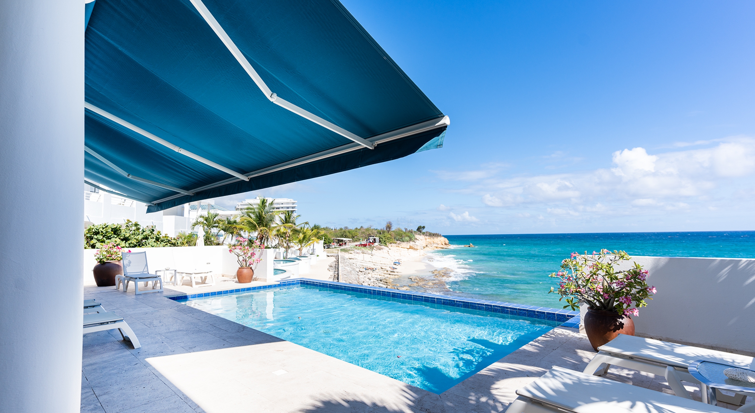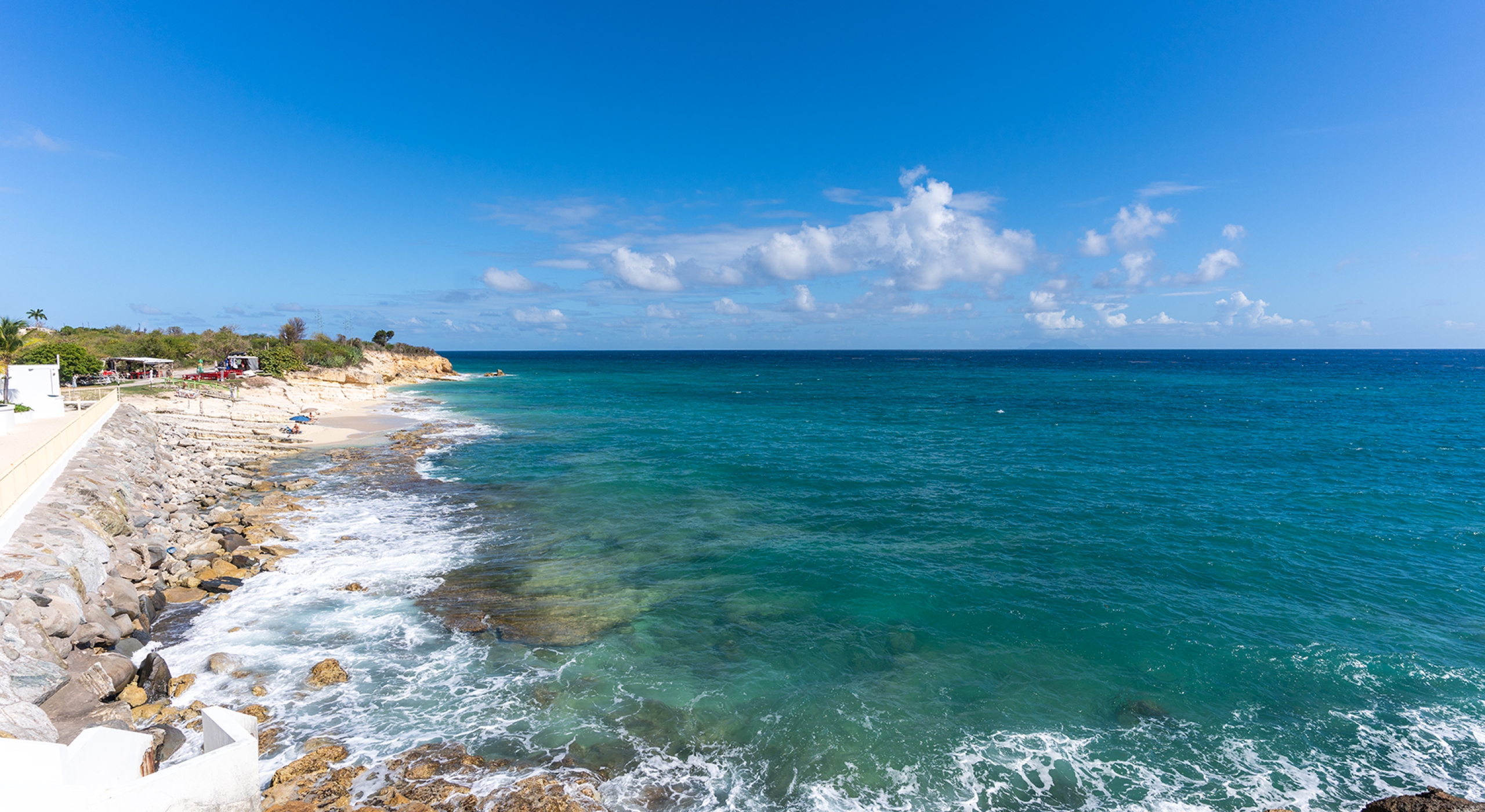 Etoile de Mer is located on the edge of the Caribbean Sea in a residence known a Shore Pointe. You get the best of both worlds when staying at Etoile de Mer as you are beachfront and walking distance to Porto Cupecoy which has a beautiful marina with stores and restaurants. The entrance to Etoile de Mer leads through an elegant door that opens to the living area and kitchen. As you enter you are met by the views of the Caribbean Sea and Cupecoy Beach. The interiors flow graciously through wooden glass sliding doors and right onto a spacious covered terrace and deck. The outdoor terrace is perfect for dining and lounging. Early evening you will be greeted by a beautiful sunset. Cupecoy Beach is notorious for the “green flash”. The living area features a high-end kitchen with luxury appliances. There is also an indoor dining area in case you want to eat inside. The living area of Etoile de Mer is conveniently located on the first floor right in front of the ocean view. The four bedrooms have king-size beds, sea views, and en suite bathrooms. Each en suite bathroom are spa style with walk-in showers. One bathroom has a large bathtub. Etoile de Mer is 10 minutes from the airport and 15 minutes from Marigot, the French side capital. Cupecoy is a very convenient region as it is central and on the border of the Dutch and French sides.