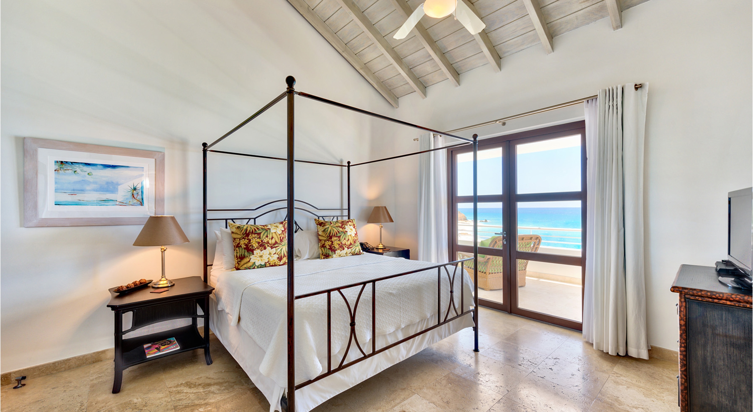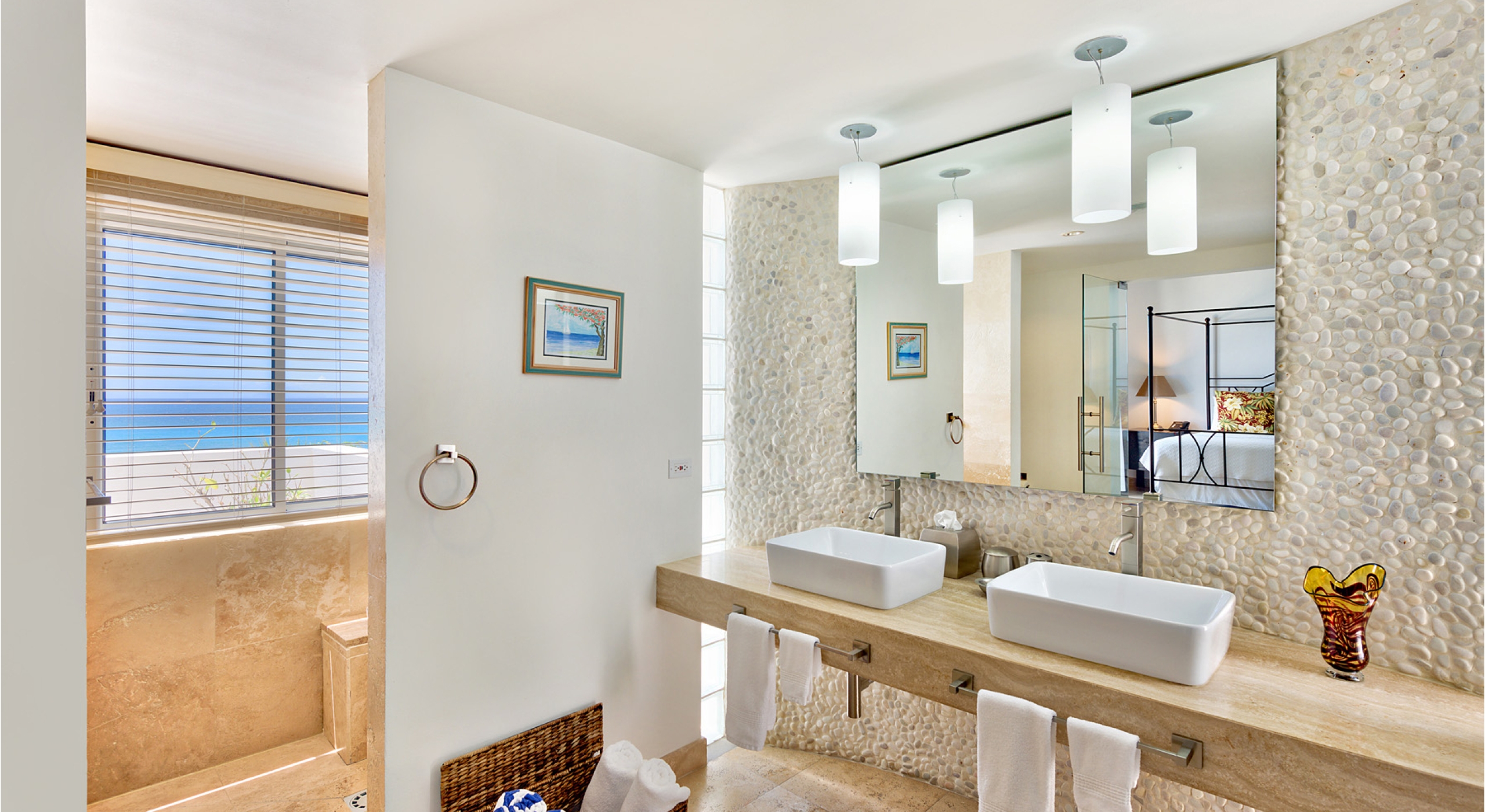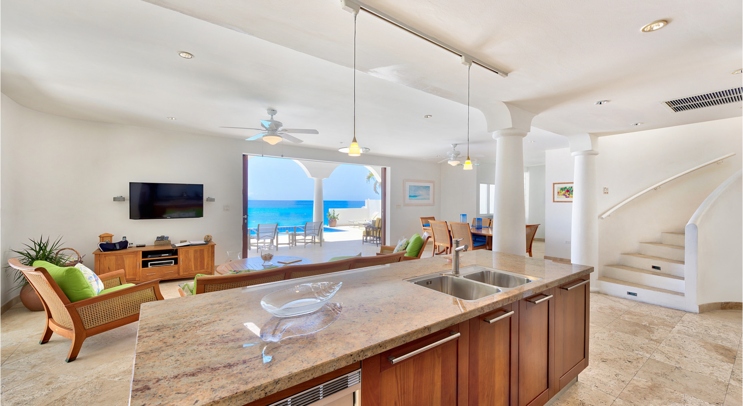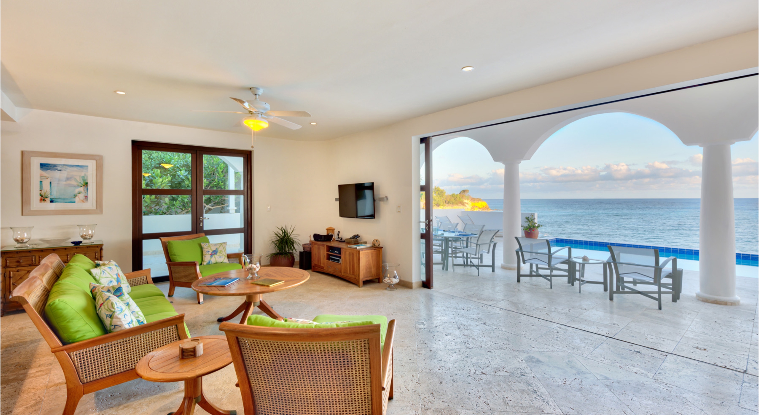 Etoile de Mer is located on the edge of the Caribbean Sea in a residence known a Shore Pointe. You get the best of both worlds when staying at Etoile de Mer as you are beachfront and walking distance to Porto Cupecoy which has a beautiful marina with stores and restaurants. The entrance to Etoile de Mer leads through an elegant door that opens to the living area and kitchen. As you enter you are met by the views of the Caribbean Sea and Cupecoy Beach. The interiors flow graciously through wooden glass sliding doors and right onto a spacious covered terrace and deck. The outdoor terrace is perfect for dining and lounging. Early evening you will be greeted by a beautiful sunset. Cupecoy Beach is notorious for the “green flash”. The living area features a high-end kitchen with luxury appliances. There is also an indoor dining area in case you want to eat inside. The living area of Etoile de Mer is conveniently located on the first floor right in front of the ocean view. The four bedrooms have king-size beds, sea views, and en suite bathrooms. Each en suite bathroom are spa style with walk-in showers. One bathroom has a large bathtub. Etoile de Mer is 10 minutes from the airport and 15 minutes from Marigot, the French side capital. Cupecoy is a very convenient region as it is central and on the border of the Dutch and French sides.