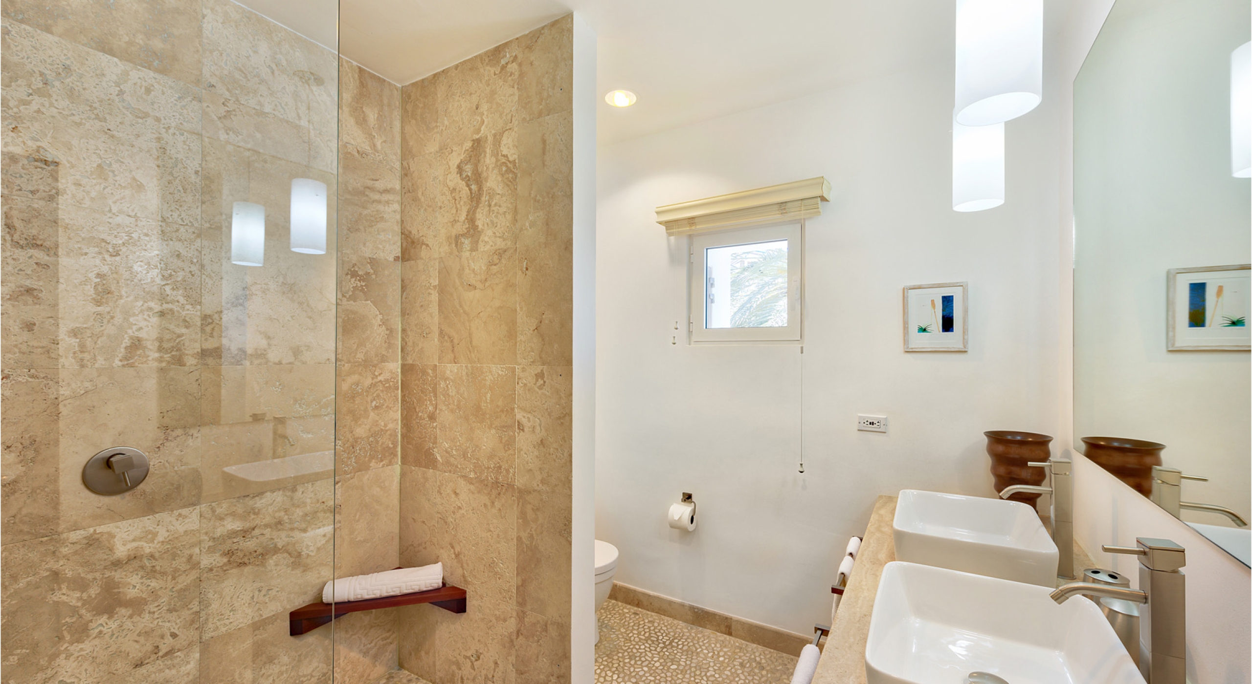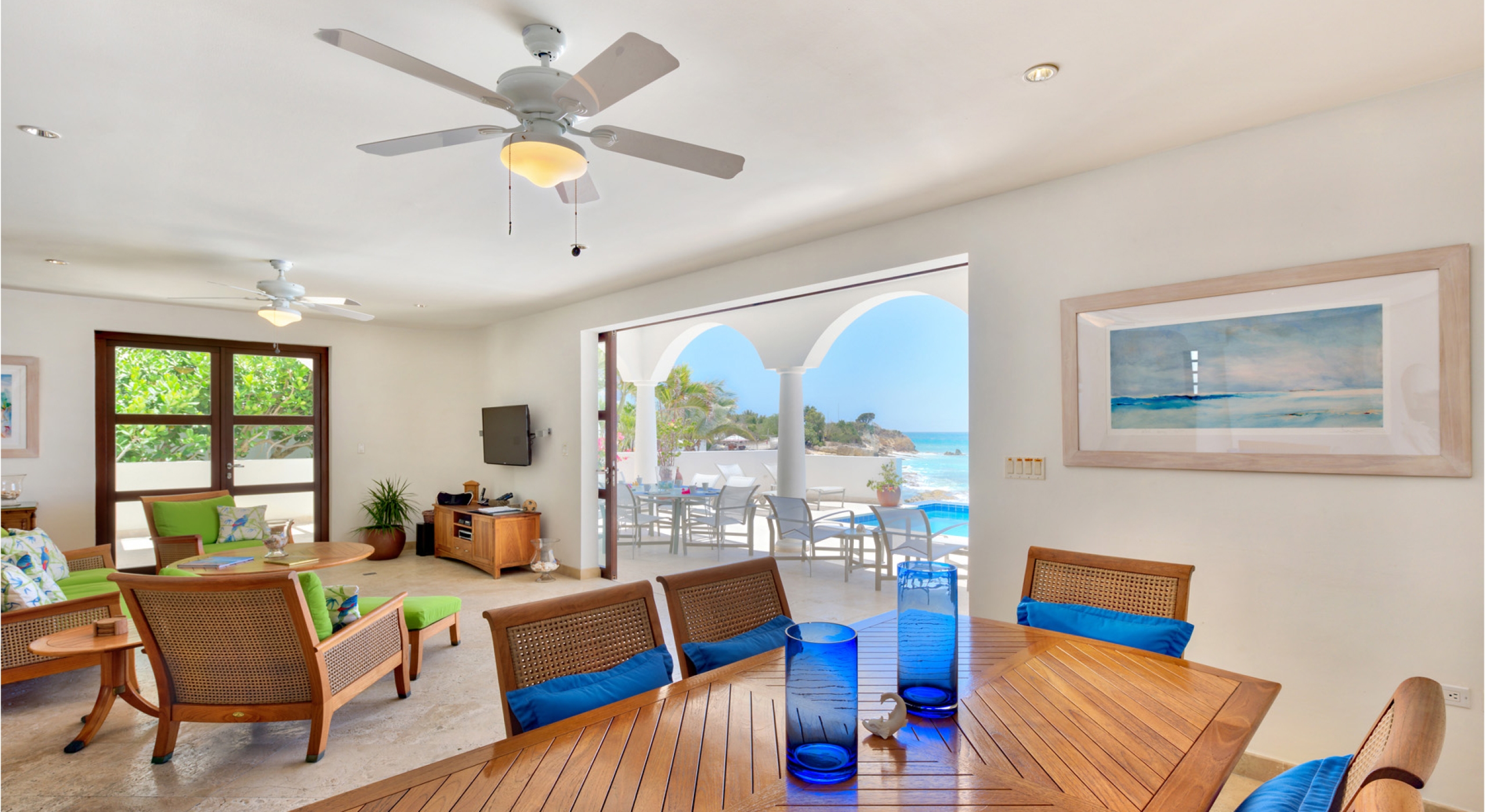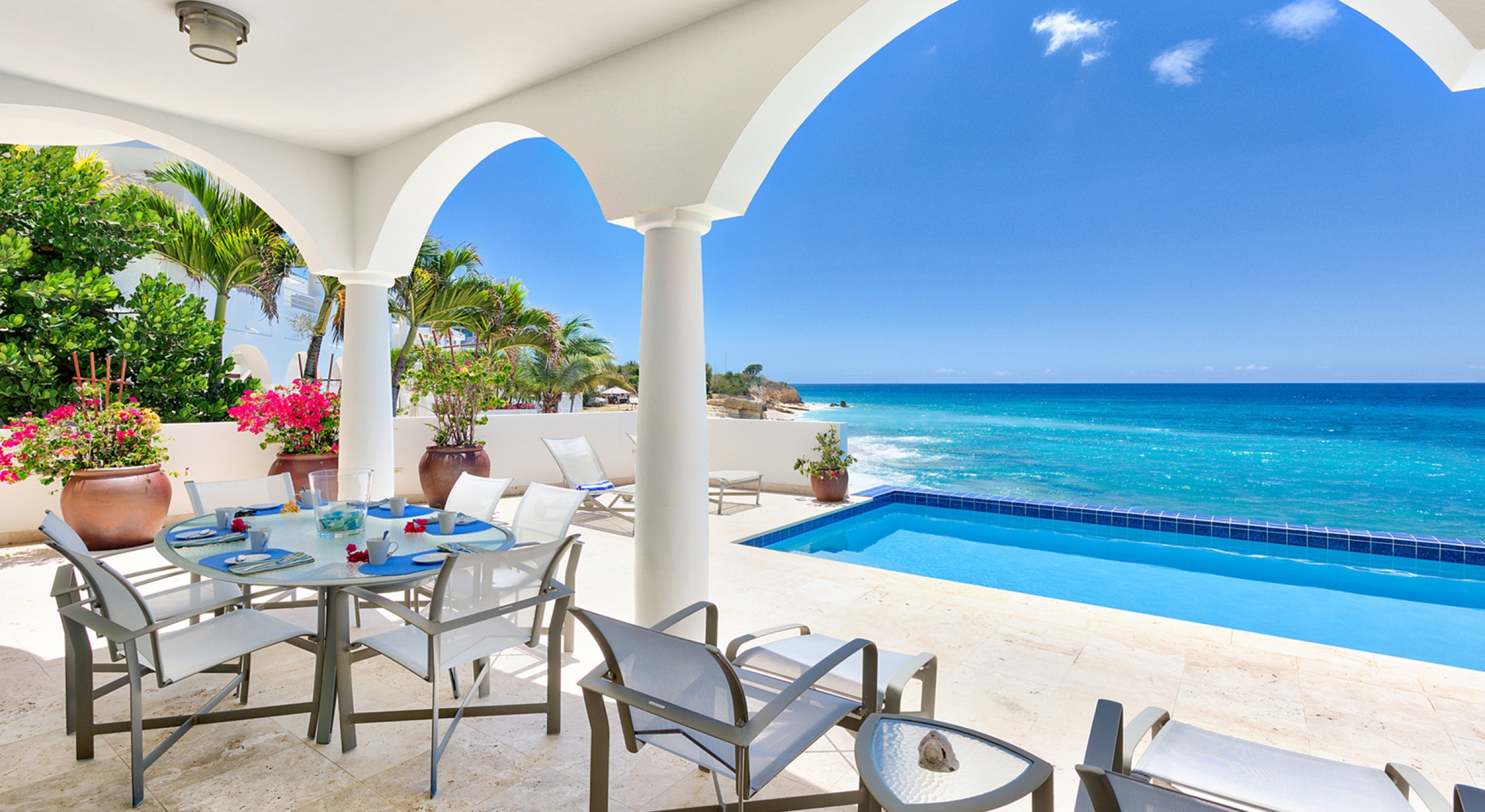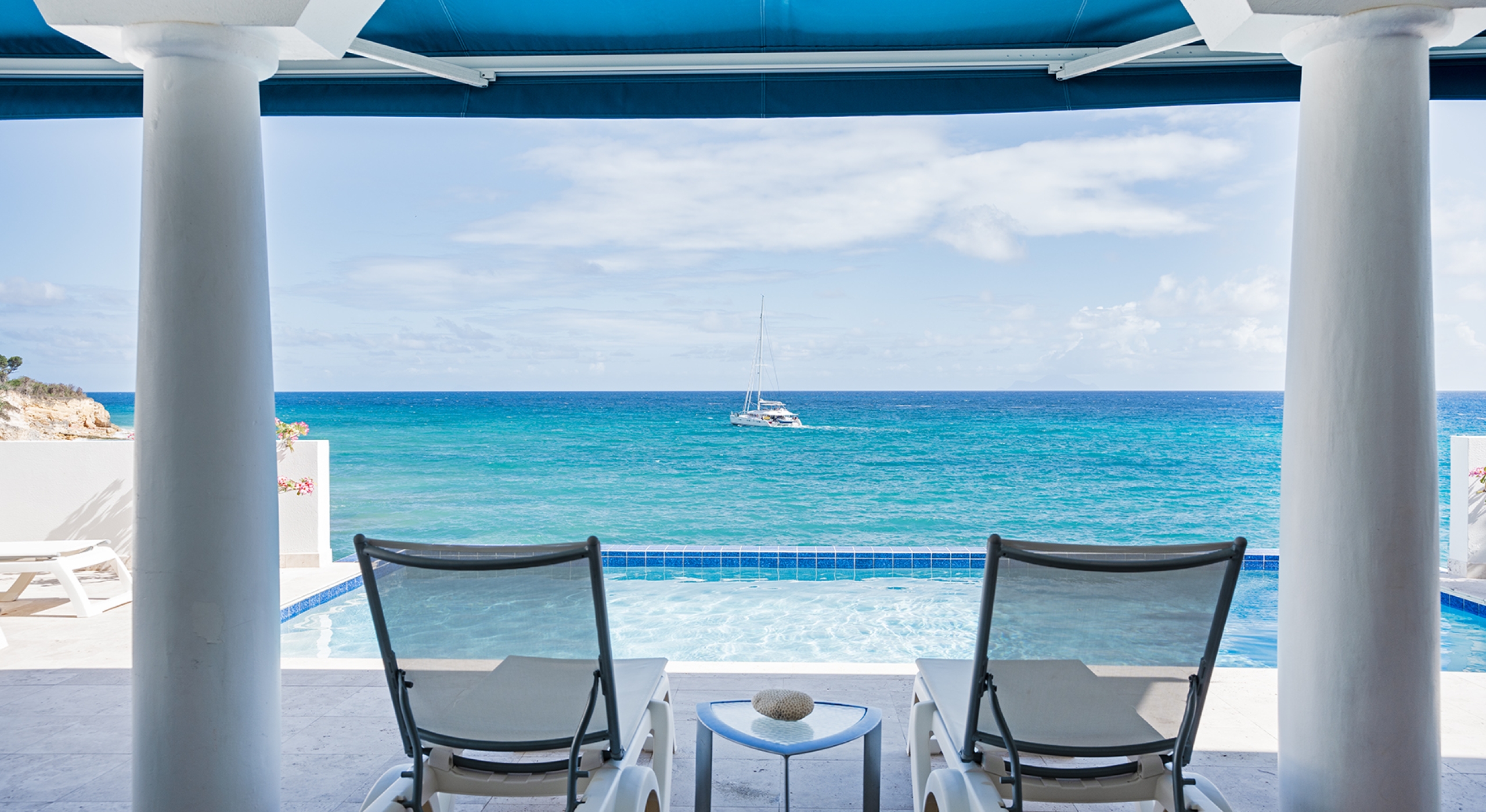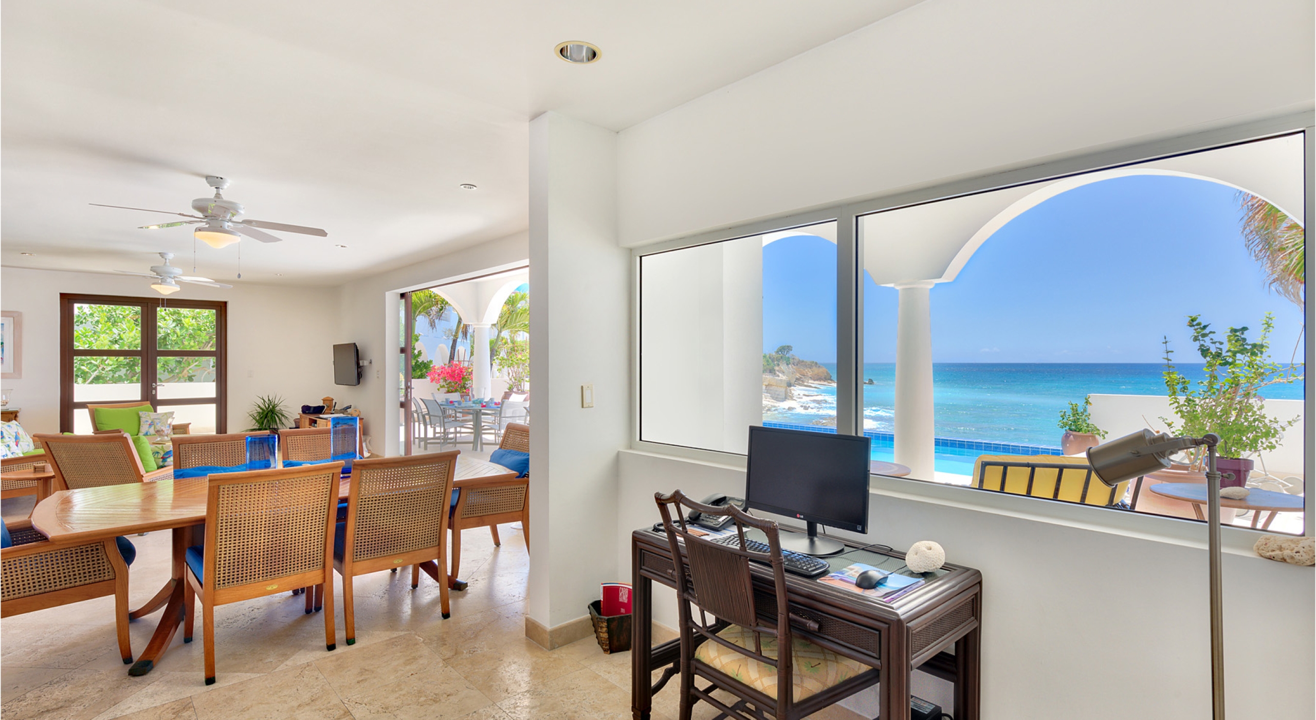 Etoile de Mer is located on the edge of the Caribbean Sea in a residence known a Shore Pointe. You get the best of both worlds when staying at Etoile de Mer as you are beachfront and walking distance to Porto Cupecoy which has a beautiful marina with stores and restaurants. The entrance to Etoile de Mer leads through an elegant door that opens to the living area and kitchen. As you enter you are met by the views of the Caribbean Sea and Cupecoy Beach. The interiors flow graciously through wooden glass sliding doors and right onto a spacious covered terrace and deck. The outdoor terrace is perfect for dining and lounging. Early evening you will be greeted by a beautiful sunset. Cupecoy Beach is notorious for the “green flash”. The living area features a high-end kitchen with luxury appliances. There is also an indoor dining area in case you want to eat inside. The living area of Etoile de Mer is conveniently located on the first floor right in front of the ocean view. The four bedrooms have king-size beds, sea views, and en suite bathrooms. Each en suite bathroom are spa style with walk-in showers. One bathroom has a large bathtub. Etoile de Mer is 10 minutes from the airport and 15 minutes from Marigot, the French side capital. Cupecoy is a very convenient region as it is central and on the border of the Dutch and French sides.