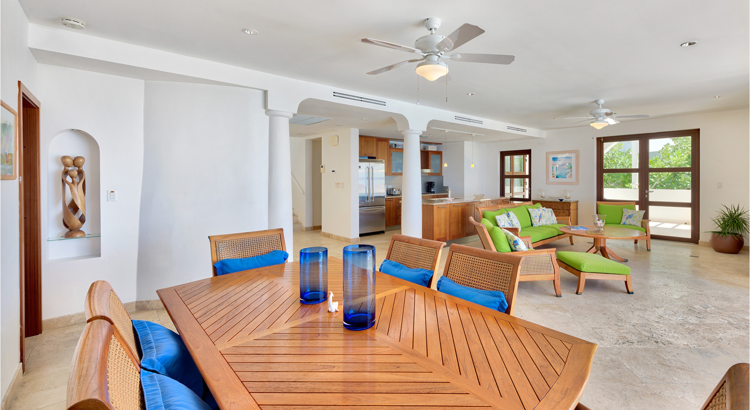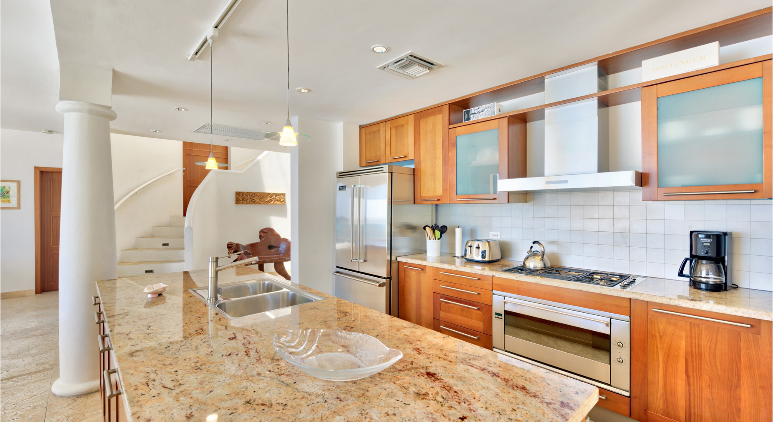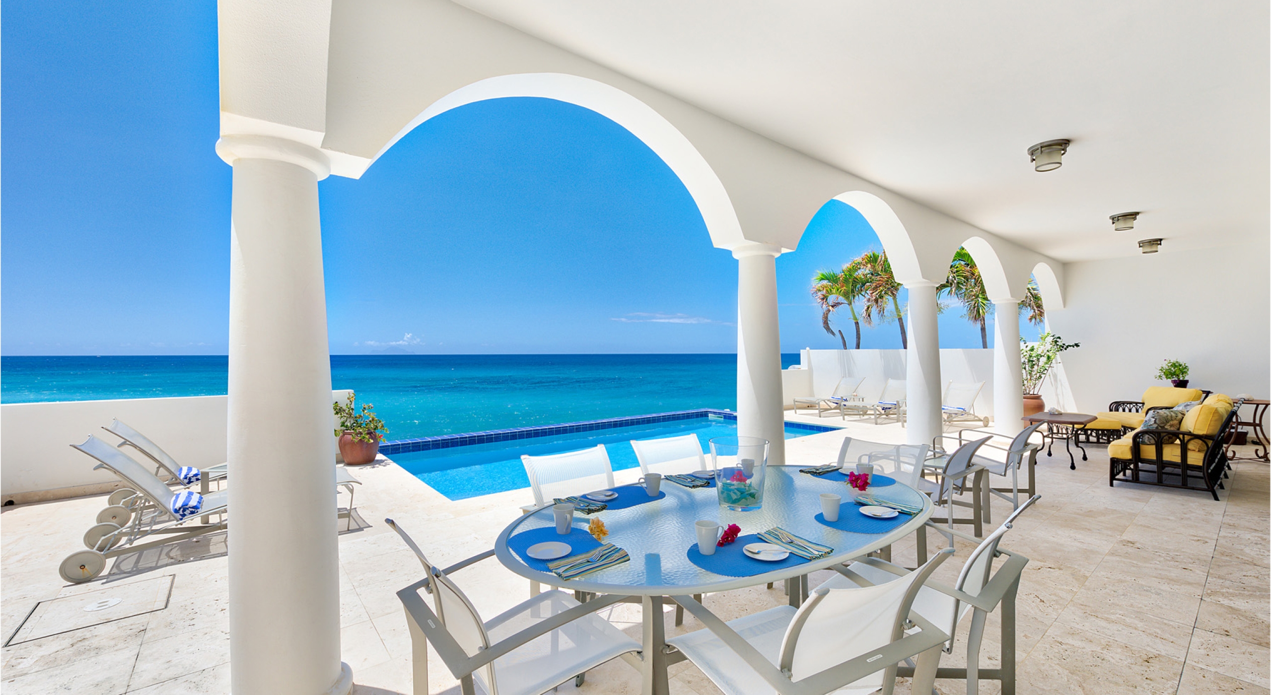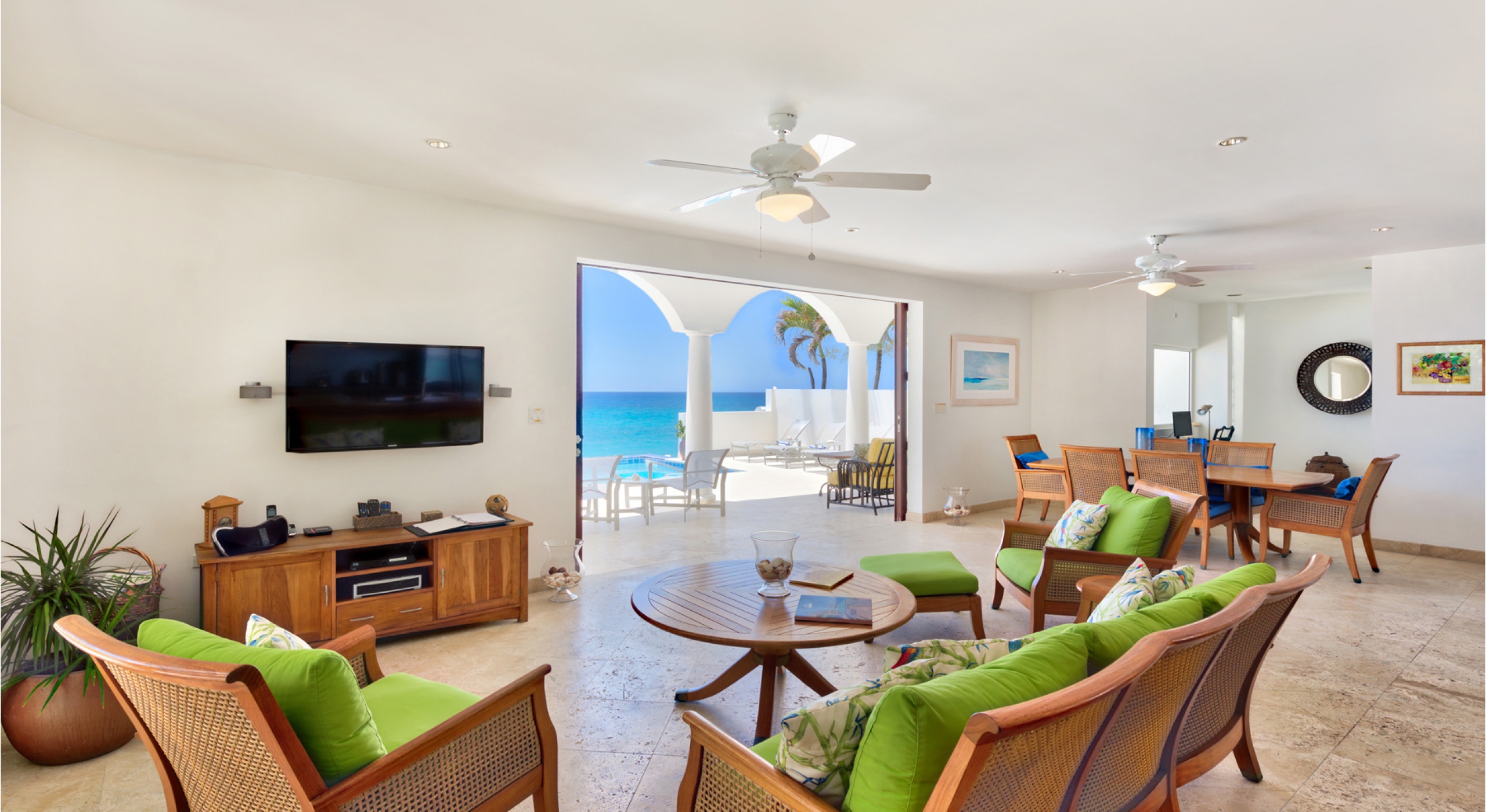 Etoile de Mer is located on the edge of the Caribbean Sea in a residence known a Shore Pointe. You get the best of both worlds when staying at Etoile de Mer as you are beachfront and walking distance to Porto Cupecoy which has a beautiful marina with stores and restaurants. The entrance to Etoile de Mer leads through an elegant door that opens to the living area and kitchen. As you enter you are met by the views of the Caribbean Sea and Cupecoy Beach. The interiors flow graciously through wooden glass sliding doors and right onto a spacious covered terrace and deck. The outdoor terrace is perfect for dining and lounging. Early evening you will be greeted by a beautiful sunset. Cupecoy Beach is notorious for the “green flash”. The living area features a high-end kitchen with luxury appliances. There is also an indoor dining area in case you want to eat inside. The living area of Etoile de Mer is conveniently located on the first floor right in front of the ocean view. The four bedrooms have king-size beds, sea views, and en suite bathrooms. Each en suite bathroom are spa style with walk-in showers. One bathroom has a large bathtub. Etoile de Mer is 10 minutes from the airport and 15 minutes from Marigot, the French side capital. Cupecoy is a very convenient region as it is central and on the border of the Dutch and French sides.