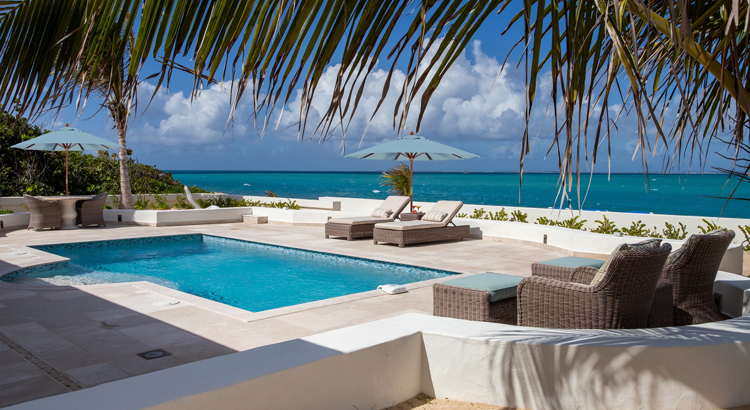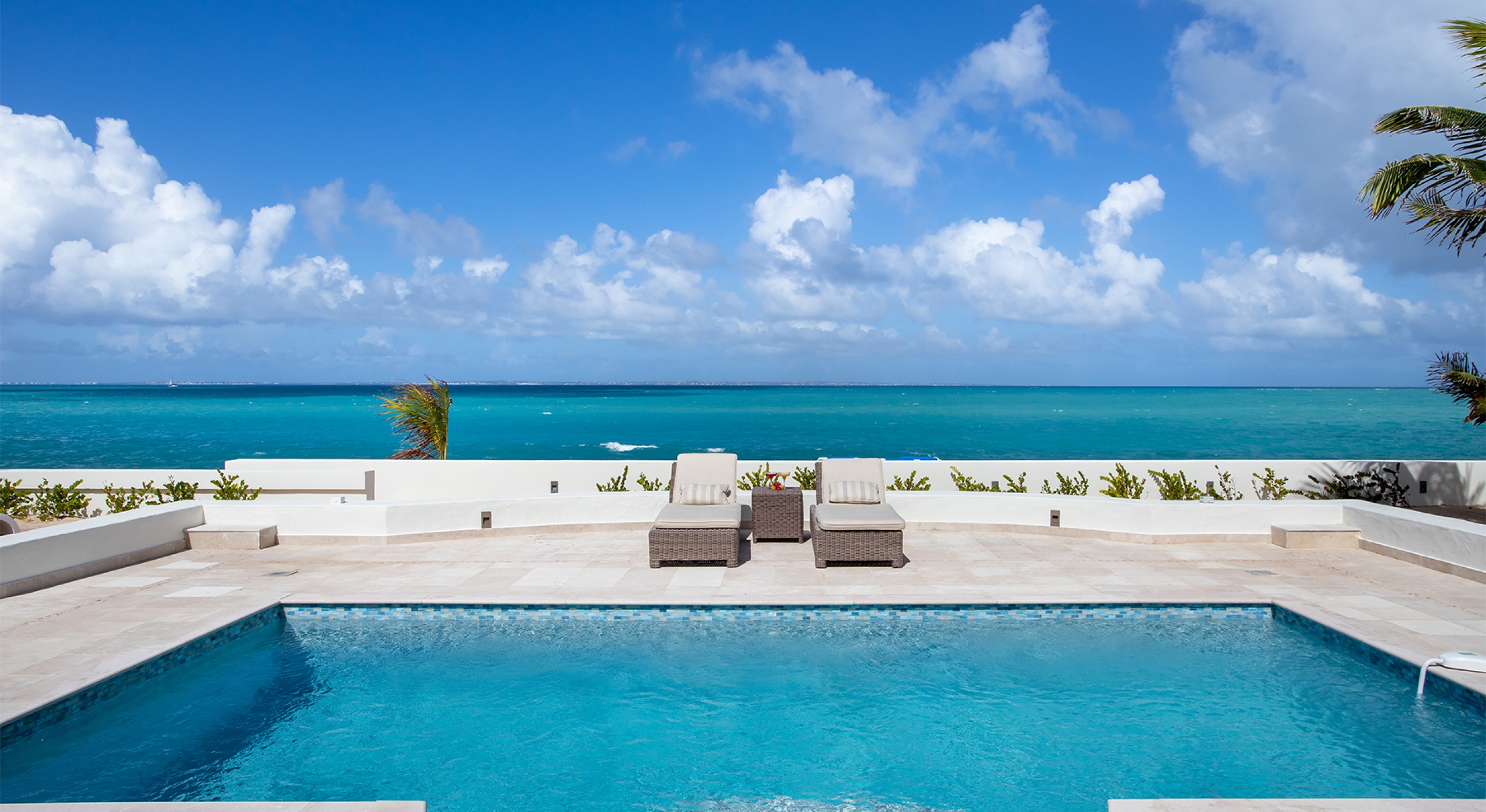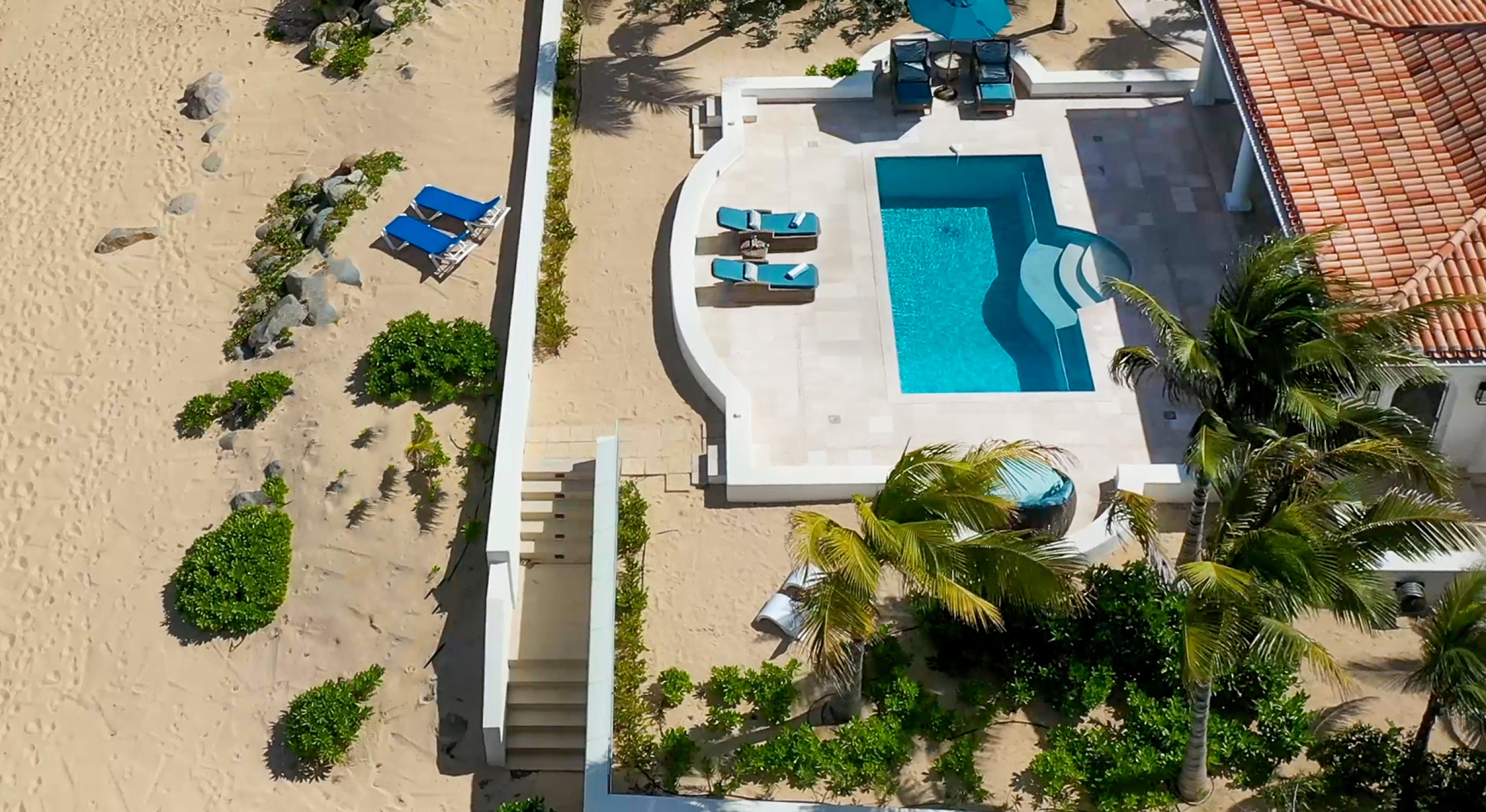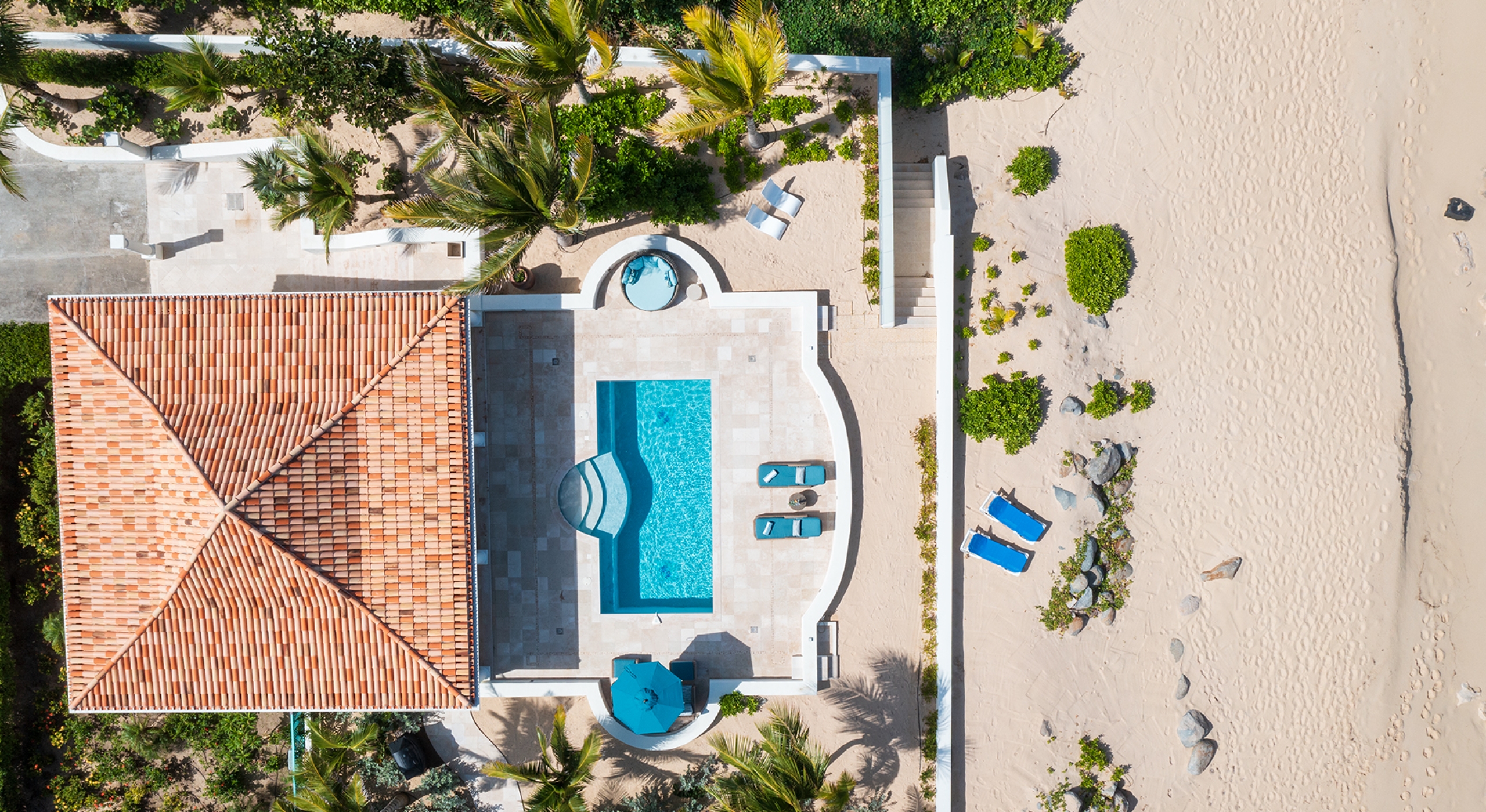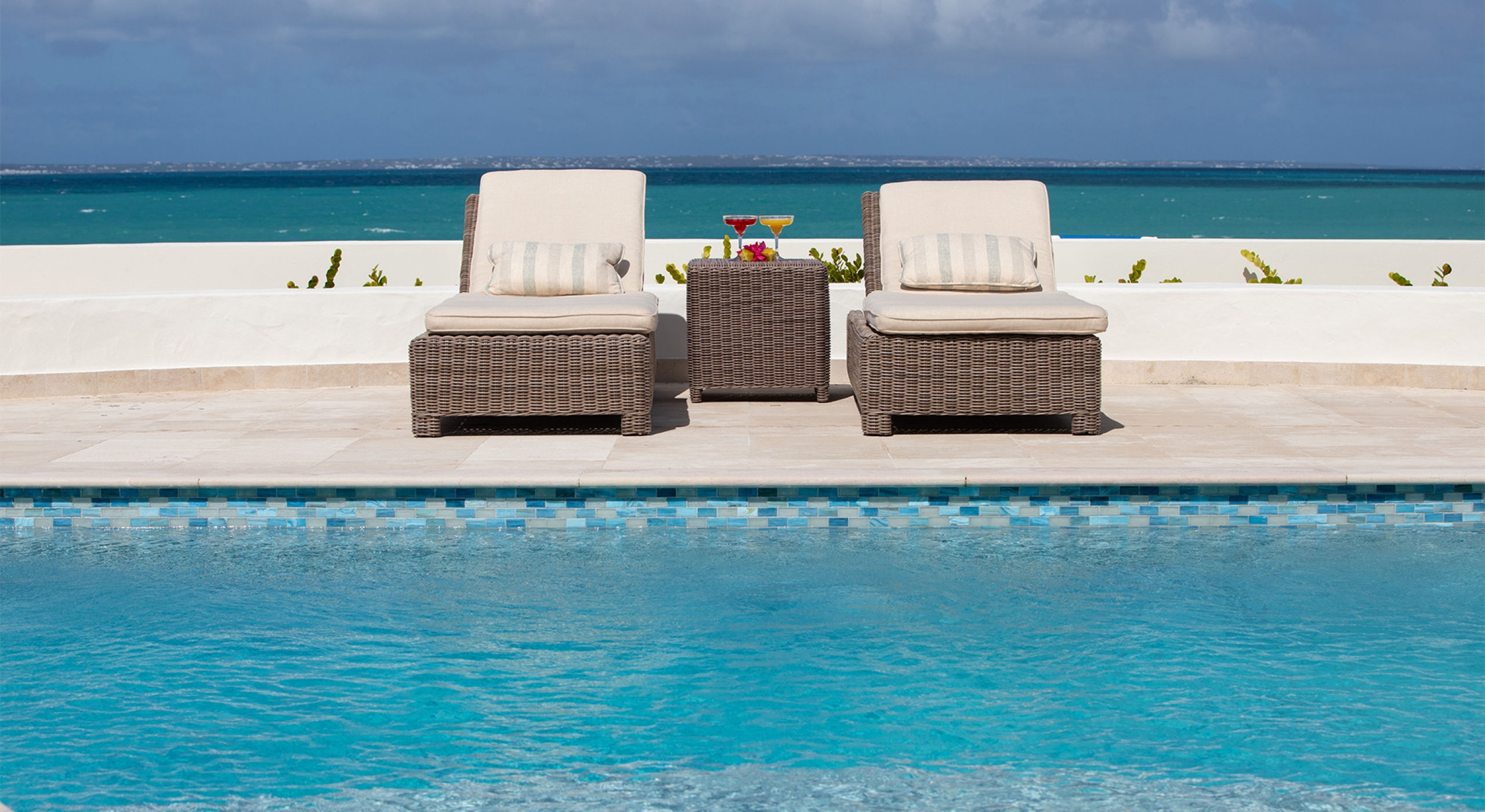 Midday – As the day warms up, you’ll be mesmerized by the everchanging blue hues in the ocean as it laps on the sandy shores just steps from the terrace. Spend the day enjoying dips in the private, refreshing mosaic glass trimmed pool or sunning on comfortable loungers either poolside on the marble terrace or on the sandy beach.