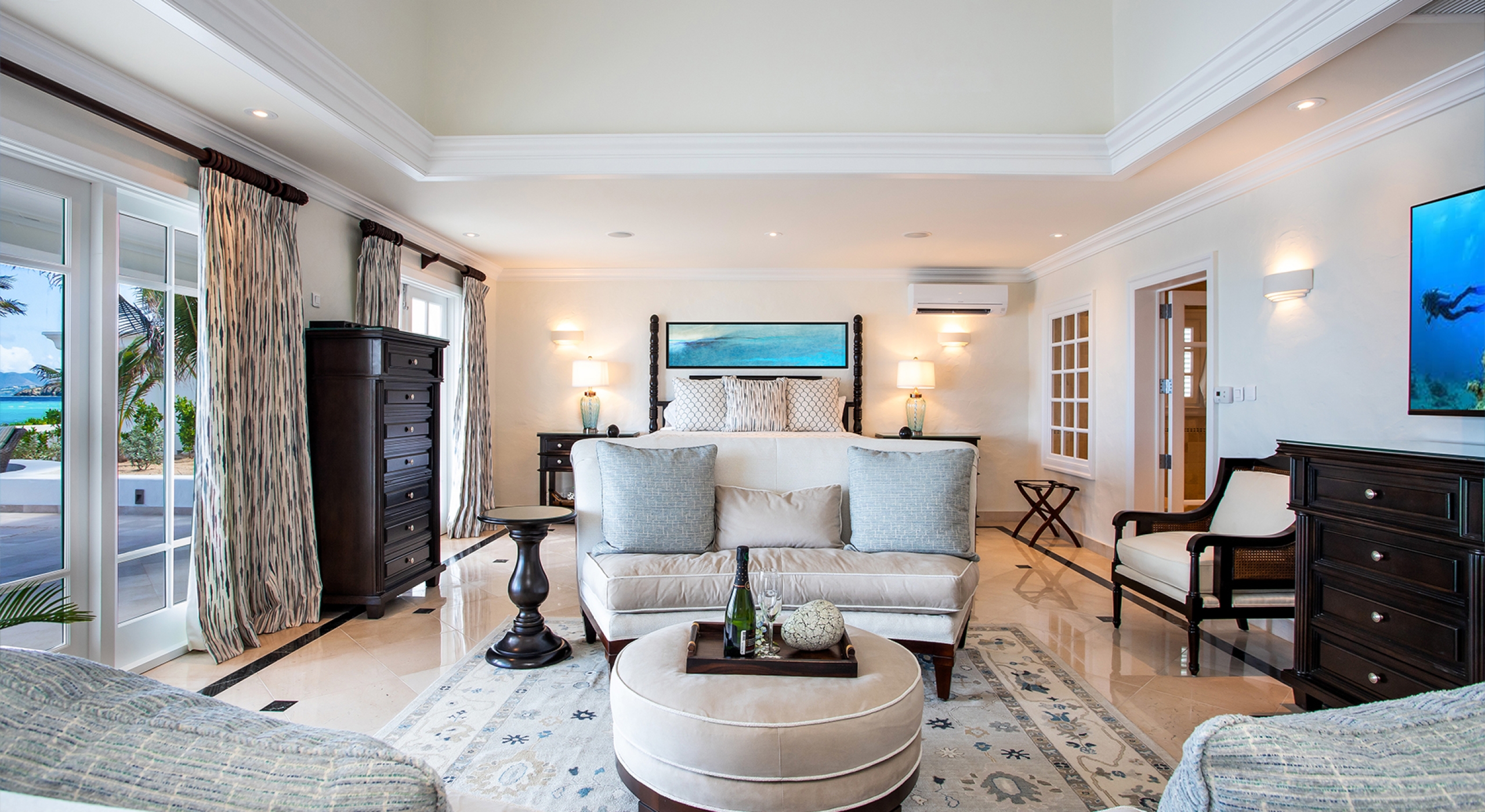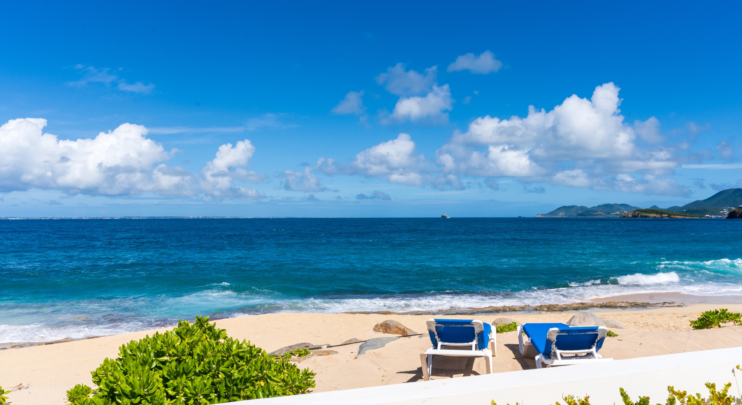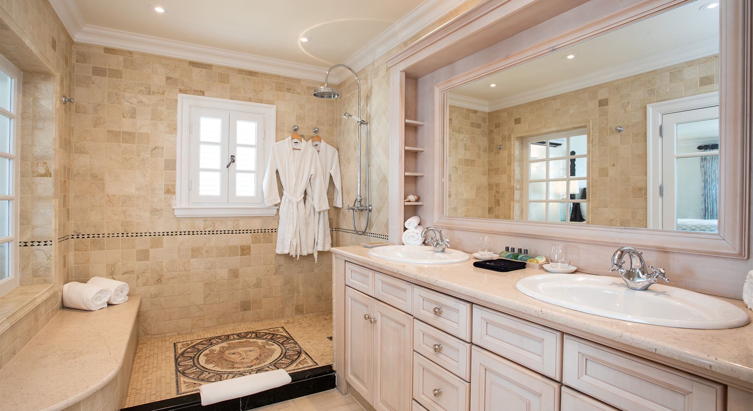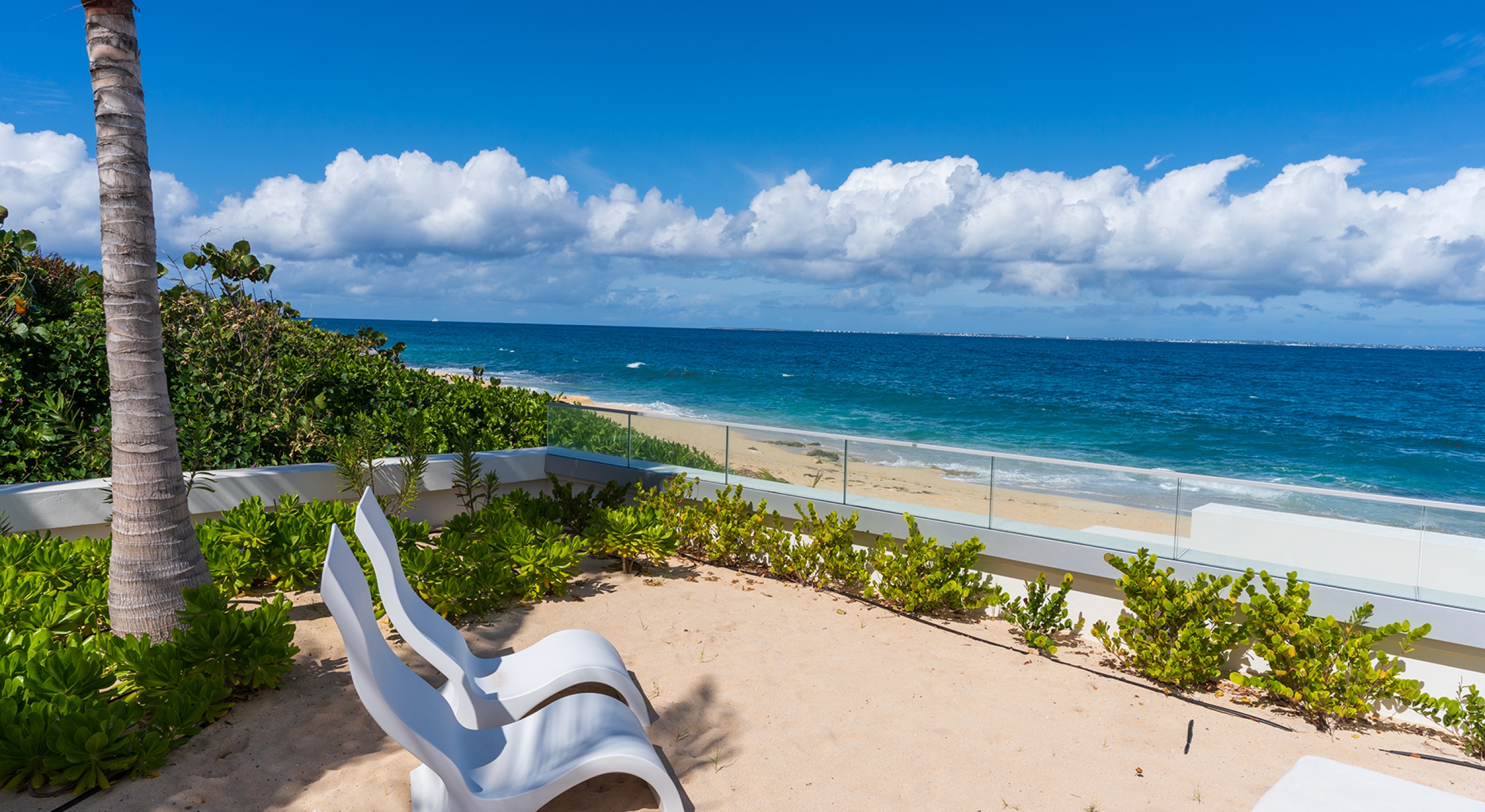 Arrival – The tropical turquoise entrance gate will open to a paved driveway surrounded by groves of palm trees and gardens of colorful, tropical flowers. A marble stairway will lead you up to the terrace where you’ll be entranced by the stunning, panoramic seascape. Here you will enter the beautifully suite-designed villa. Les Palmiers, decorated in soft tones of cream, blues and grays encompasses fully air conditioned sleeping, living and dining areas, all with spectacular ocean views.