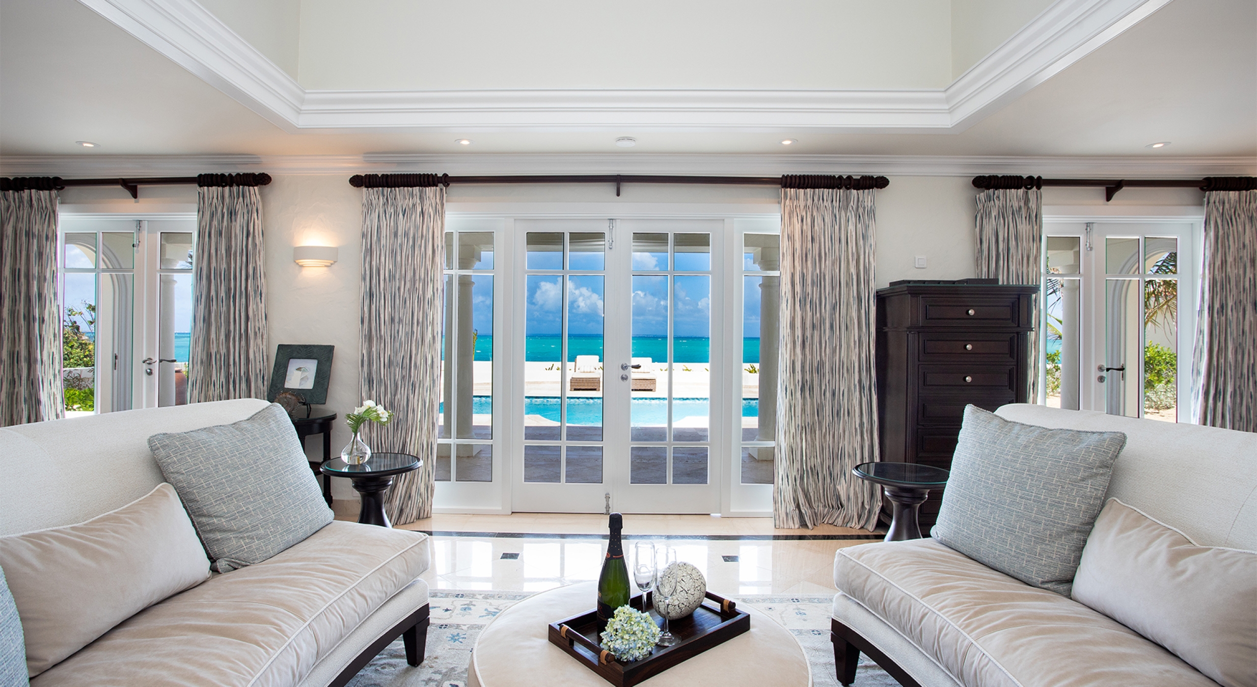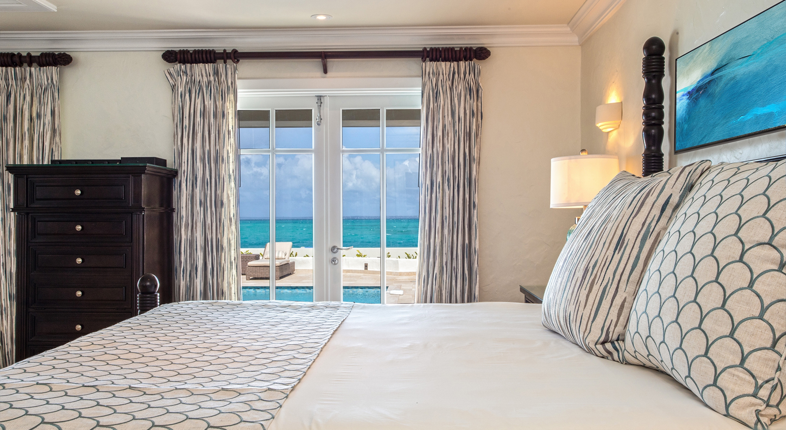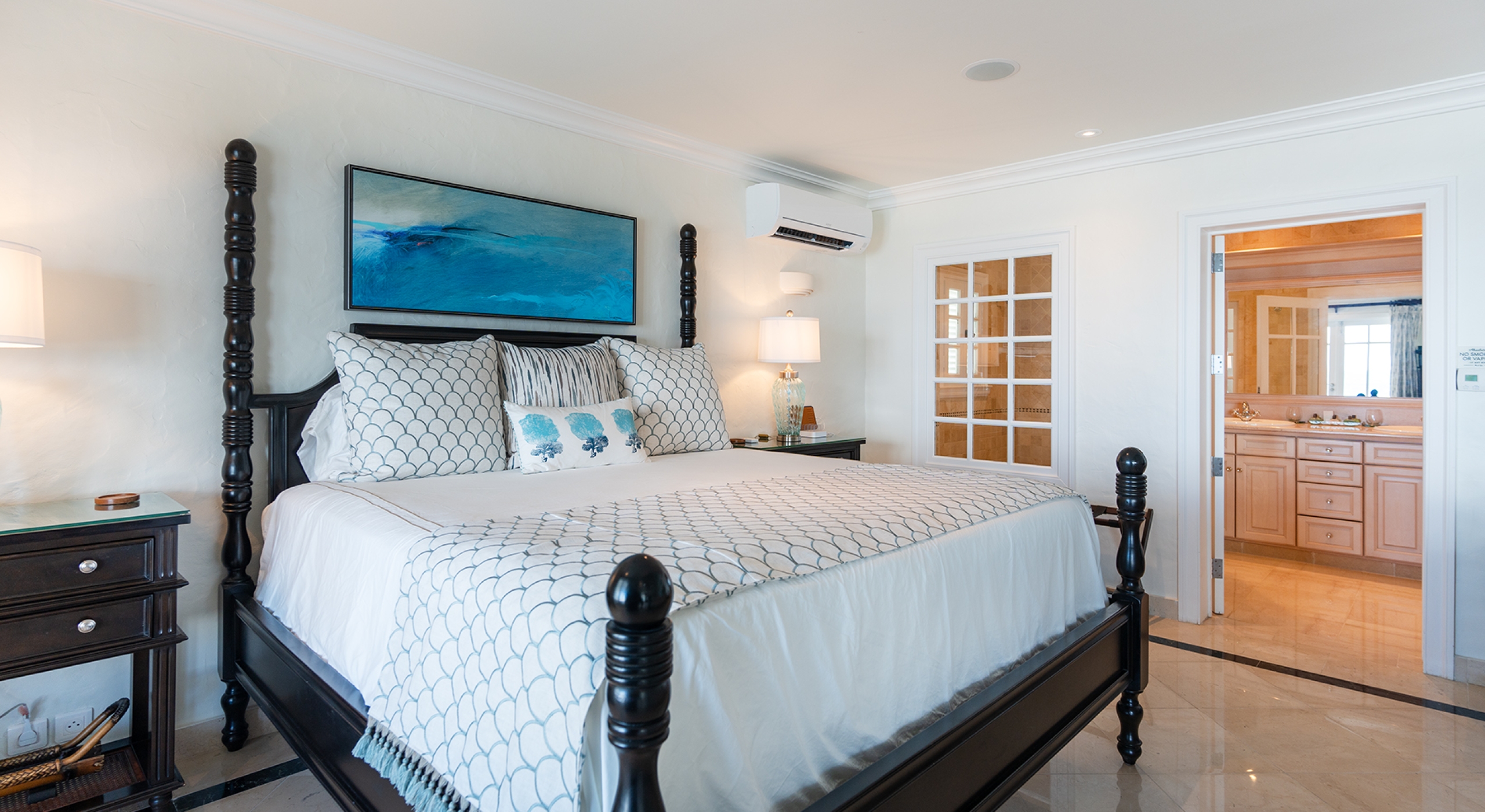 Arrival – The tropical turquoise entrance gate will open to a paved driveway surrounded by groves of palm trees and gardens of colorful, tropical flowers. A marble stairway will lead you up to the terrace where you’ll be entranced by the stunning, panoramic seascape. Here you will enter the beautifully suite-designed villa. Les Palmiers, decorated in soft tones of cream, blues and grays encompasses fully air conditioned sleeping, living and dining areas, all with spectacular ocean views.