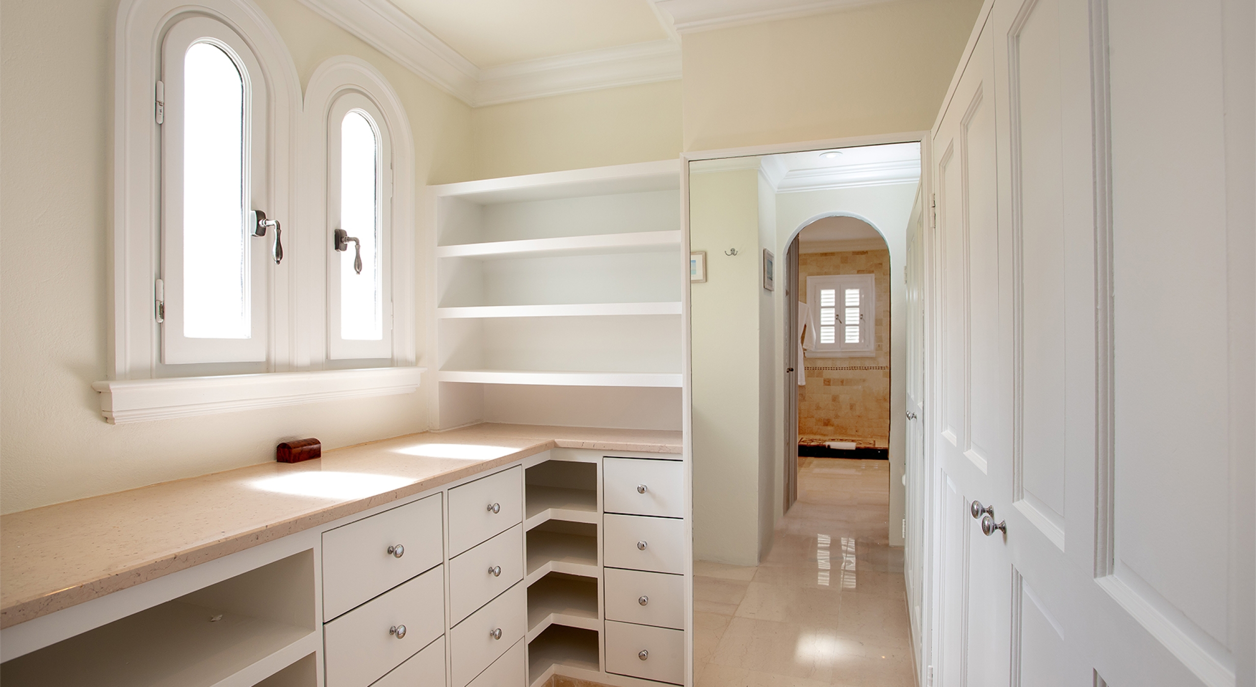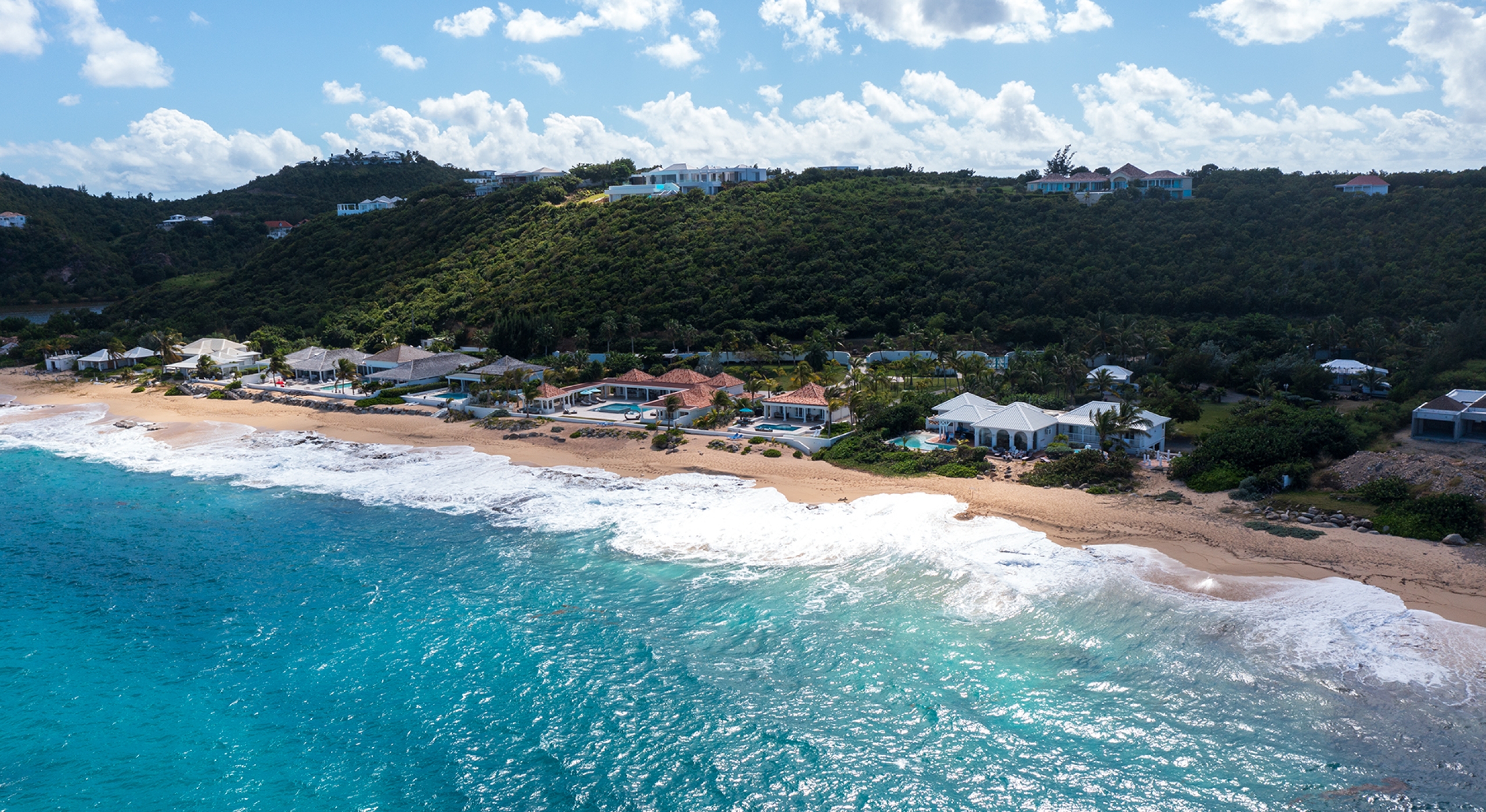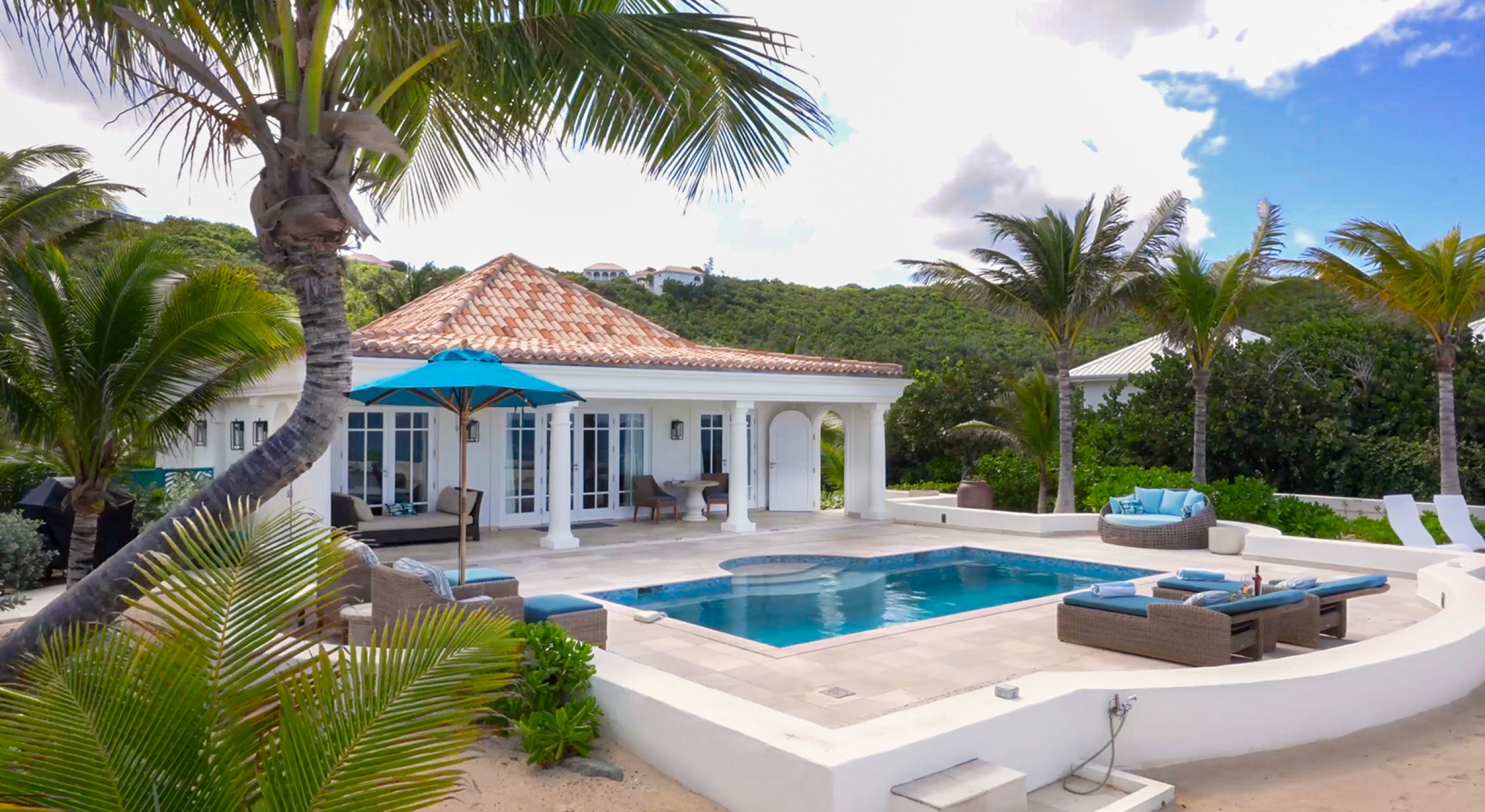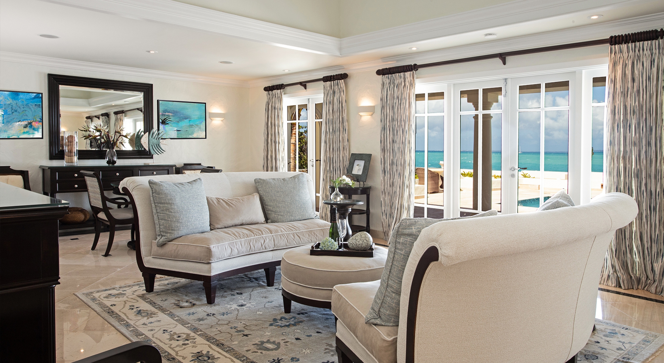 Arrival – The tropical turquoise entrance gate will open to a paved driveway surrounded by groves of palm trees and gardens of colorful, tropical flowers. A marble stairway will lead you up to the terrace where you’ll be entranced by the stunning, panoramic seascape. Here you will enter the beautifully suite-designed villa. Les Palmiers, decorated in soft tones of cream, blues and grays encompasses fully air conditioned sleeping, living and dining areas, all with spectacular ocean views.