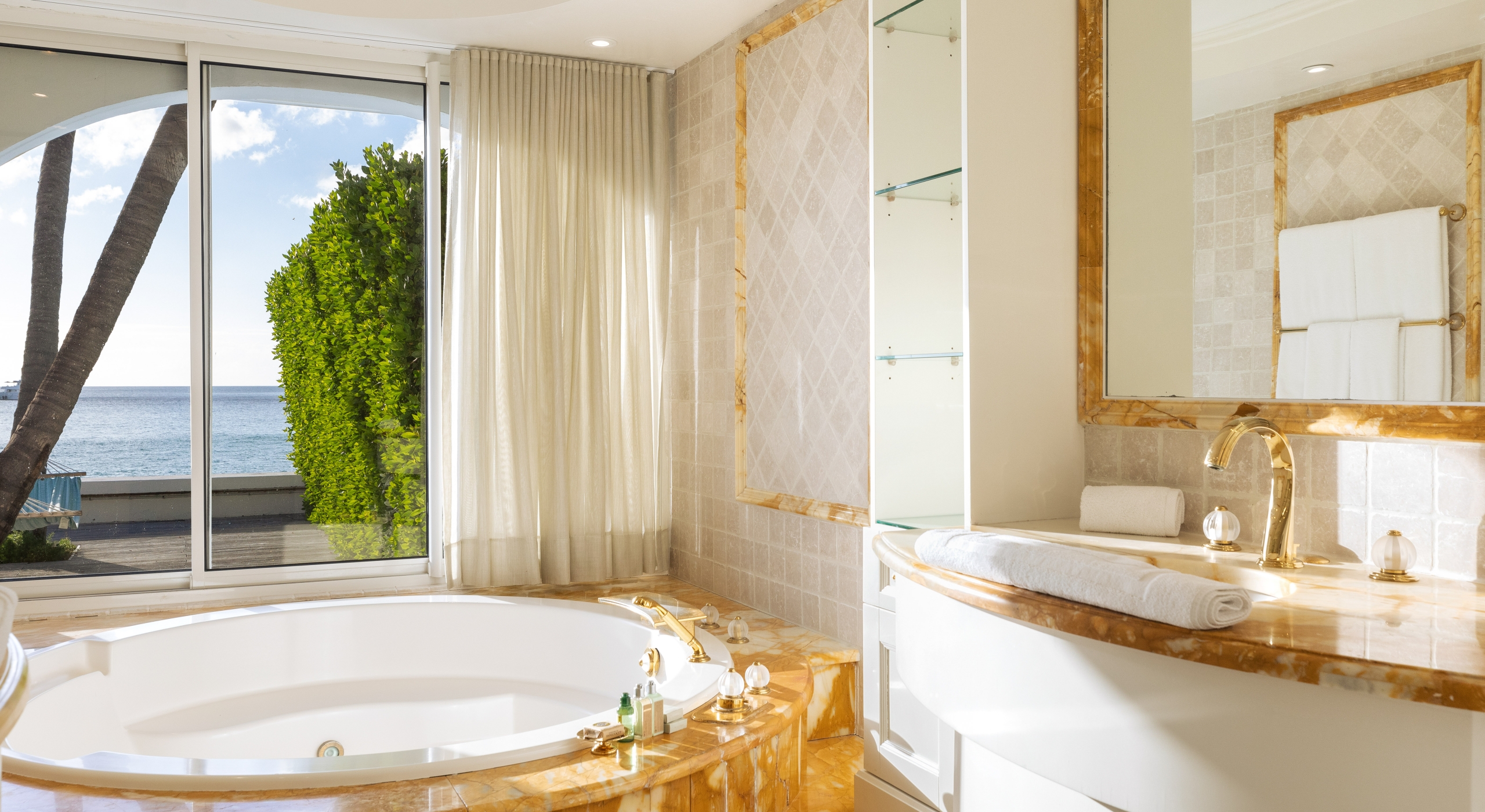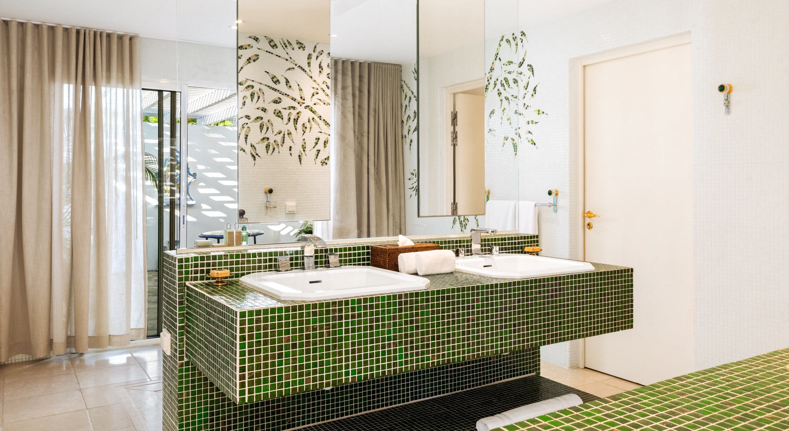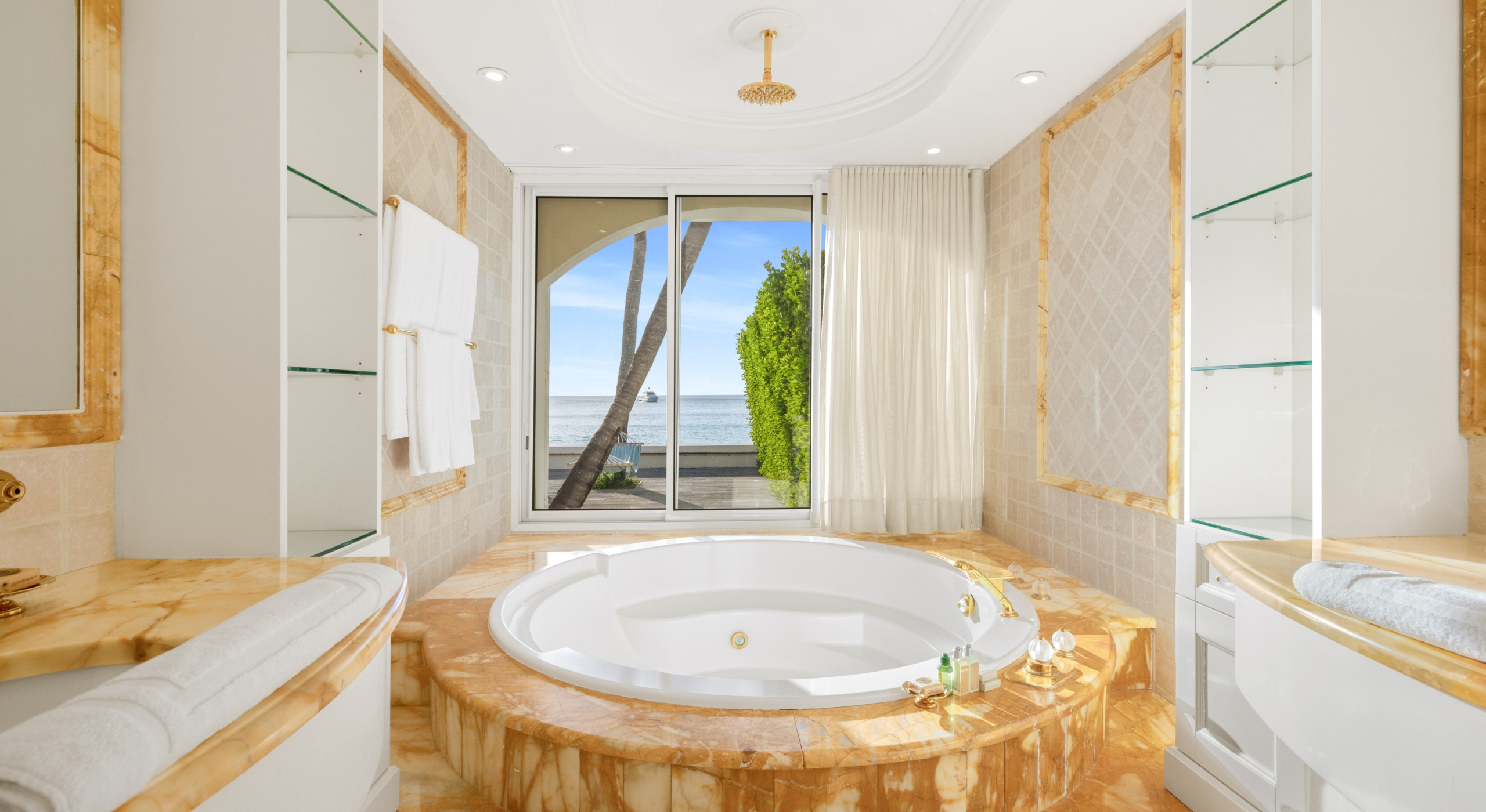 Four of the five-bedroom suites have sea views and are located within the main house. The fifth bedroom sits in a private casita off the courtyard. The master suite, with a private terrace overlooking the sea, sits in a private oasis at the top of a marble staircase. Every bedroom suite within the main house is a blend of refined contemporary overlaid with touches of opulence. Each bathroom is a work of art with semi-precious stone fixtures and tubs plus overhead showers. Several have ocean views and private patios.