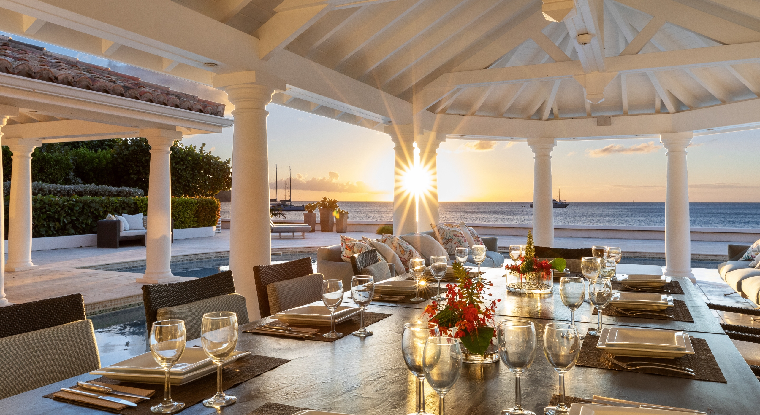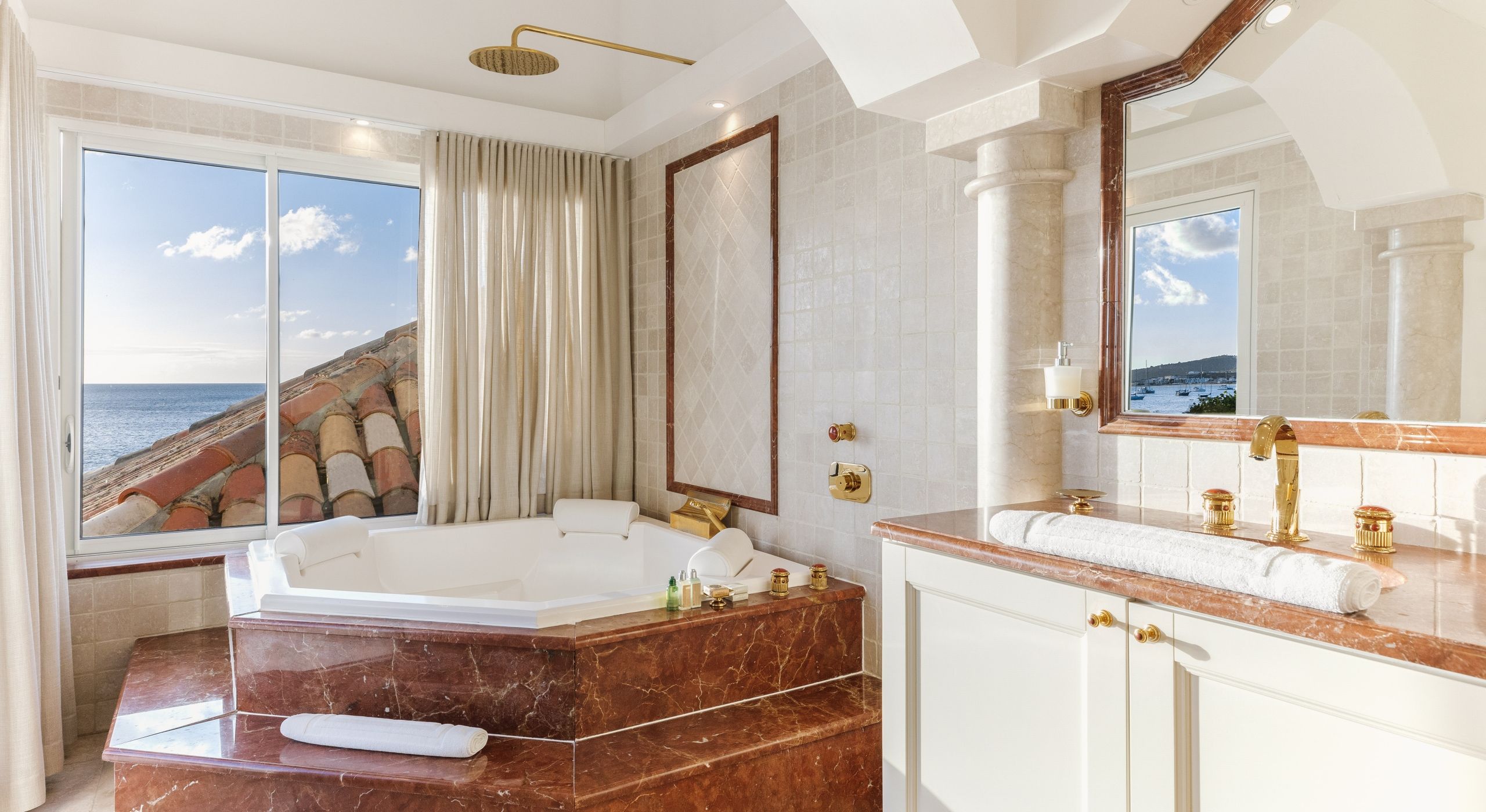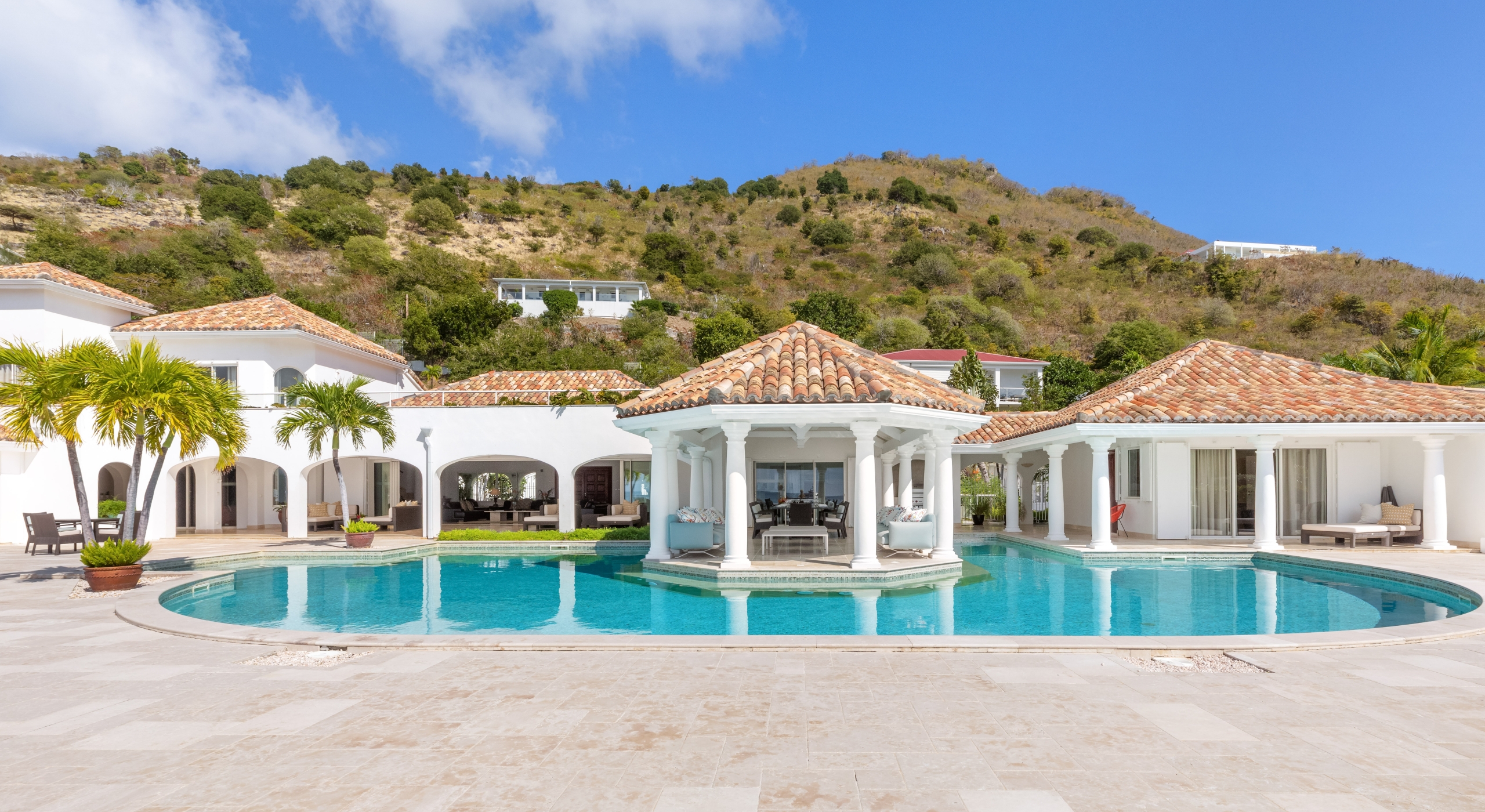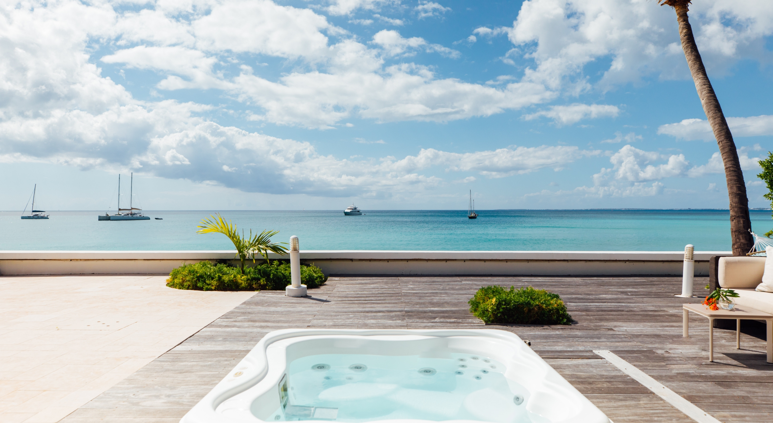 Covered and open terraces, defined by columns and arches, span the length of the villa. The large horseshoe-shaped heated pool sits at the sea's edge. In the center of the horseshoe is a covered loggia for relaxing and dining poolside. A hot tub sits nearby for ultimate relaxation. Additionally, the villa has an on-site manager skilled in taking care of your needs and easy access down the beach to Grand Case Beach Club restaurant and bar.