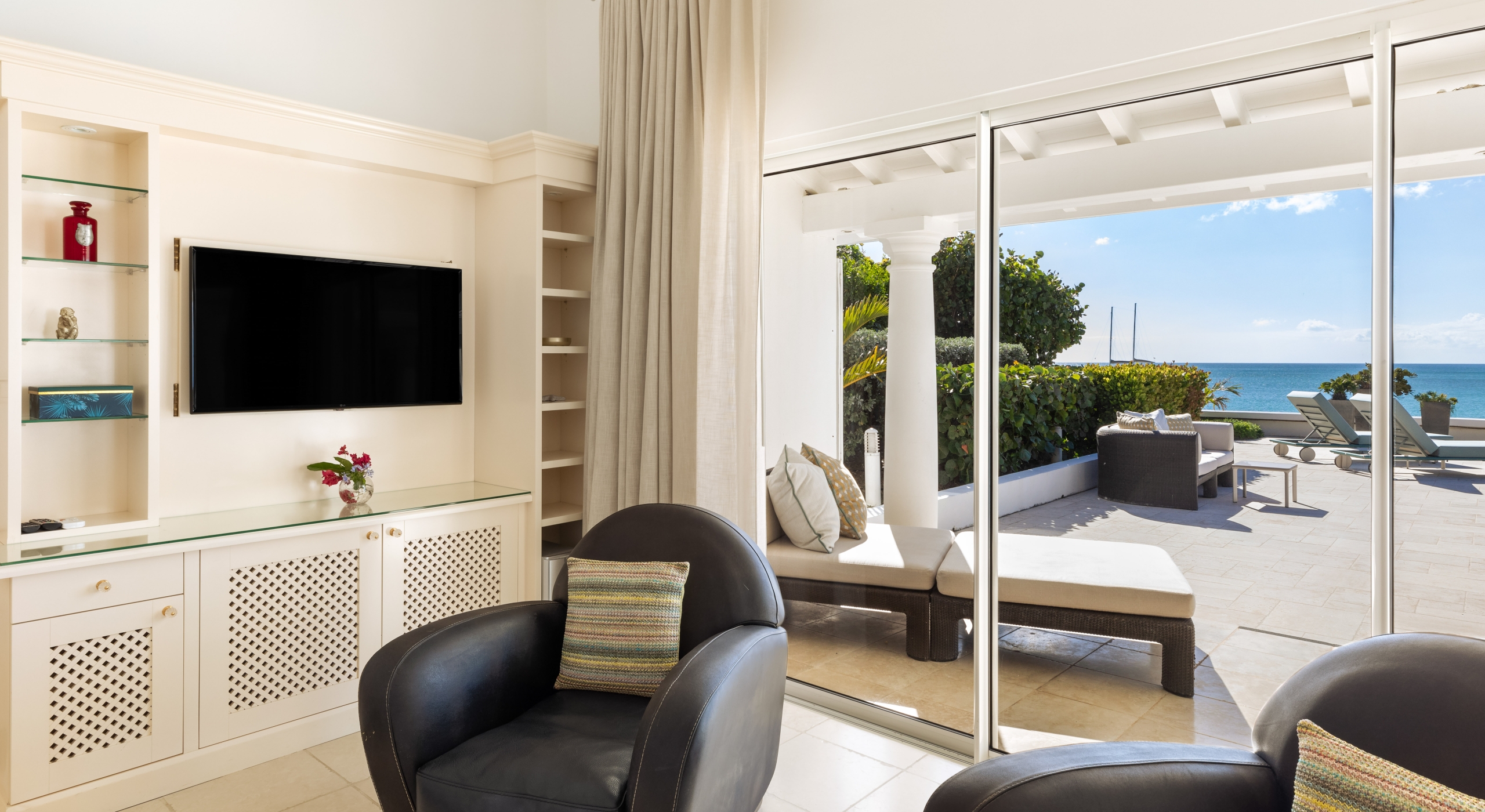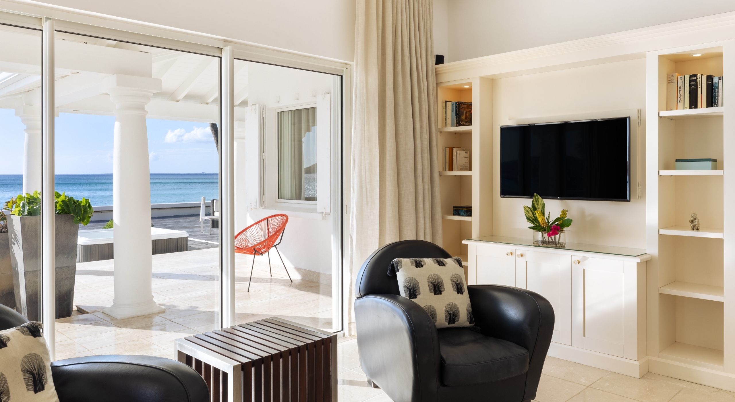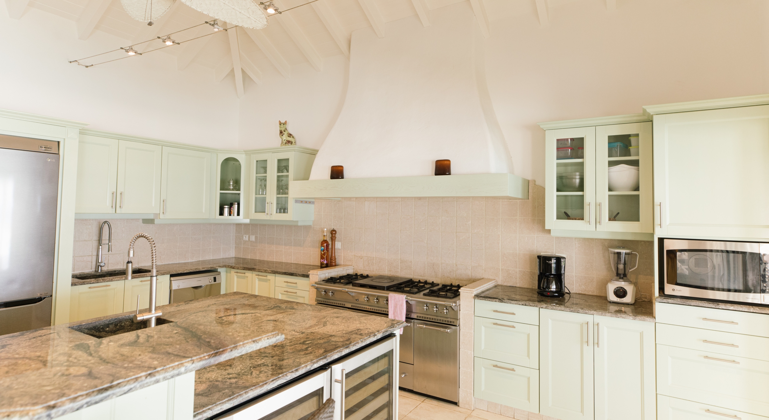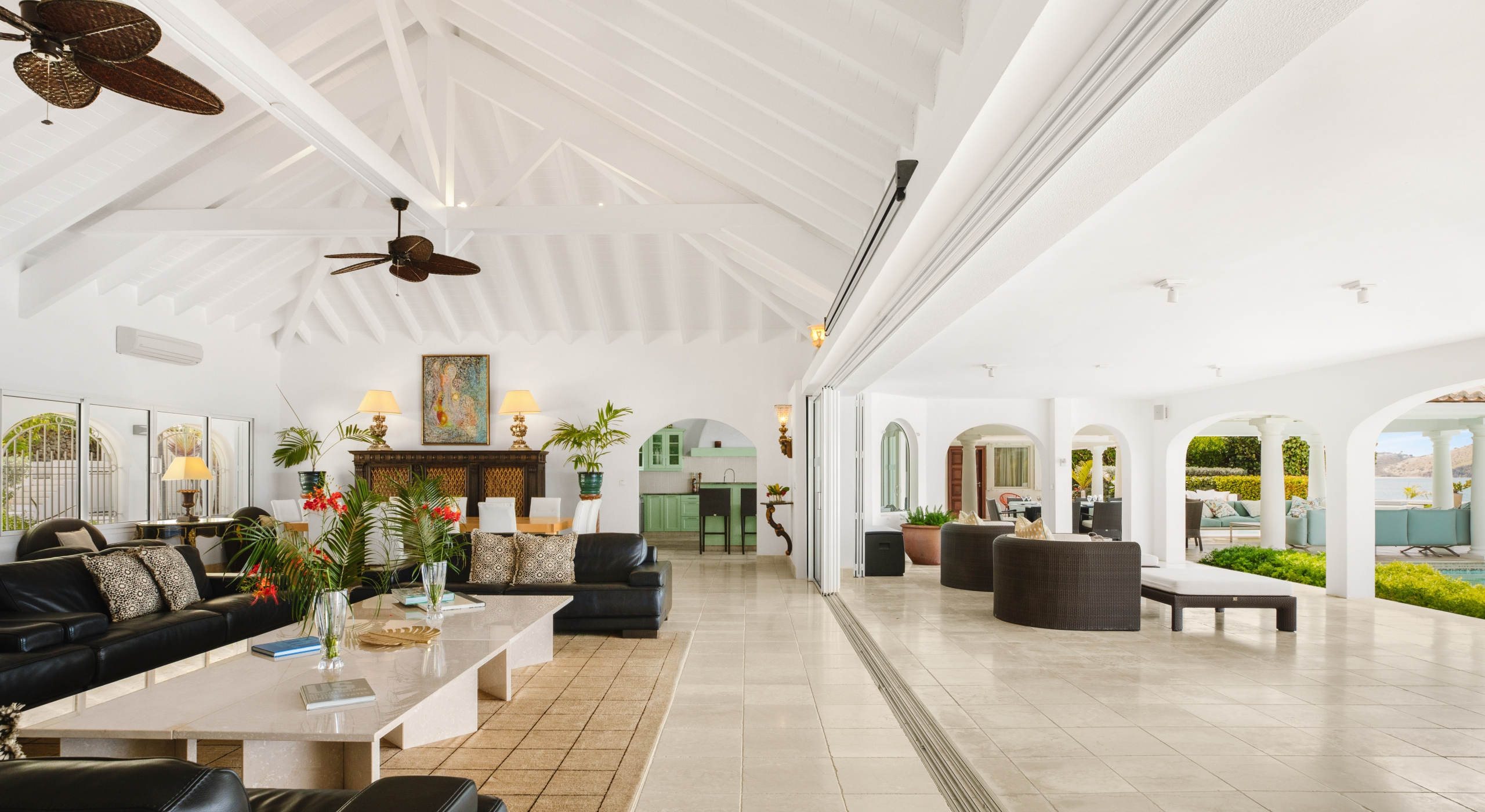 The interior spaces are spacious and airy; completely air-conditioned or fully open to the sea's breeze. Travertine floors flow inside to outside creating an elegantly seamless transition. The decor mixes contemporary shapes with European antiques. Fabulous art and accessories have a museum-like feel yet this is a comfortable, charming, and exotic space to simply relax and enjoy the view. Adjacent to the living room is a large semi-private media room and library. The fabulous and well equipped French Caribbean style kitchen in soft greens and grey marble has sea views and a gorgeous Lacanche professional stove. A built-in outdoor barbeque provides additional cooking spaces.
