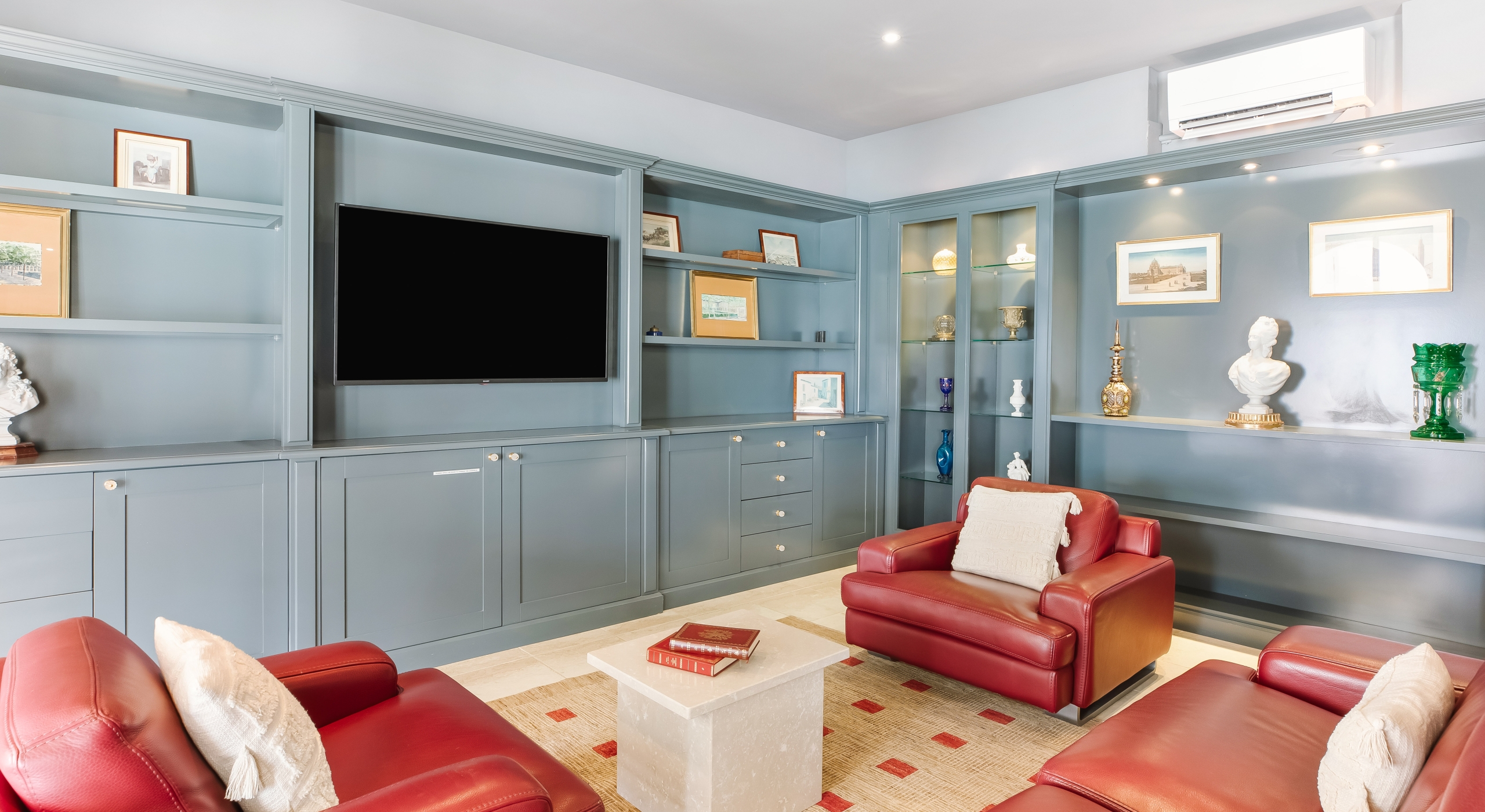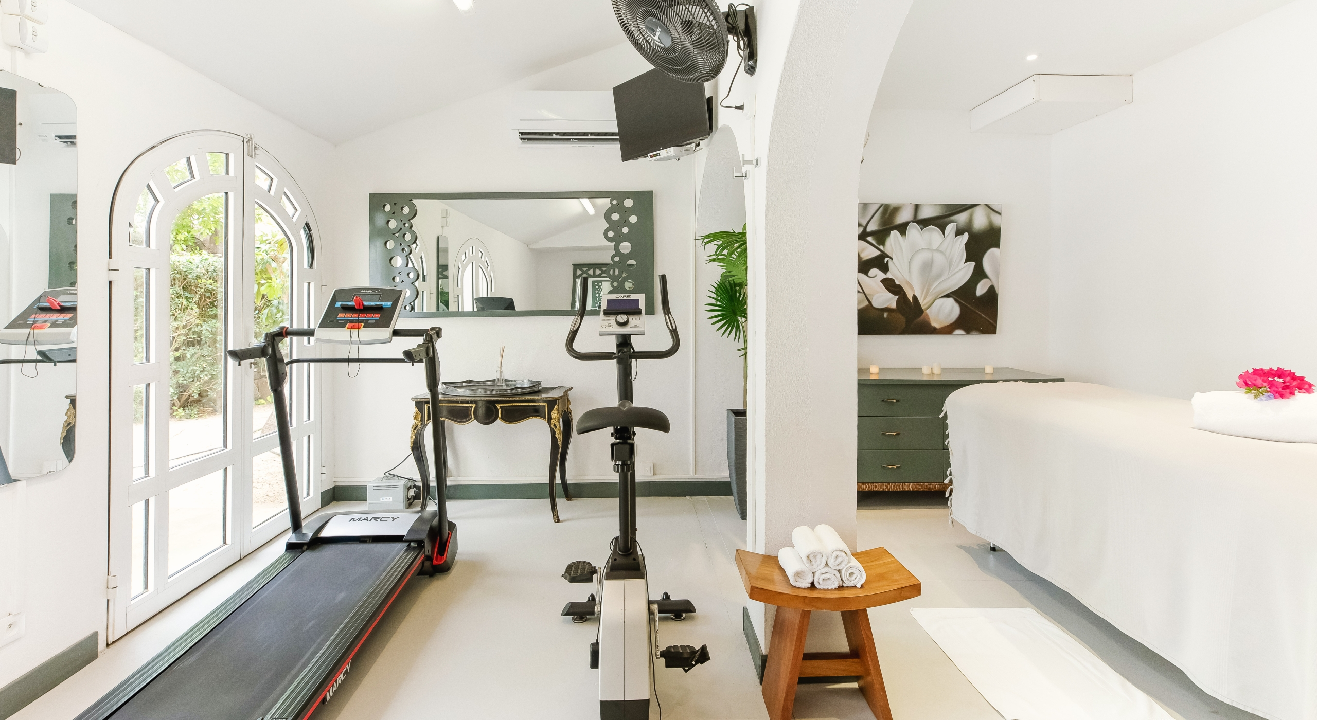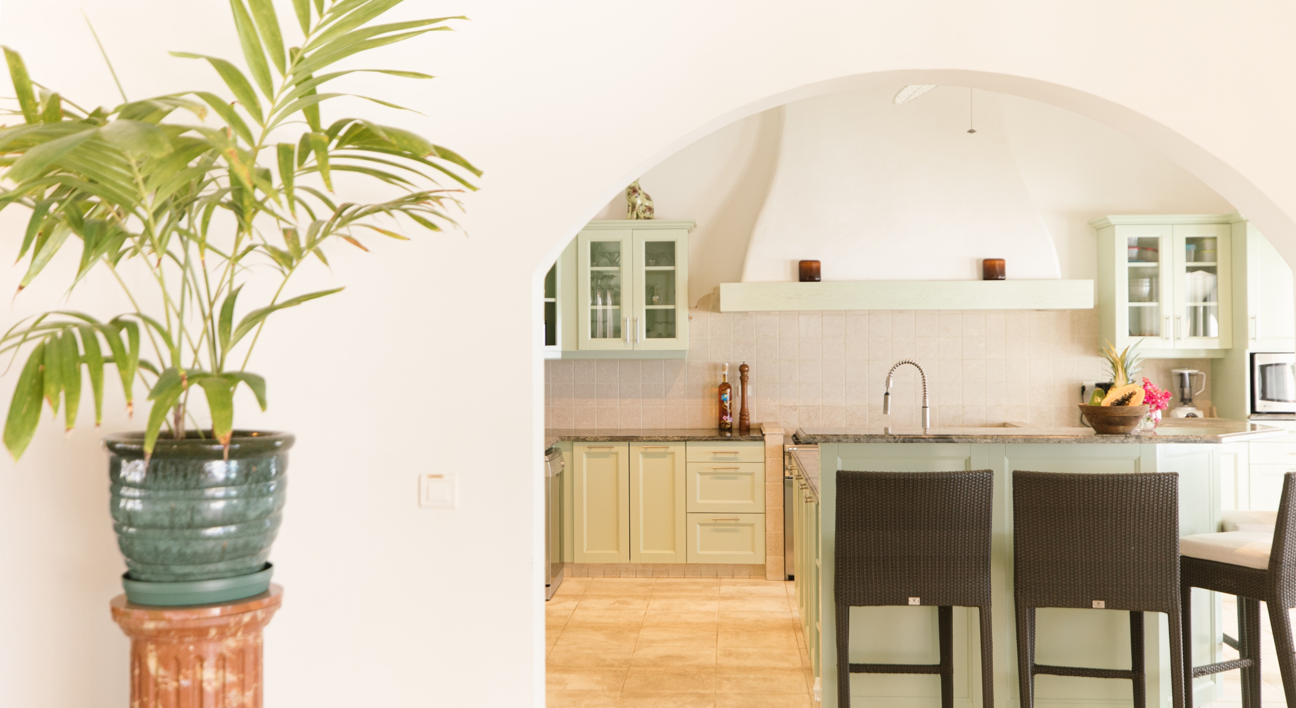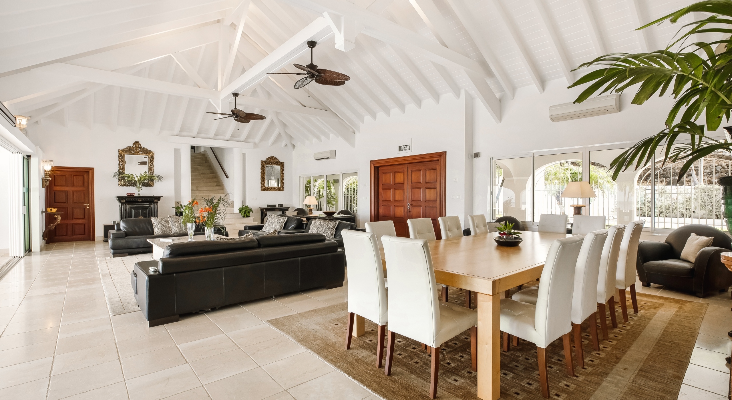 The interior spaces are spacious and airy; completely air-conditioned or fully open to the sea's breeze. Travertine floors flow inside to outside creating an elegantly seamless transition. The decor mixes contemporary shapes with European antiques. Fabulous art and accessories have a museum-like feel yet this is a comfortable, charming, and exotic space to simply relax and enjoy the view. Adjacent to the living room is a large semi-private media room and library. The fabulous and well equipped French Caribbean style kitchen in soft greens and grey marble has sea views and a gorgeous Lacanche professional stove. A built-in outdoor barbeque provides additional cooking spaces.
