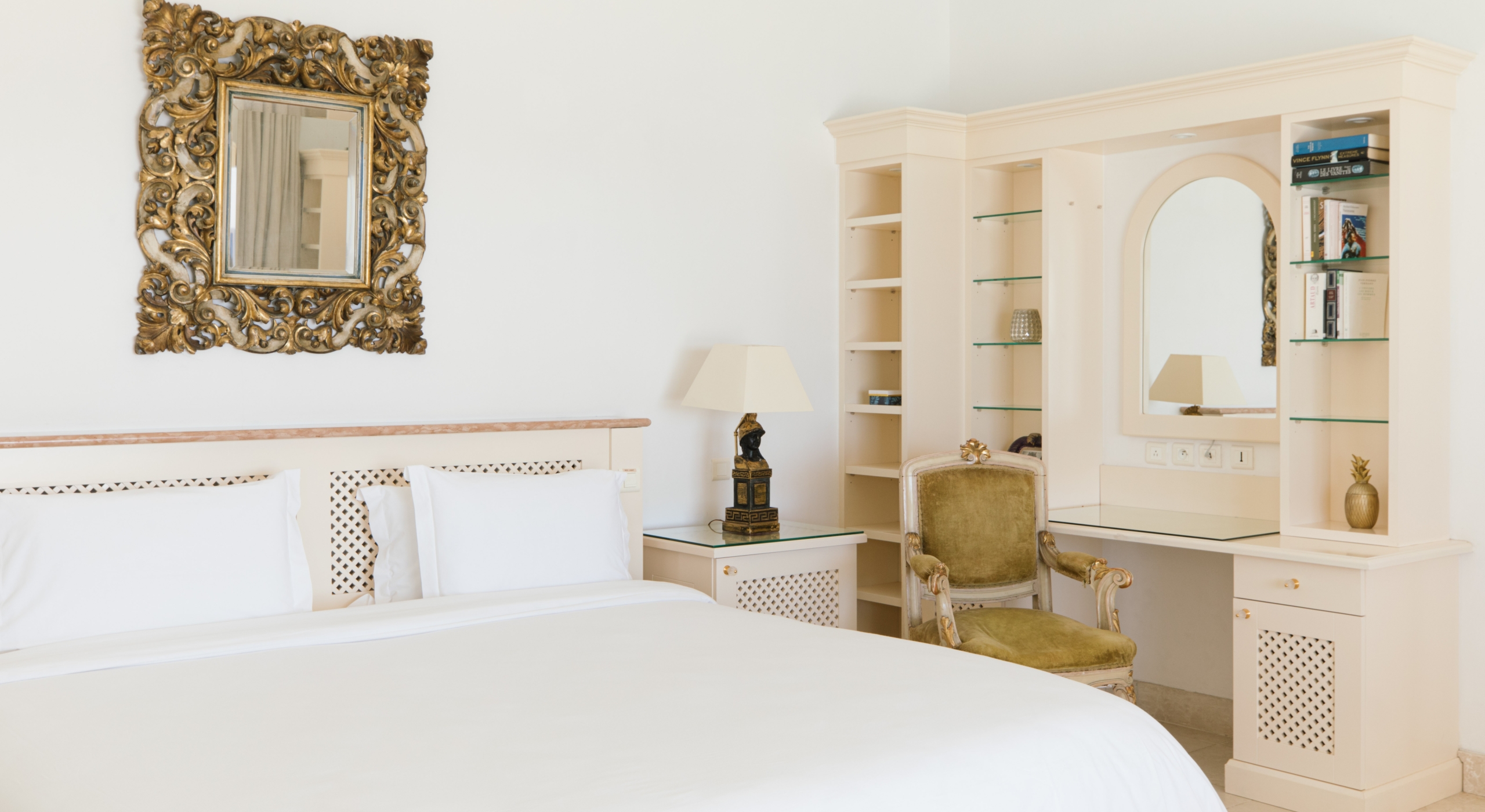Bedroom 1: Bedroom with a king-size bed, A/C, TV, private terrace and en-suite bathroom with bathtub, shower, vanity and WC. 2 guests maximum.