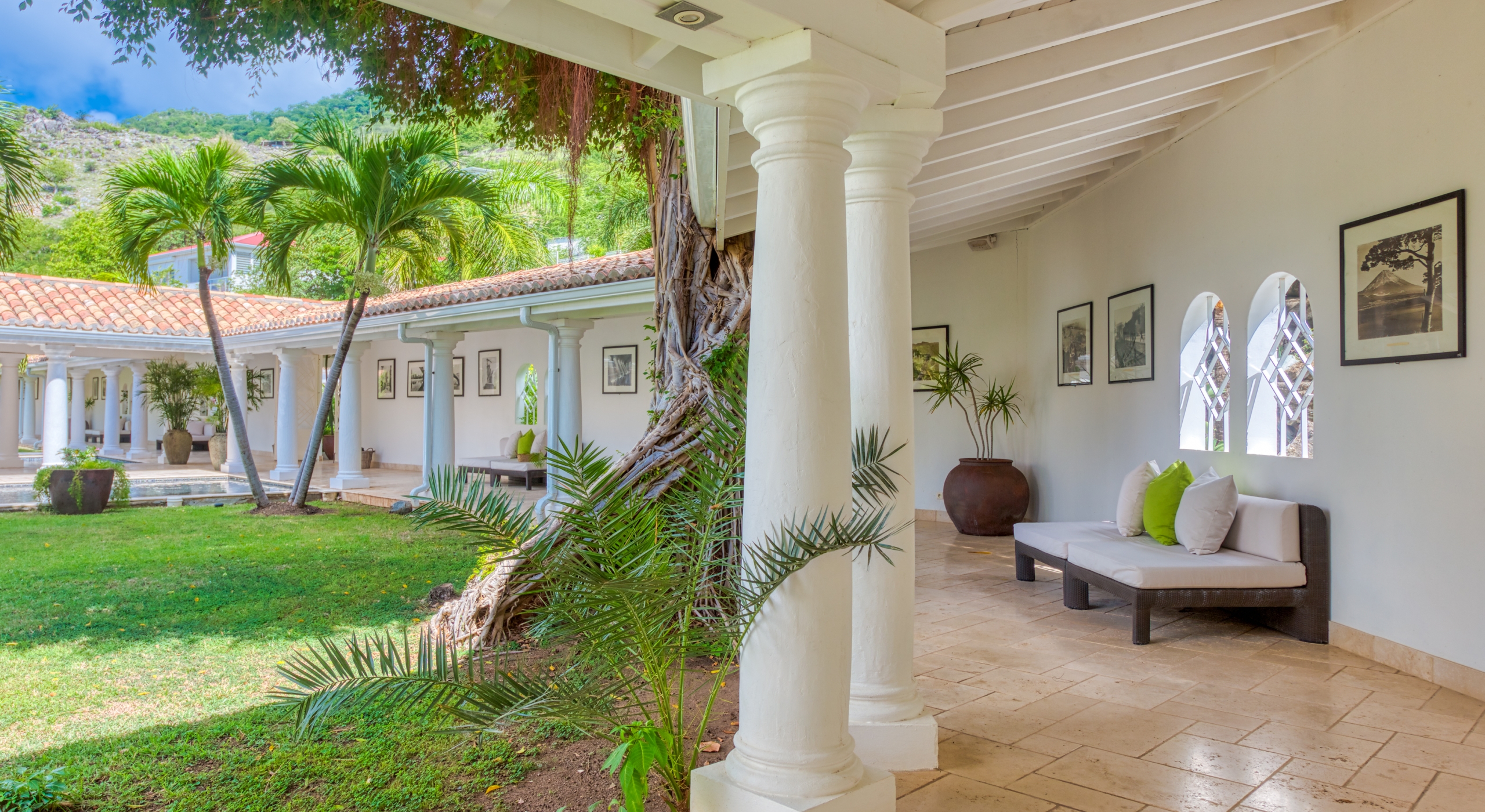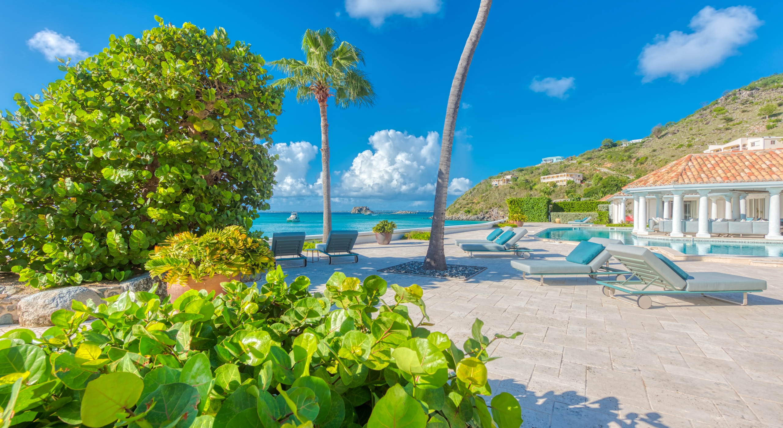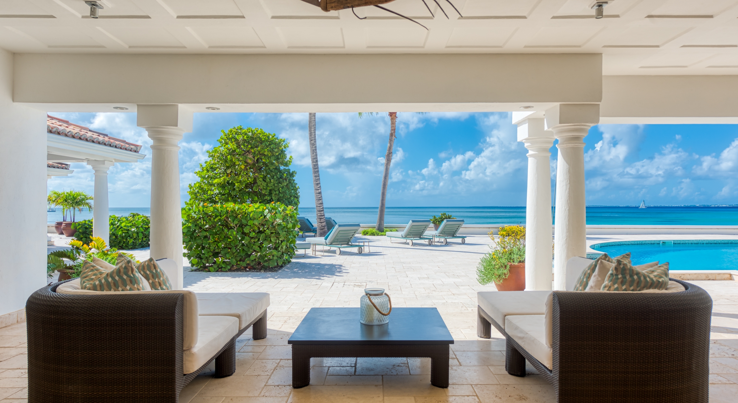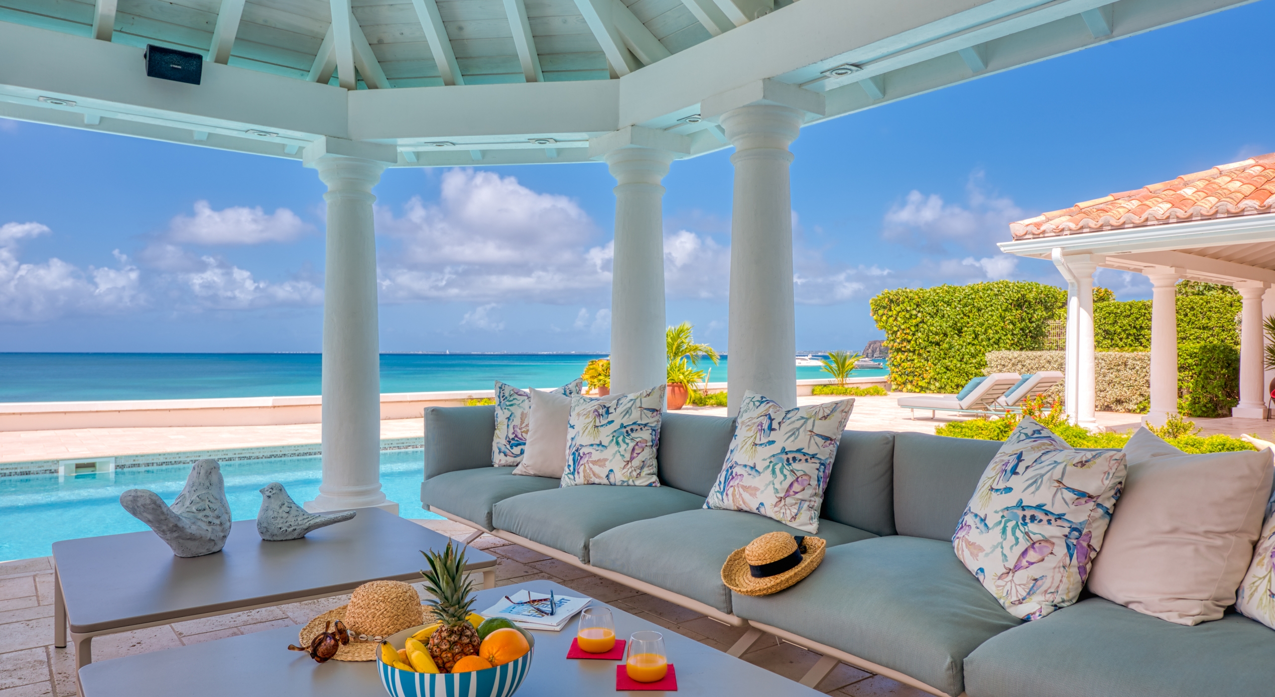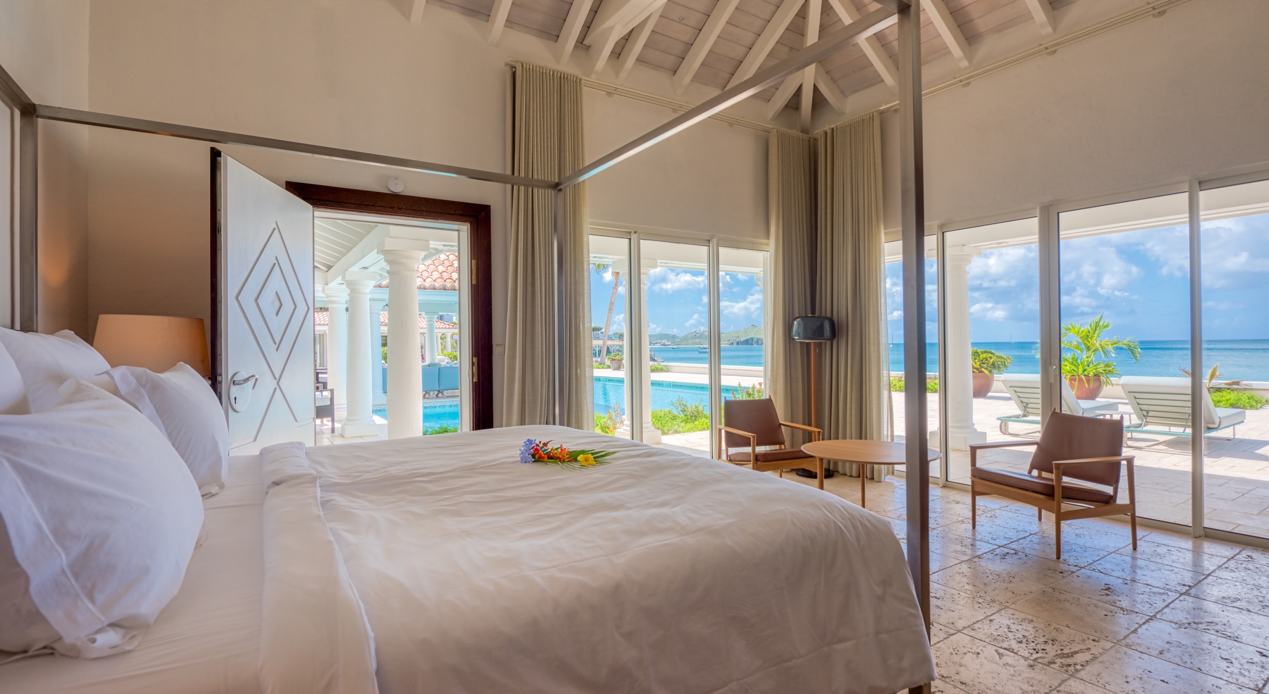 The entrance is lined with beautiful palms and tropical foliage. A columned portico brings you into the grand landscaped courtyard, flanked by covered cloister walkways surrounding the entrance. Pools frame the walkway setting the stage for a stunning view of the sapphire sea, Caribbean sky, stately palms, and Anguilla in the distance. Step outside to the villa's main terrace and you find yourself looking out to Petite Plage beach, accessible down a short staircase.