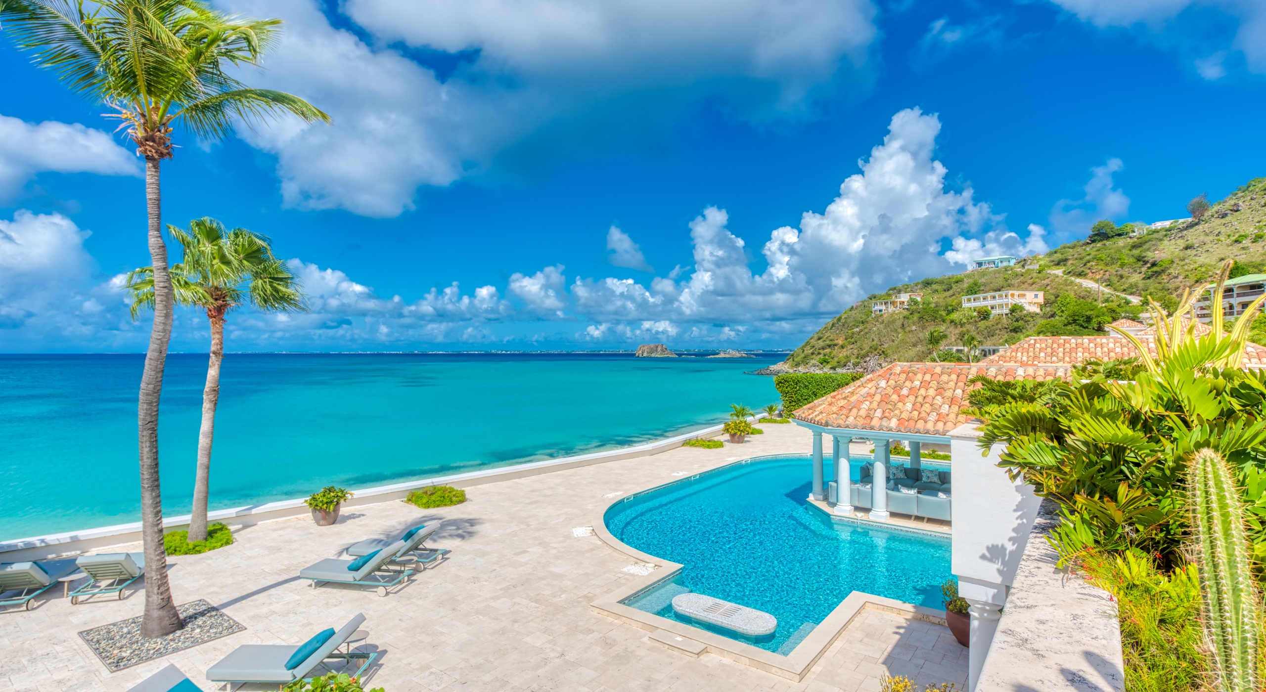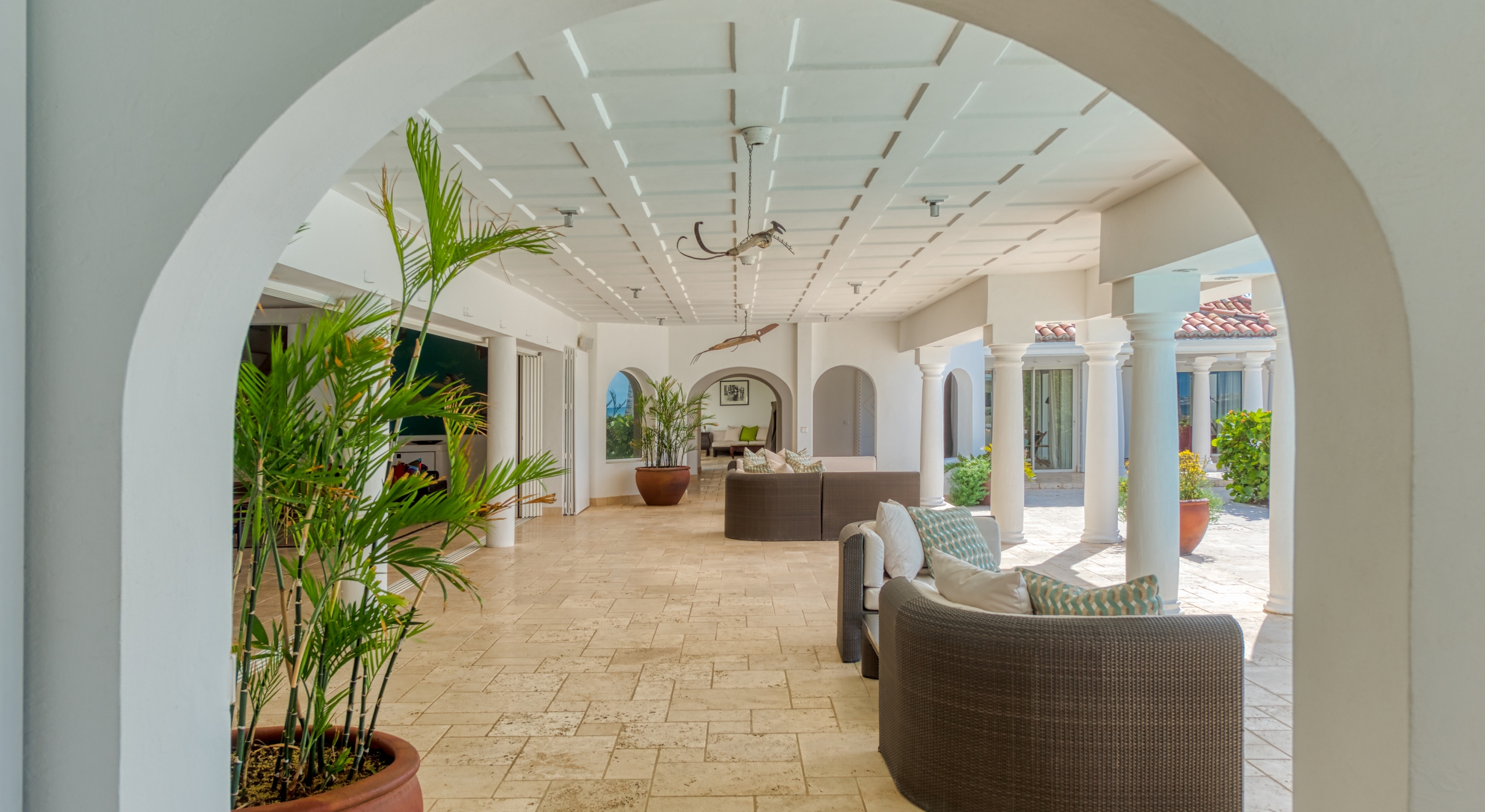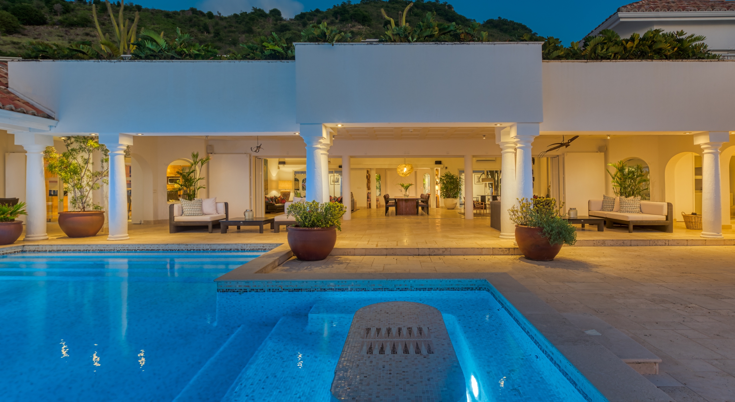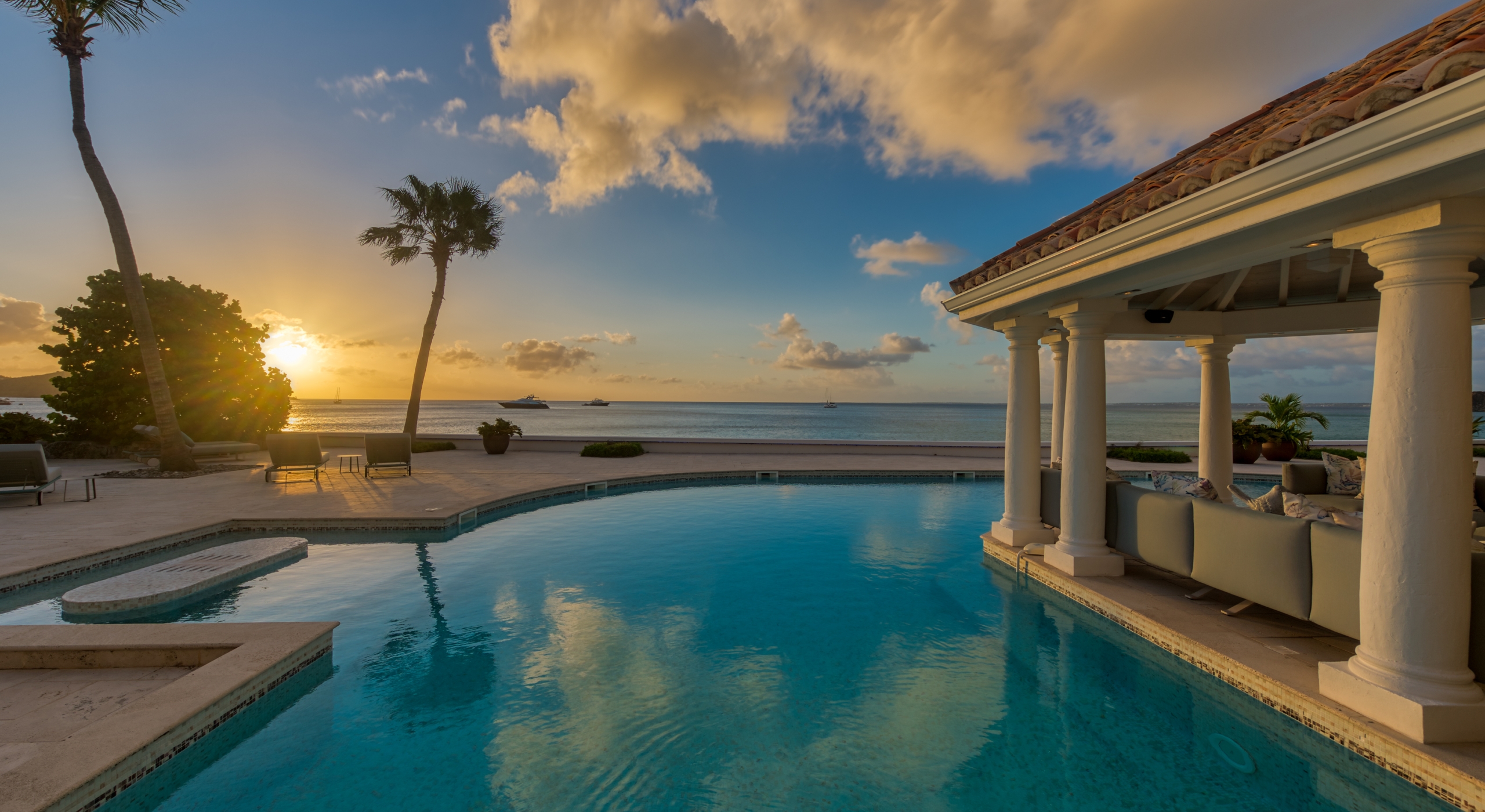 The entrance is lined with beautiful palms and tropical foliage. A columned portico brings you into the grand landscaped courtyard, flanked by covered cloister walkways surrounding the entrance. Pools frame the walkway setting the stage for a stunning view of the sapphire sea, Caribbean sky, stately palms, and Anguilla in the distance. Step outside to the villa's main terrace and you find yourself looking out to Petite Plage beach, accessible down a short staircase.