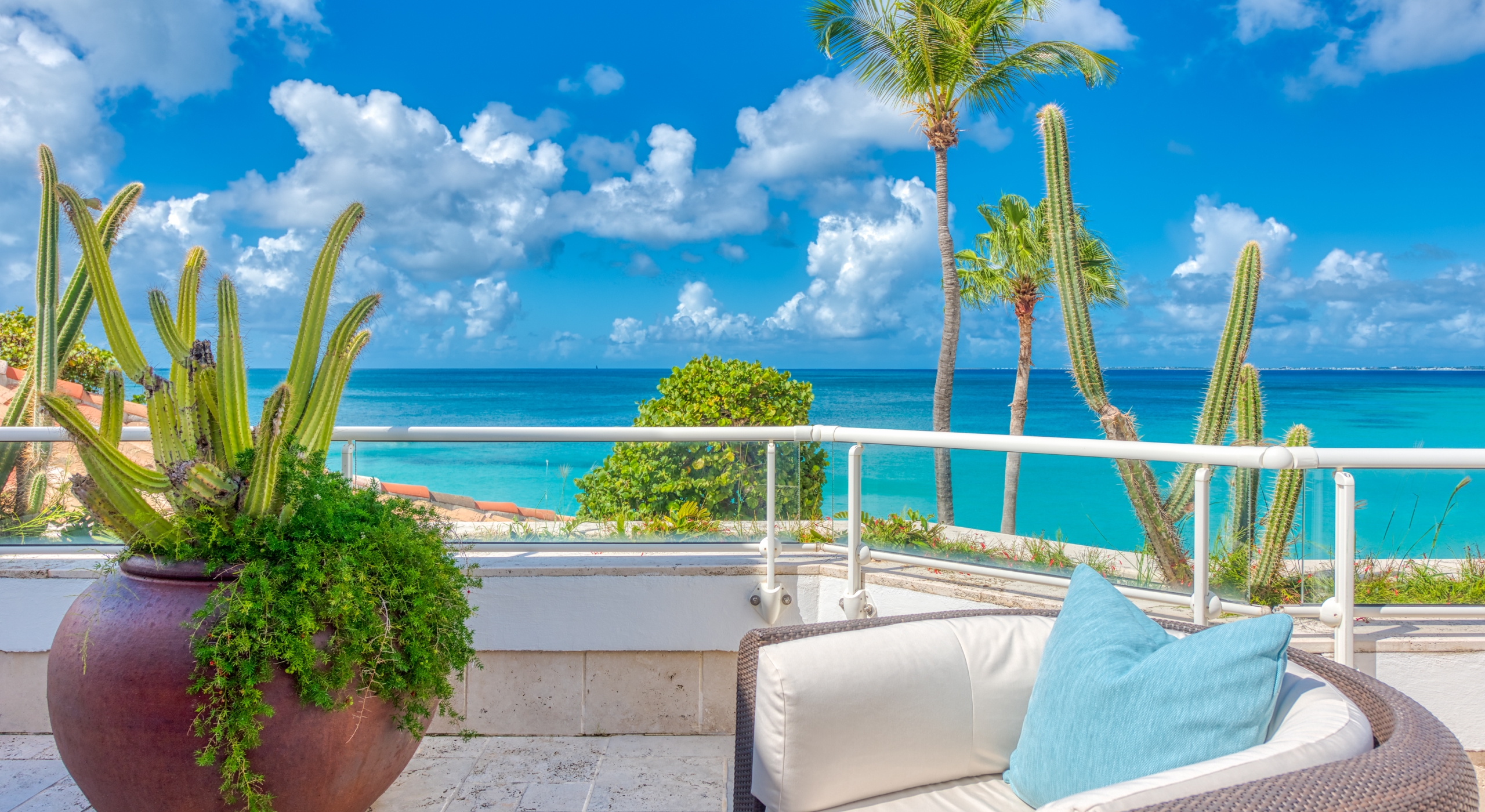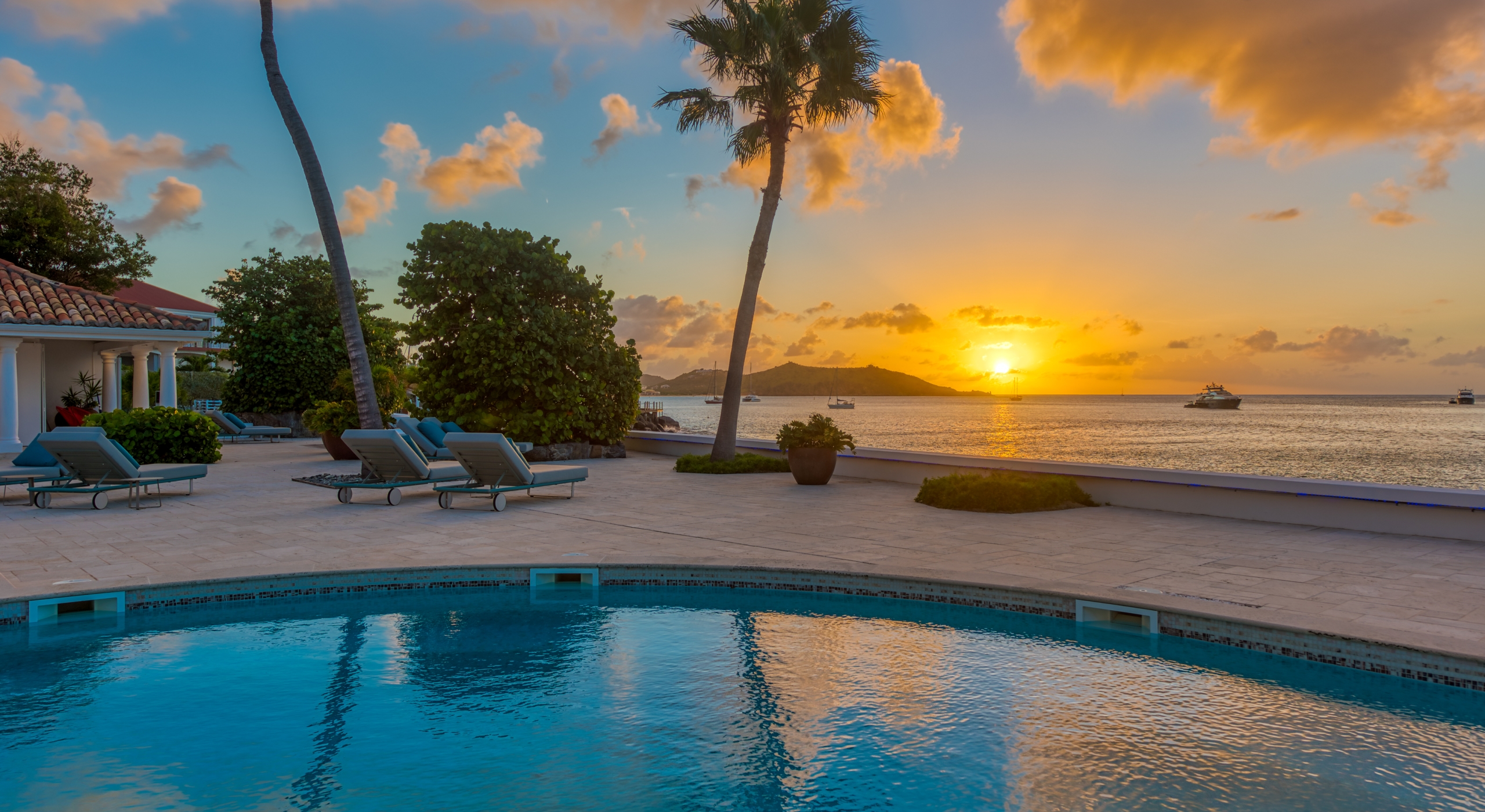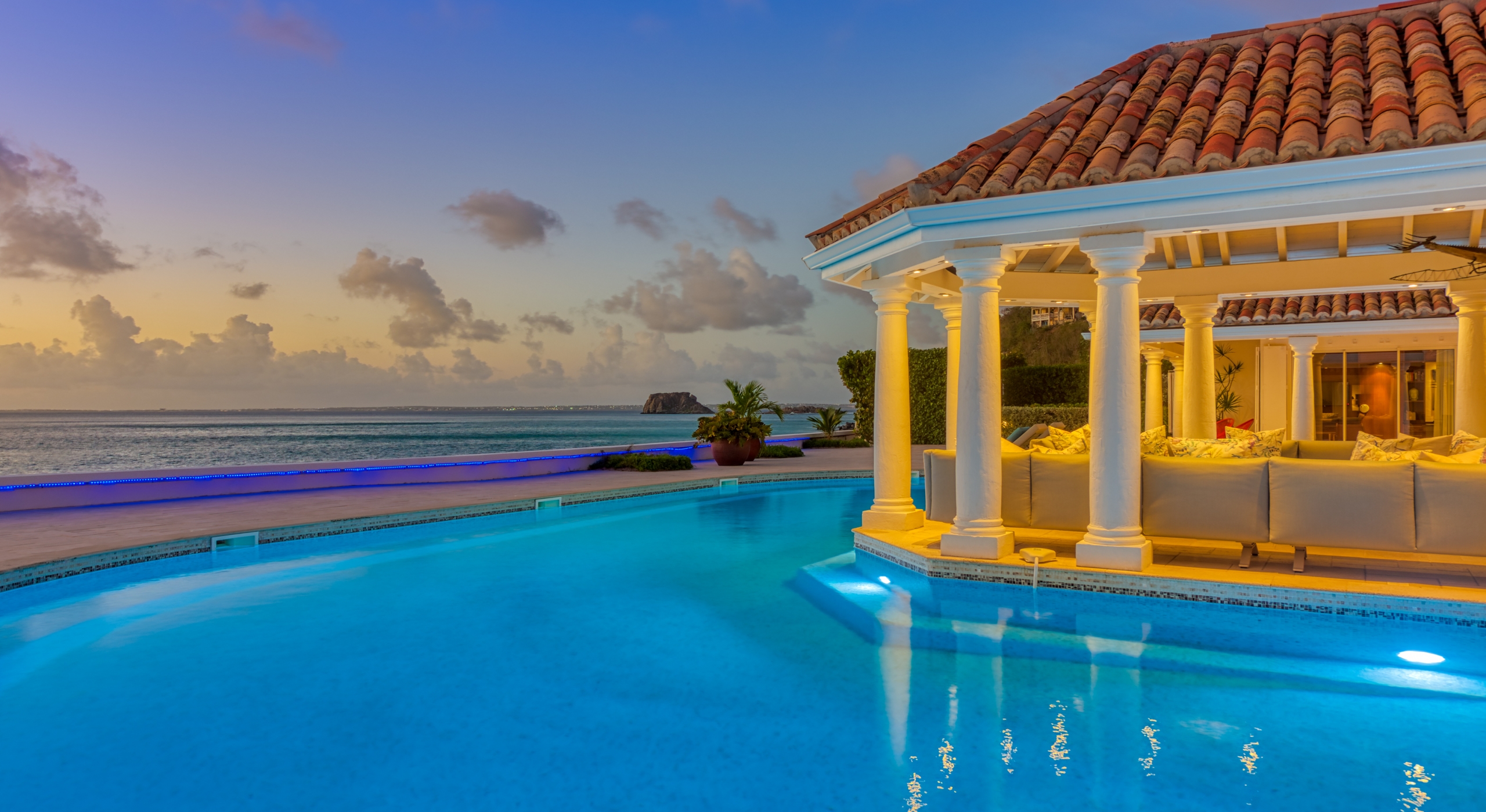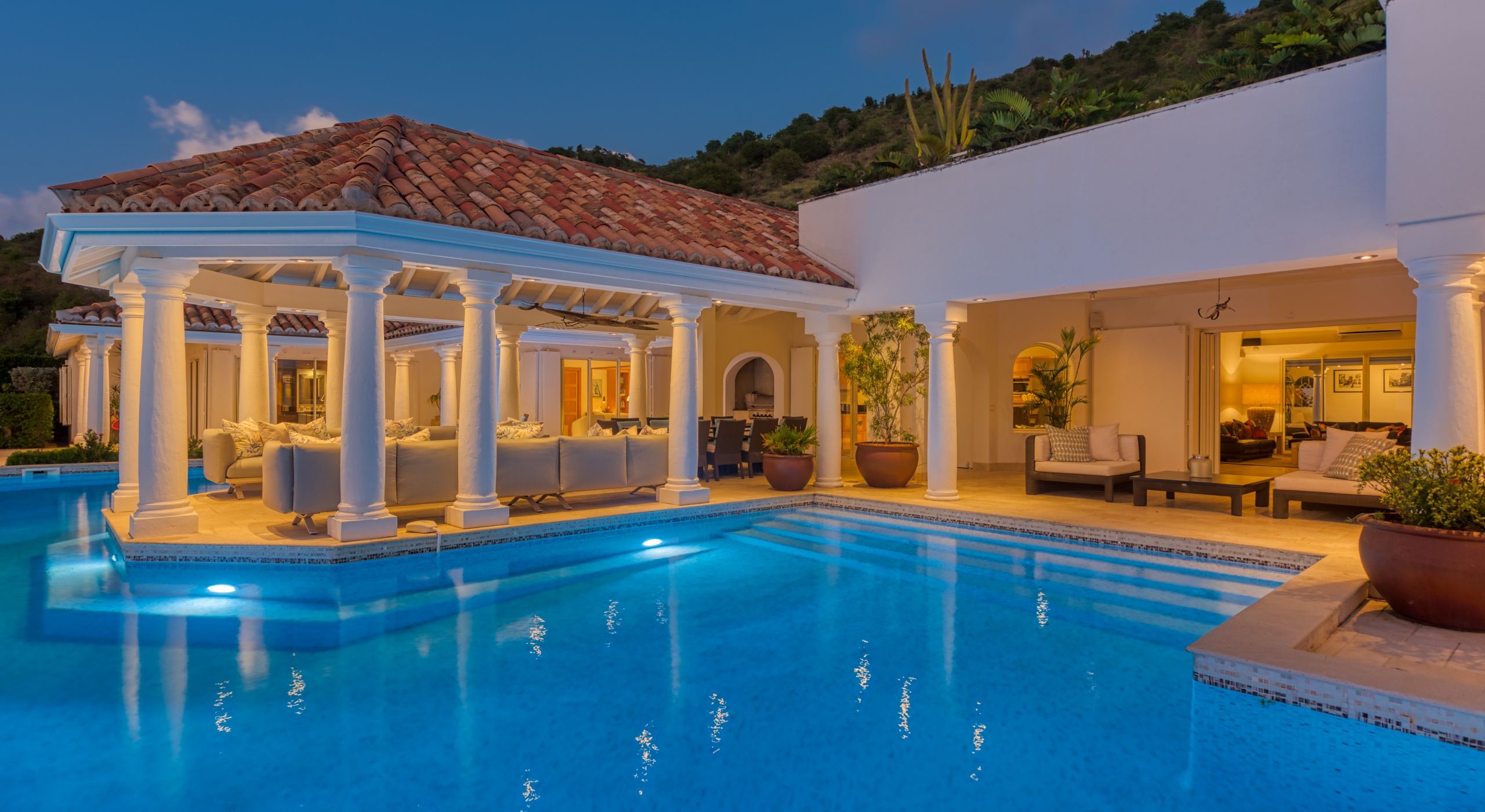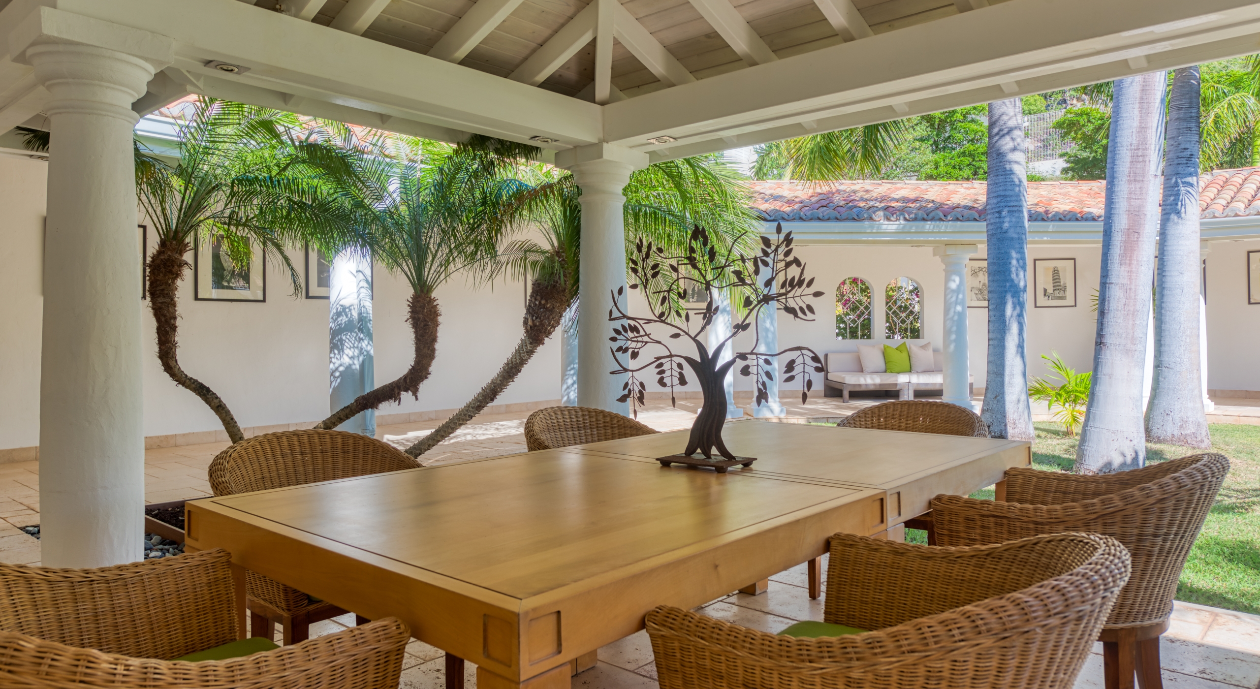 The entrance is lined with beautiful palms and tropical foliage. A columned portico brings you into the grand landscaped courtyard, flanked by covered cloister walkways surrounding the entrance. Pools frame the walkway setting the stage for a stunning view of the sapphire sea, Caribbean sky, stately palms, and Anguilla in the distance. Step outside to the villa's main terrace and you find yourself looking out to Petite Plage beach, accessible down a short staircase.