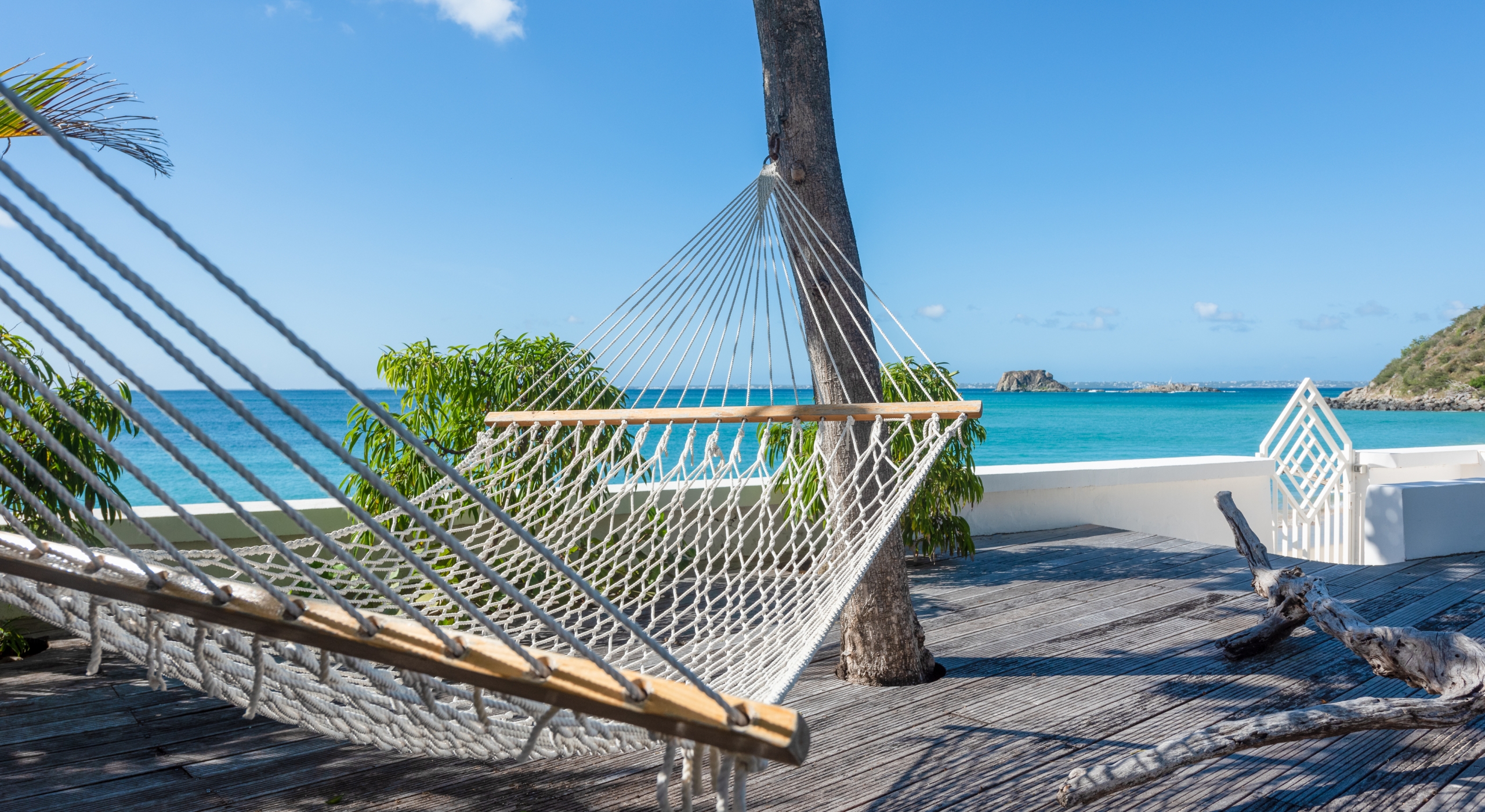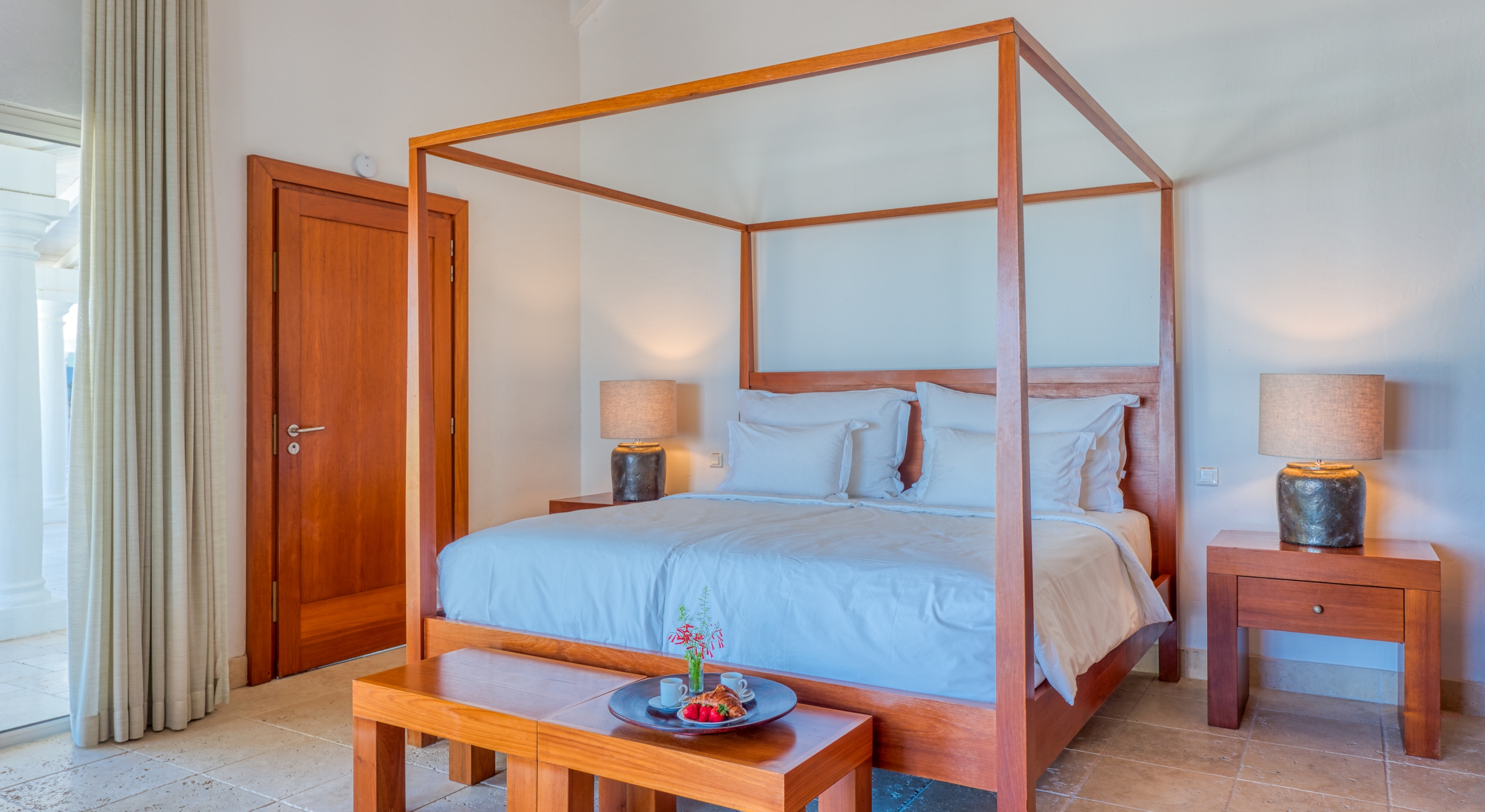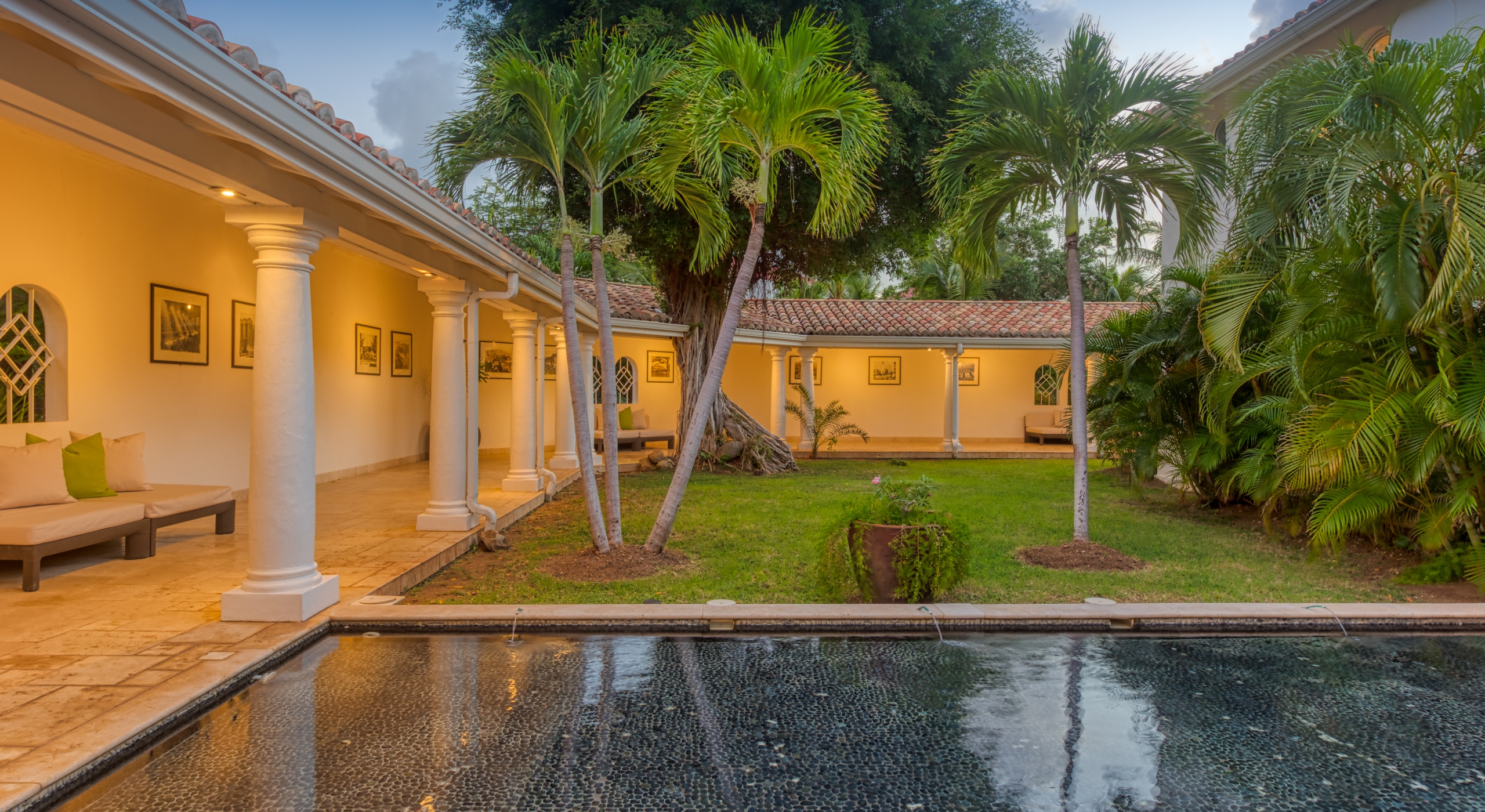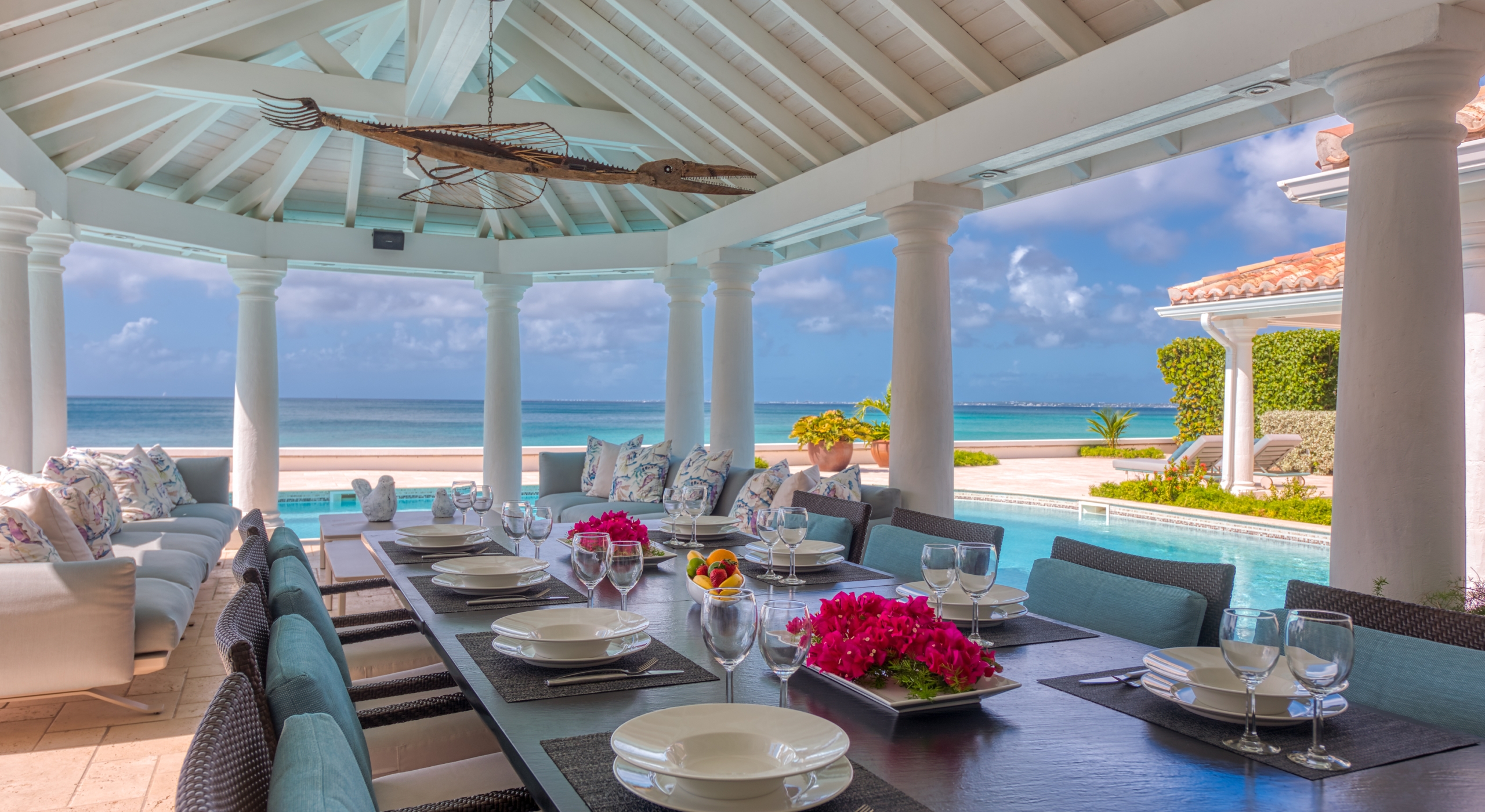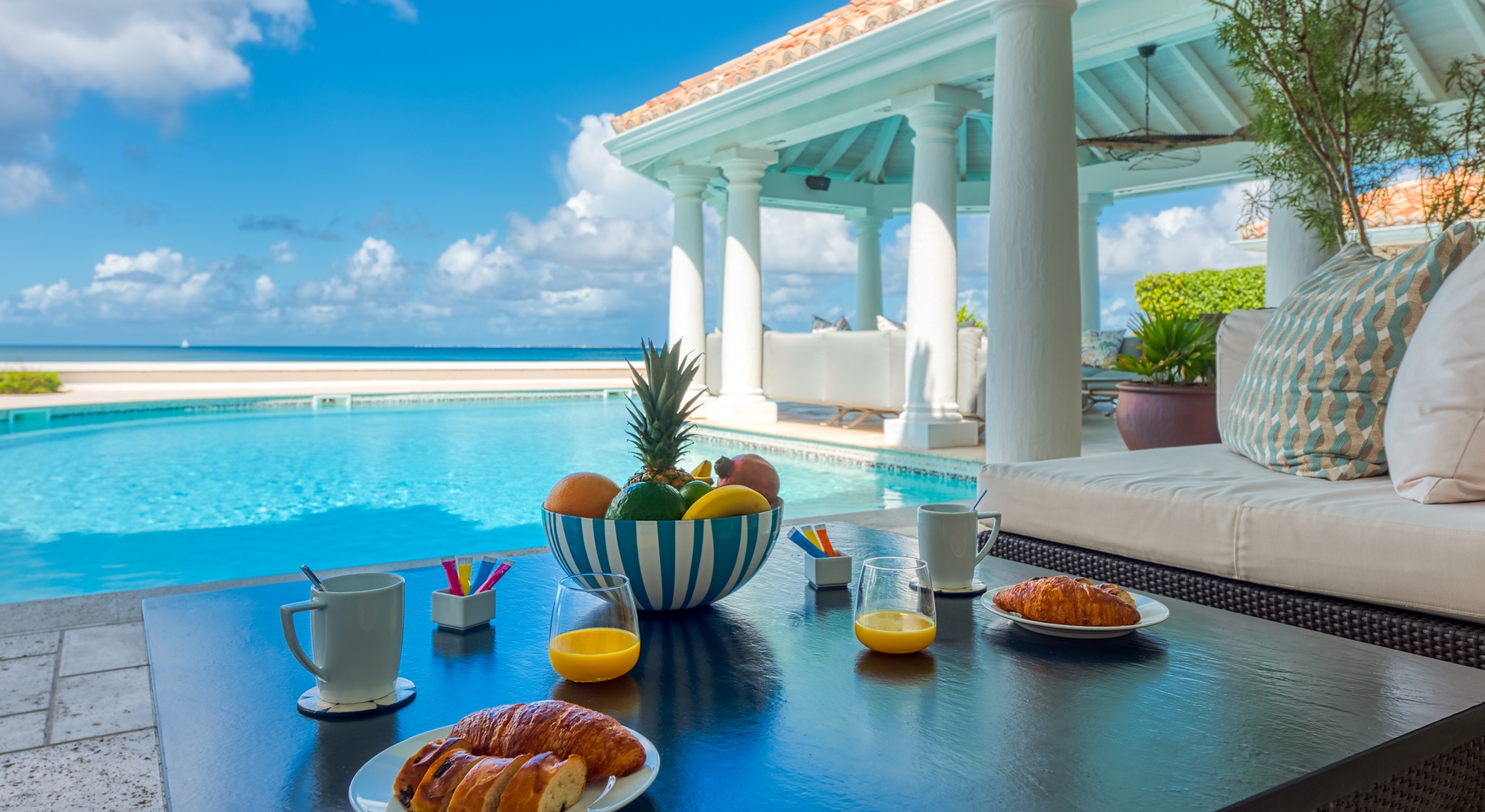 The entrance is lined with beautiful palms and tropical foliage. A columned portico brings you into the grand landscaped courtyard, flanked by covered cloister walkways surrounding the entrance. Pools frame the walkway setting the stage for a stunning view of the sapphire sea, Caribbean sky, stately palms, and Anguilla in the distance. Step outside to the villa's main terrace and you find yourself looking out to Petite Plage beach, accessible down a short staircase.