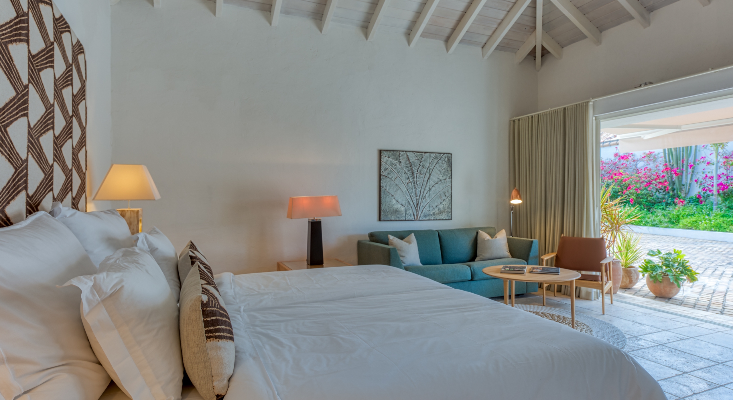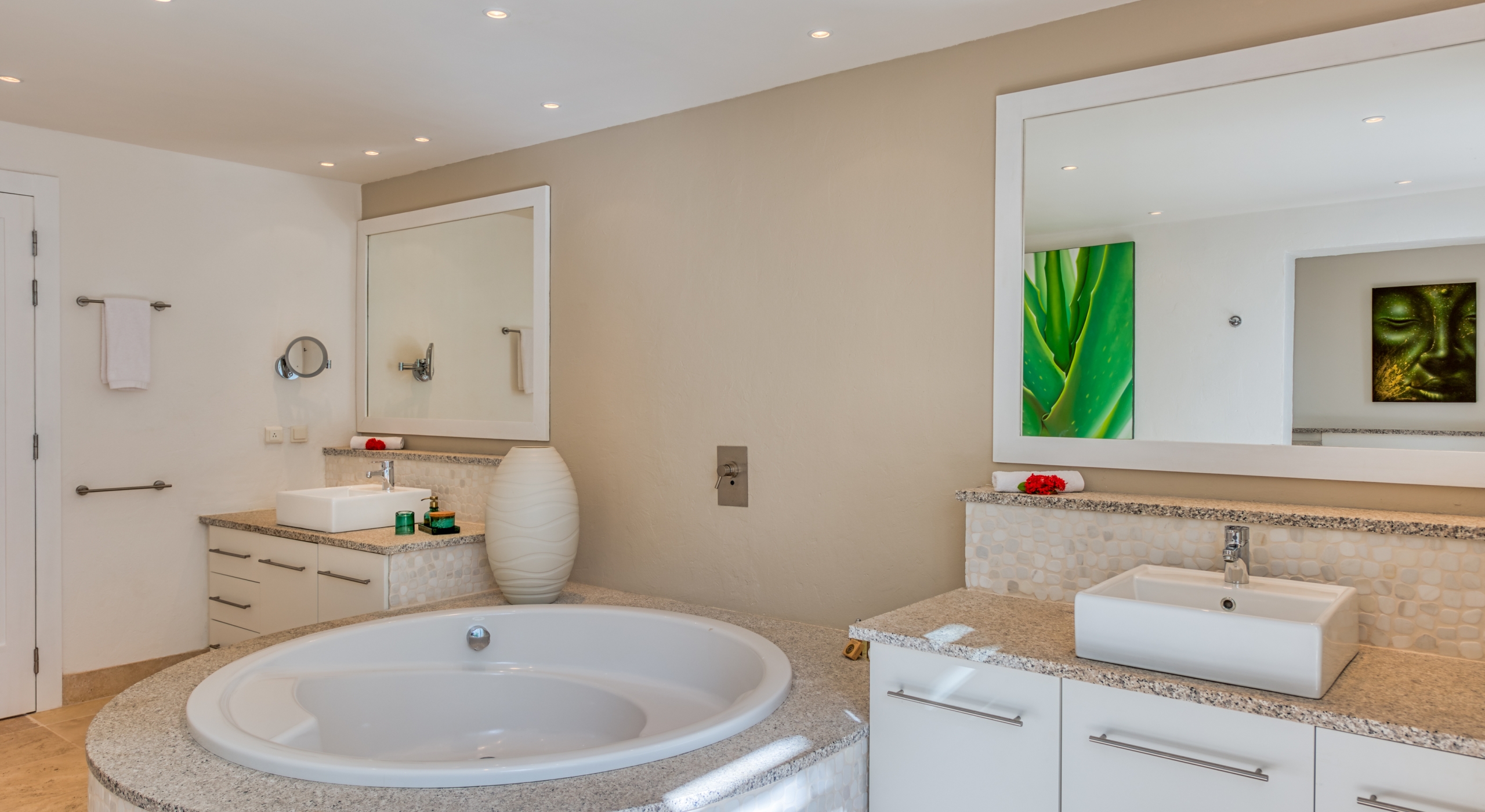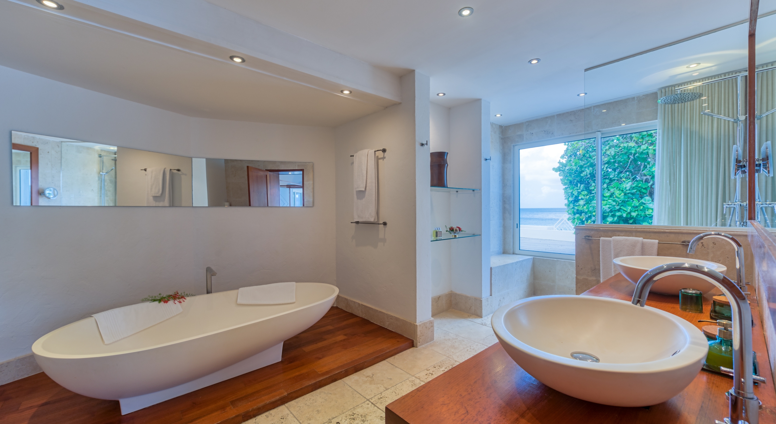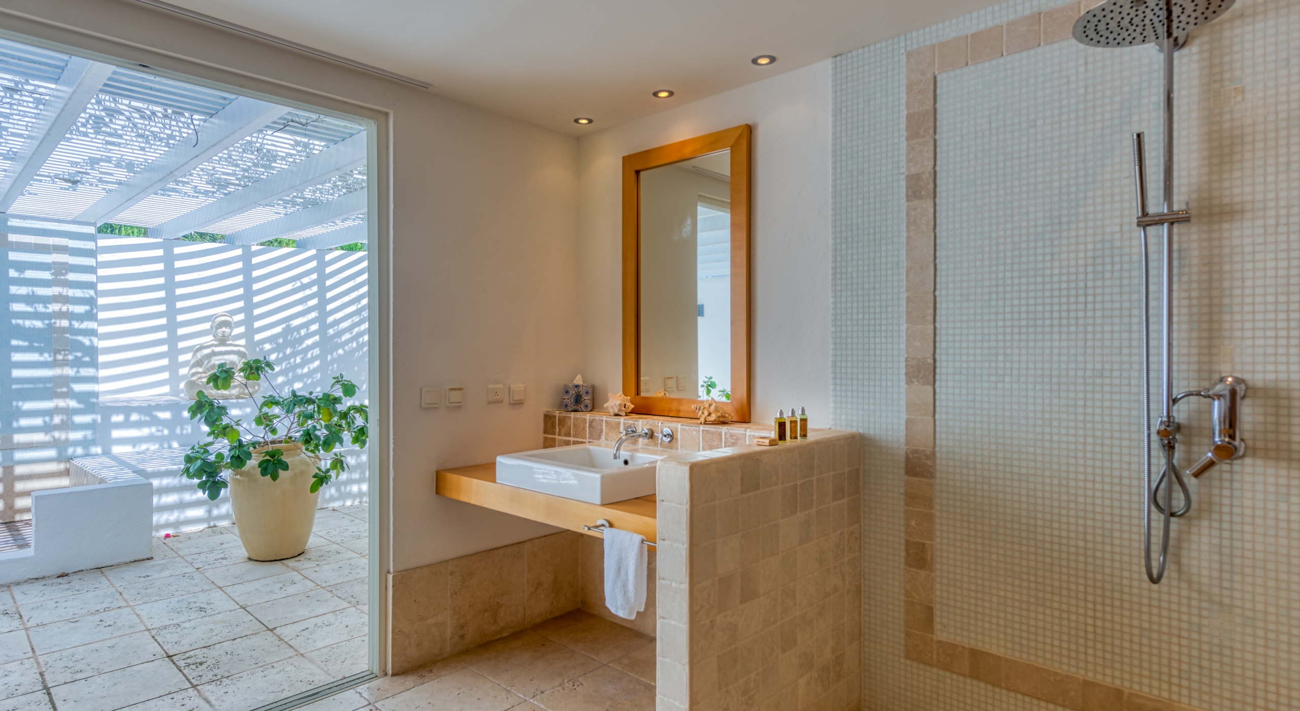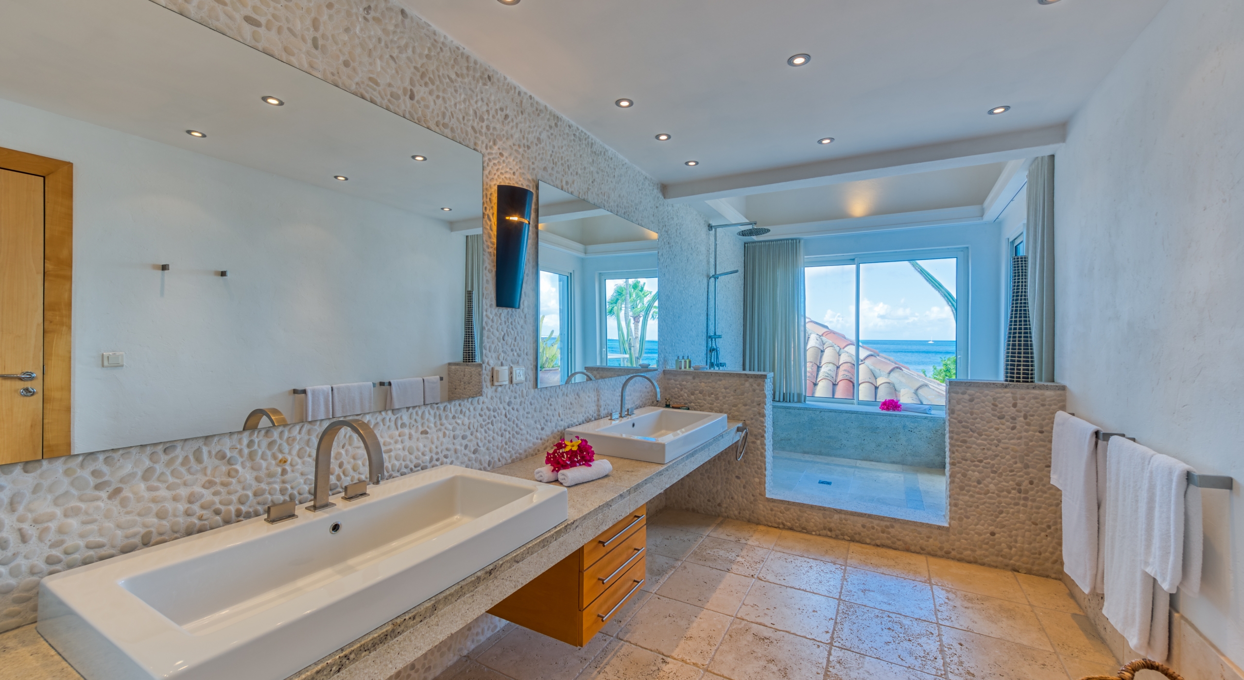 Five of the six-bedroom suites have sea views. All bedrooms have refrigerators, Wi-Fi, and flat-screen TVs. Five suites are at ground level. The master suite, with a large private terrace overlooking the sea, sits in a private oasis at the top of a marble staircase. Every bedroom has a stylish and unique decor plus stunning spa-style bathrooms in a mix of luxury surfaces. Several bathrooms have fantastic tubs and outdoor showers. One has wheelchair access. The sixth bedroom is in a private casita off the courtyard.