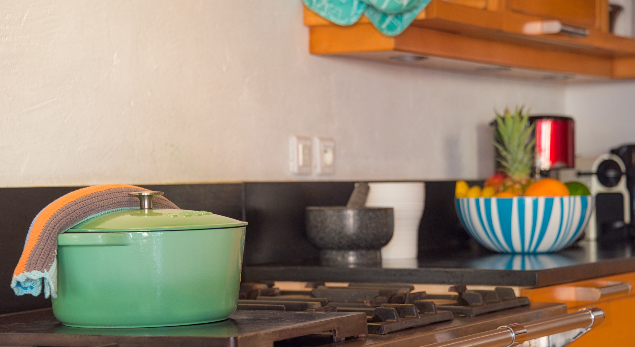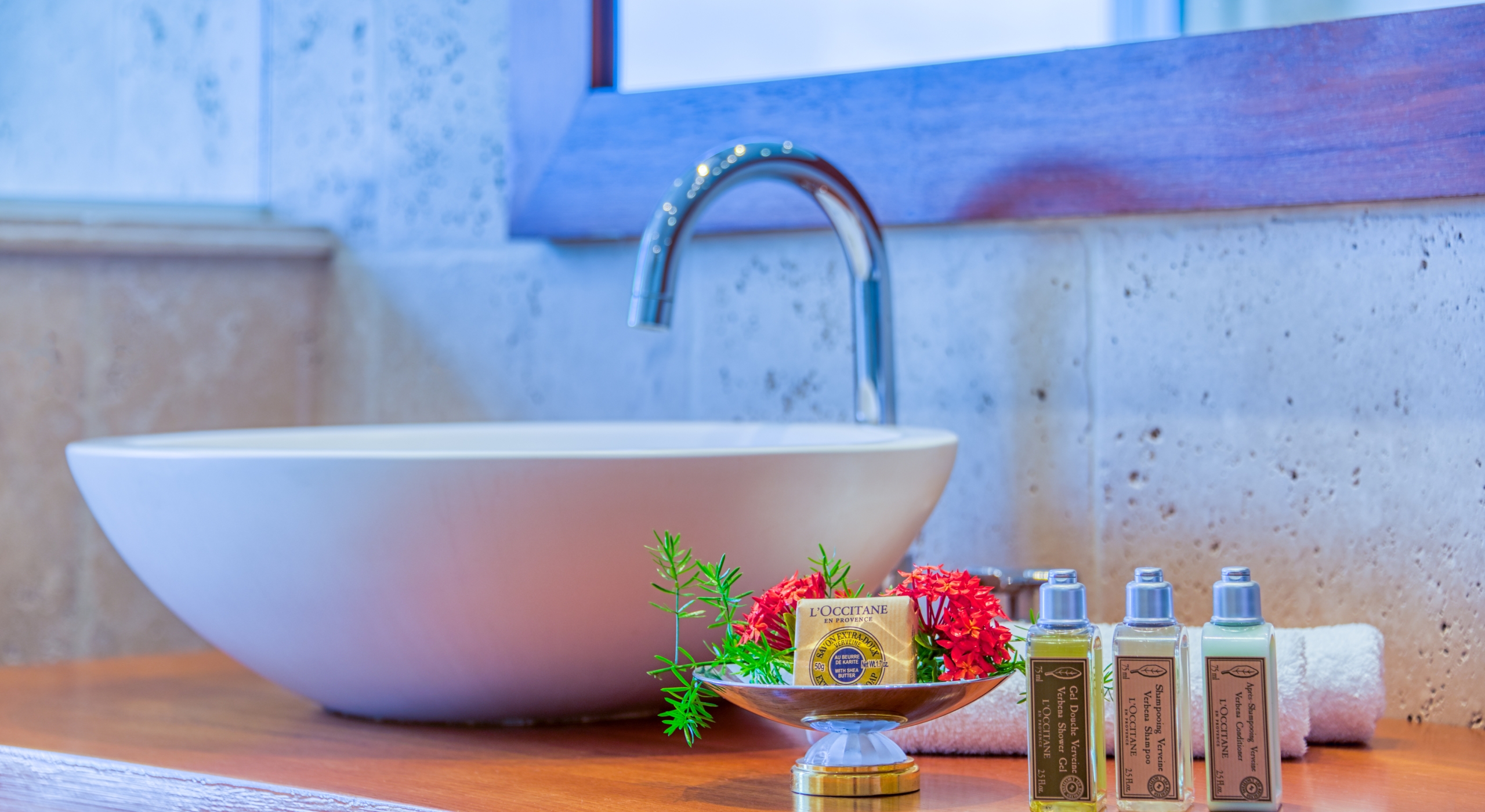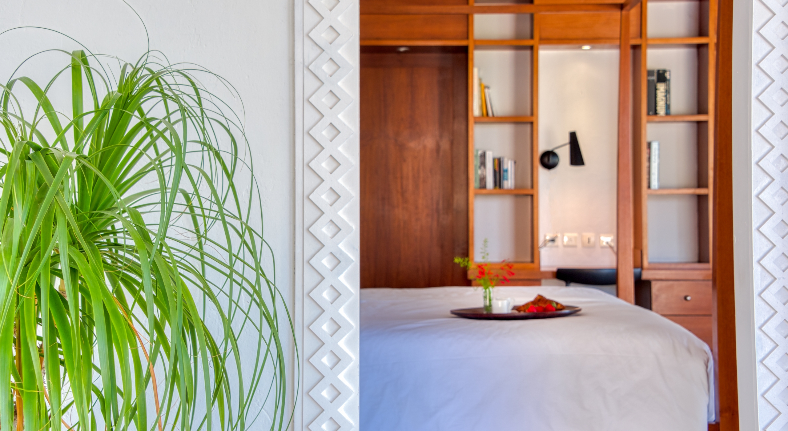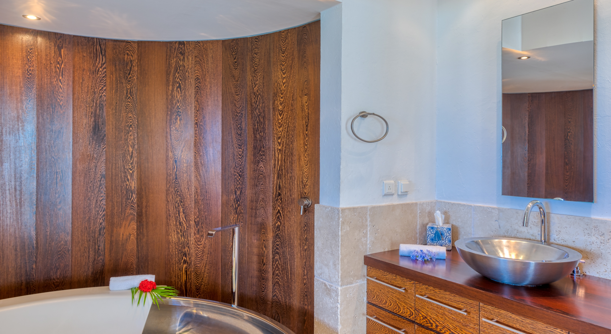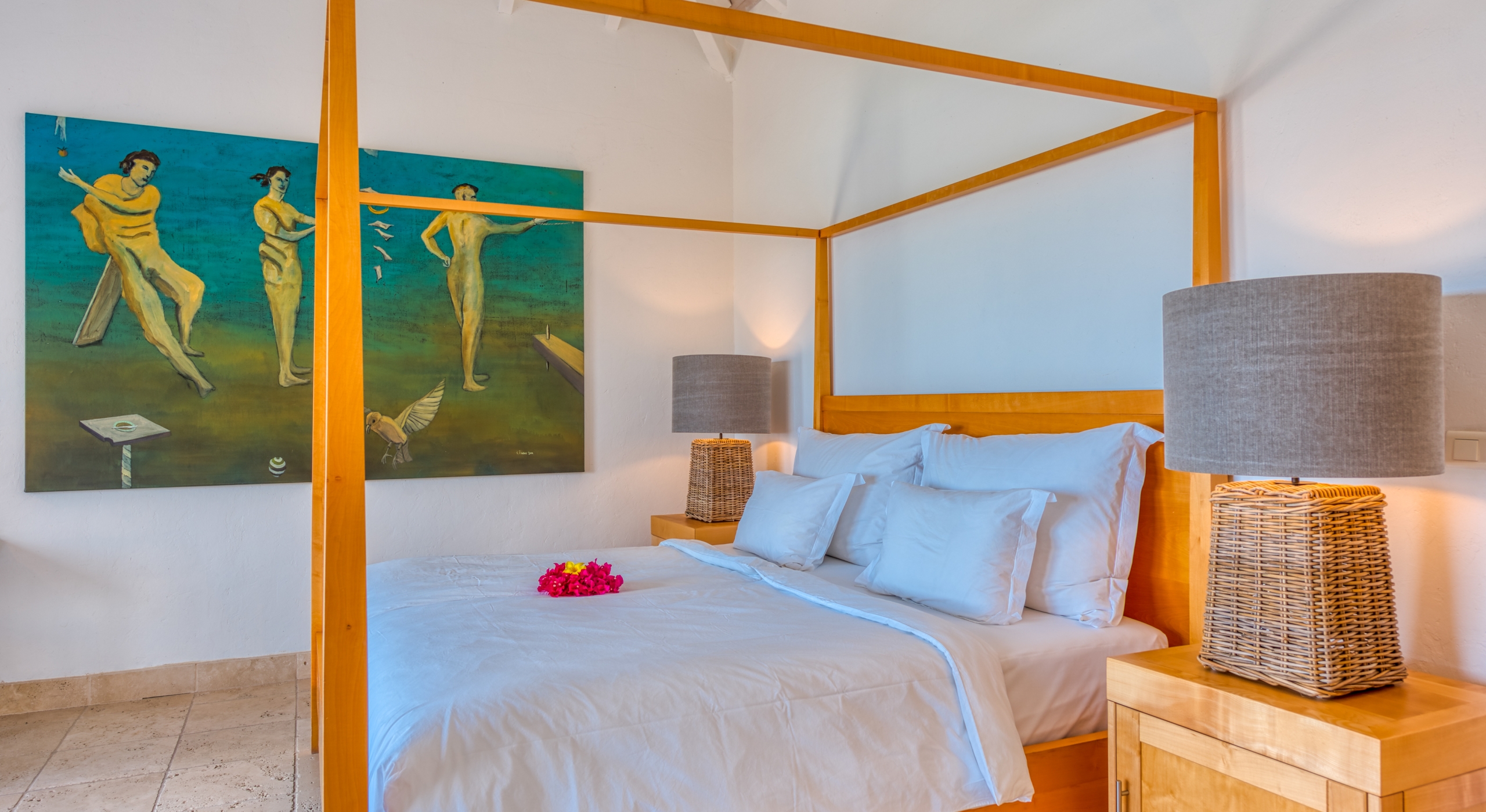 Five of the six-bedroom suites have sea views. All bedrooms have refrigerators, Wi-Fi, and flat-screen TVs. Five suites are at ground level. The master suite, with a large private terrace overlooking the sea, sits in a private oasis at the top of a marble staircase. Every bedroom has a stylish and unique decor plus stunning spa-style bathrooms in a mix of luxury surfaces. Several bathrooms have fantastic tubs and outdoor showers. One has wheelchair access. The sixth bedroom is in a private casita off the courtyard.