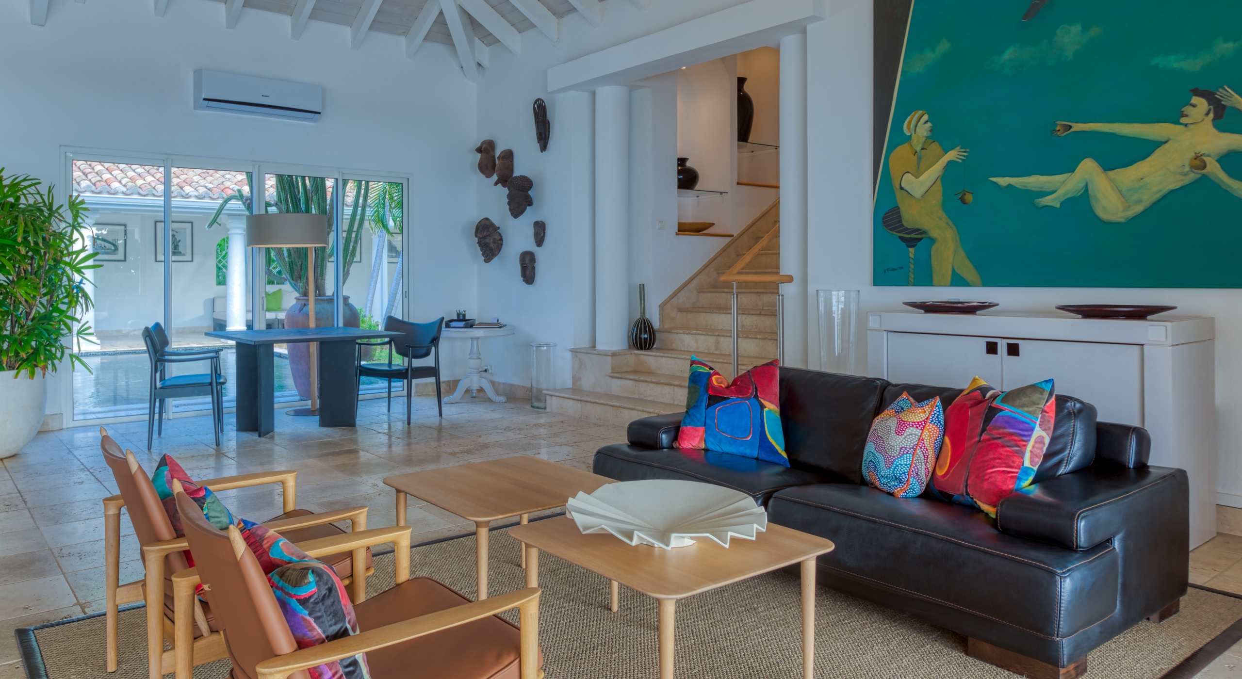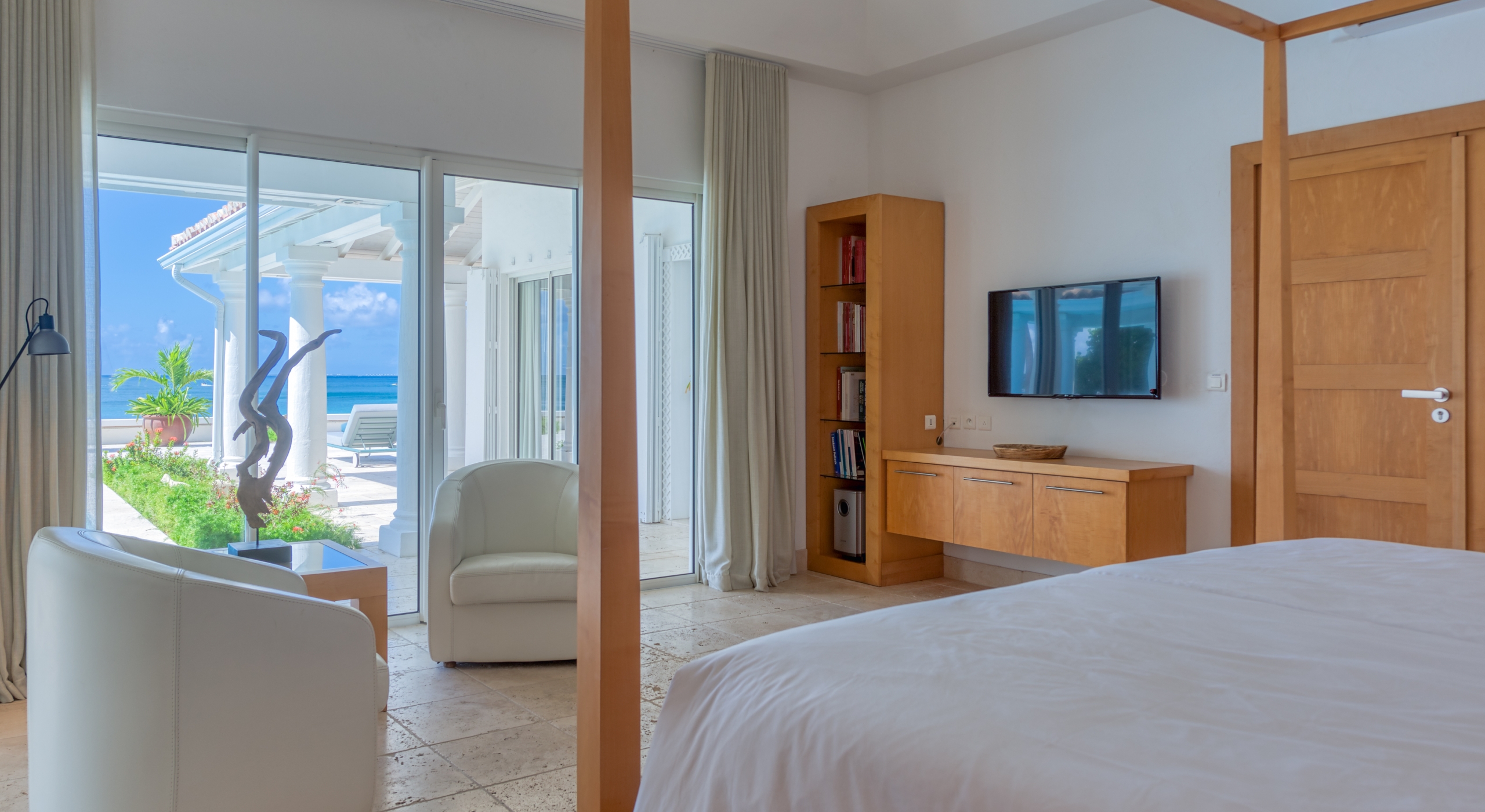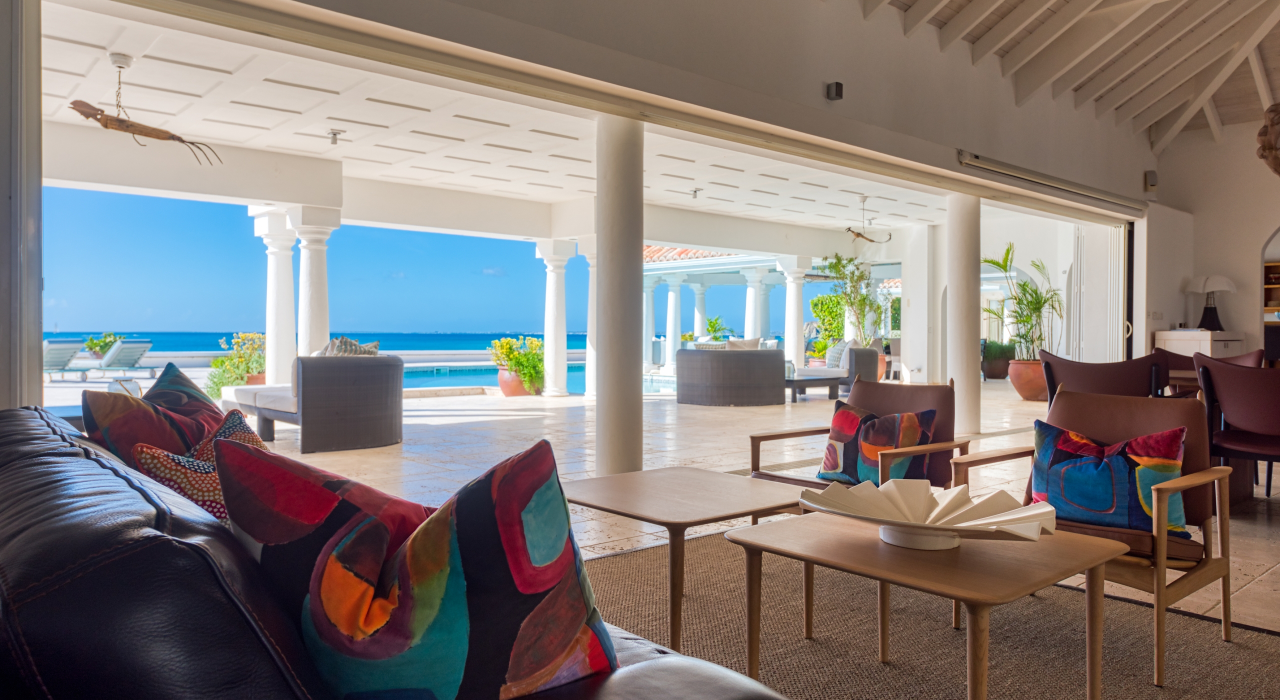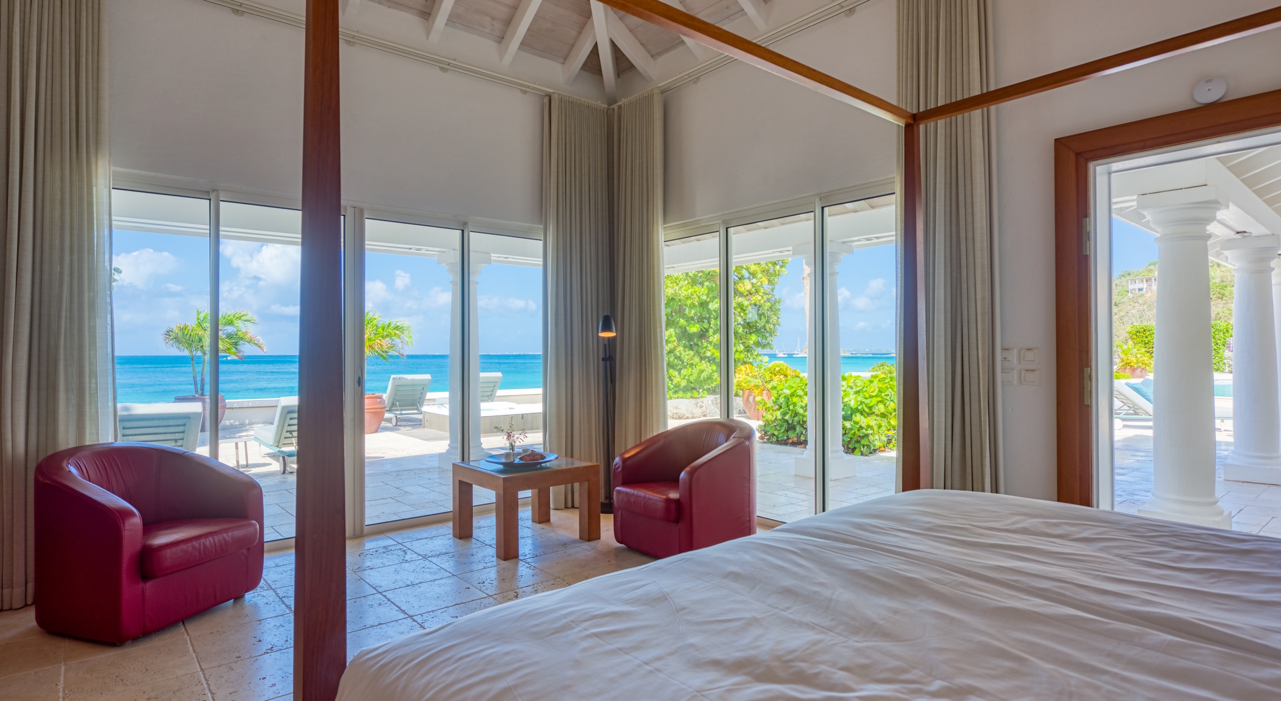 The interior spaces are spacious and airy; completely air-conditioned or fully open to the sea breeze. Travertine floors flow inside to outside. Sleek furnishings in black, white, reds, and light teak define the seating and dining areas, complemented by contemporary accessories and art. The villa has two state of the art AV/media systems; one in the living room and one in a separate media room with an adjacent private office. A superb chef's kitchen, in blond, steel, and black, opens to the sea views and both the indoor and outdoor dining areas.