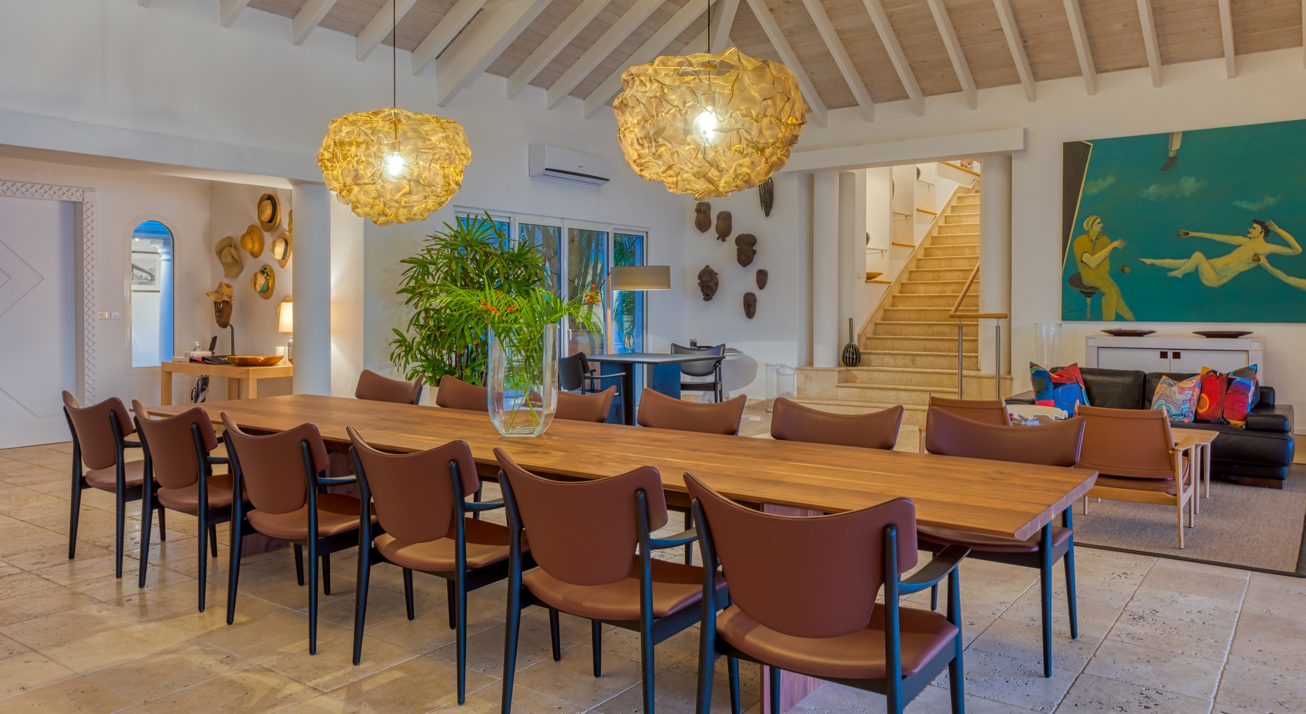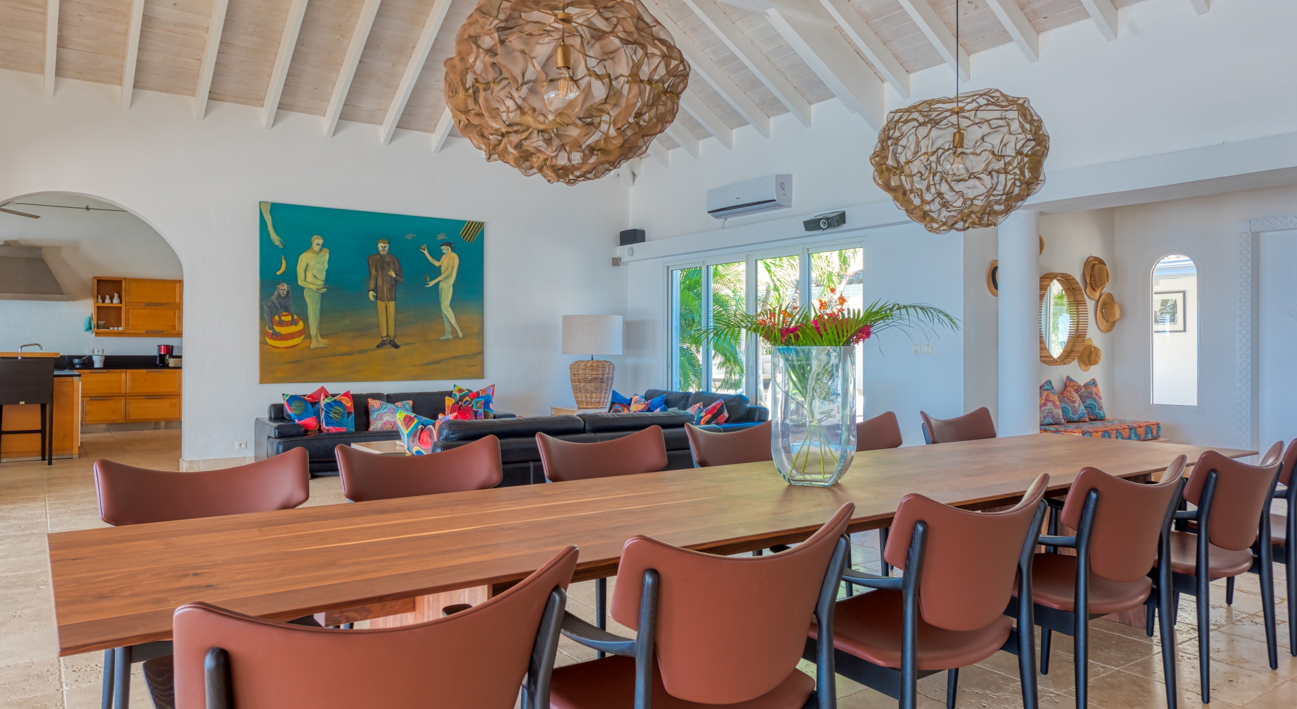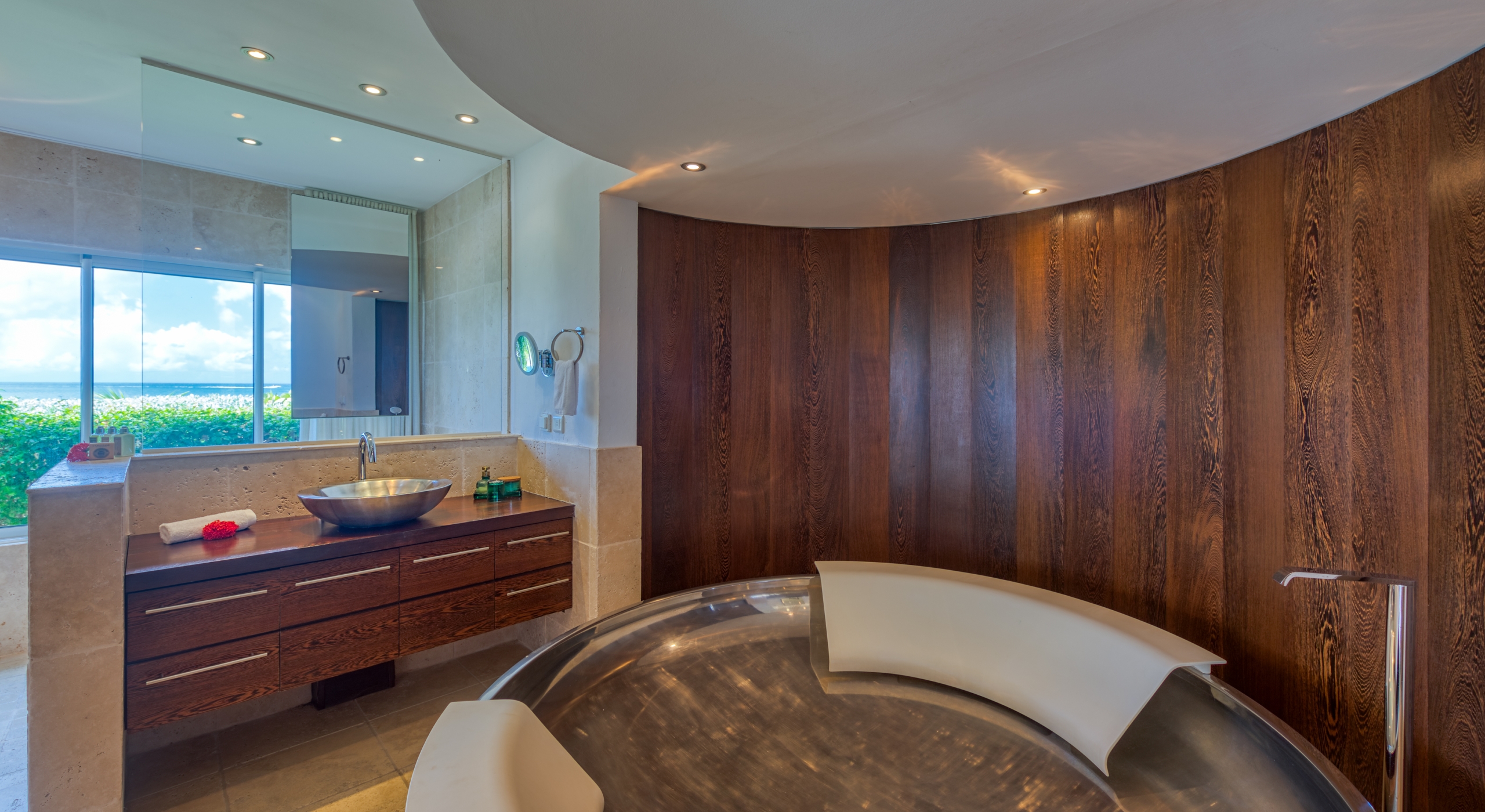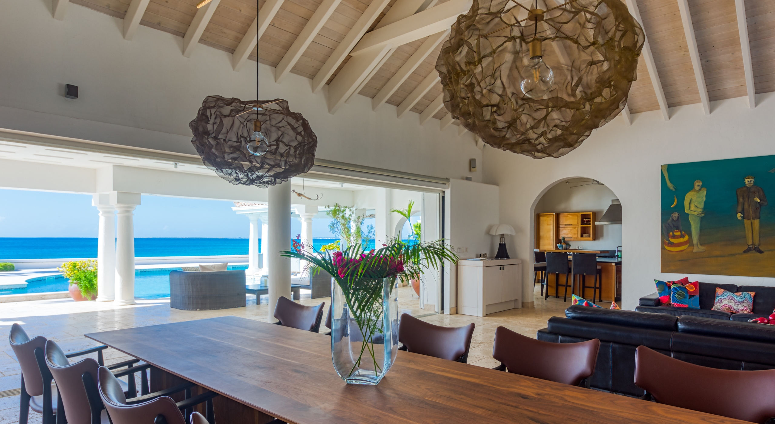 The interior spaces are spacious and airy; completely air-conditioned or fully open to the sea breeze. Travertine floors flow inside to outside. Sleek furnishings in black, white, reds, and light teak define the seating and dining areas, complemented by contemporary accessories and art. The villa has two state of the art AV/media systems; one in the living room and one in a separate media room with an adjacent private office. A superb chef's kitchen, in blond, steel, and black, opens to the sea views and both the indoor and outdoor dining areas.