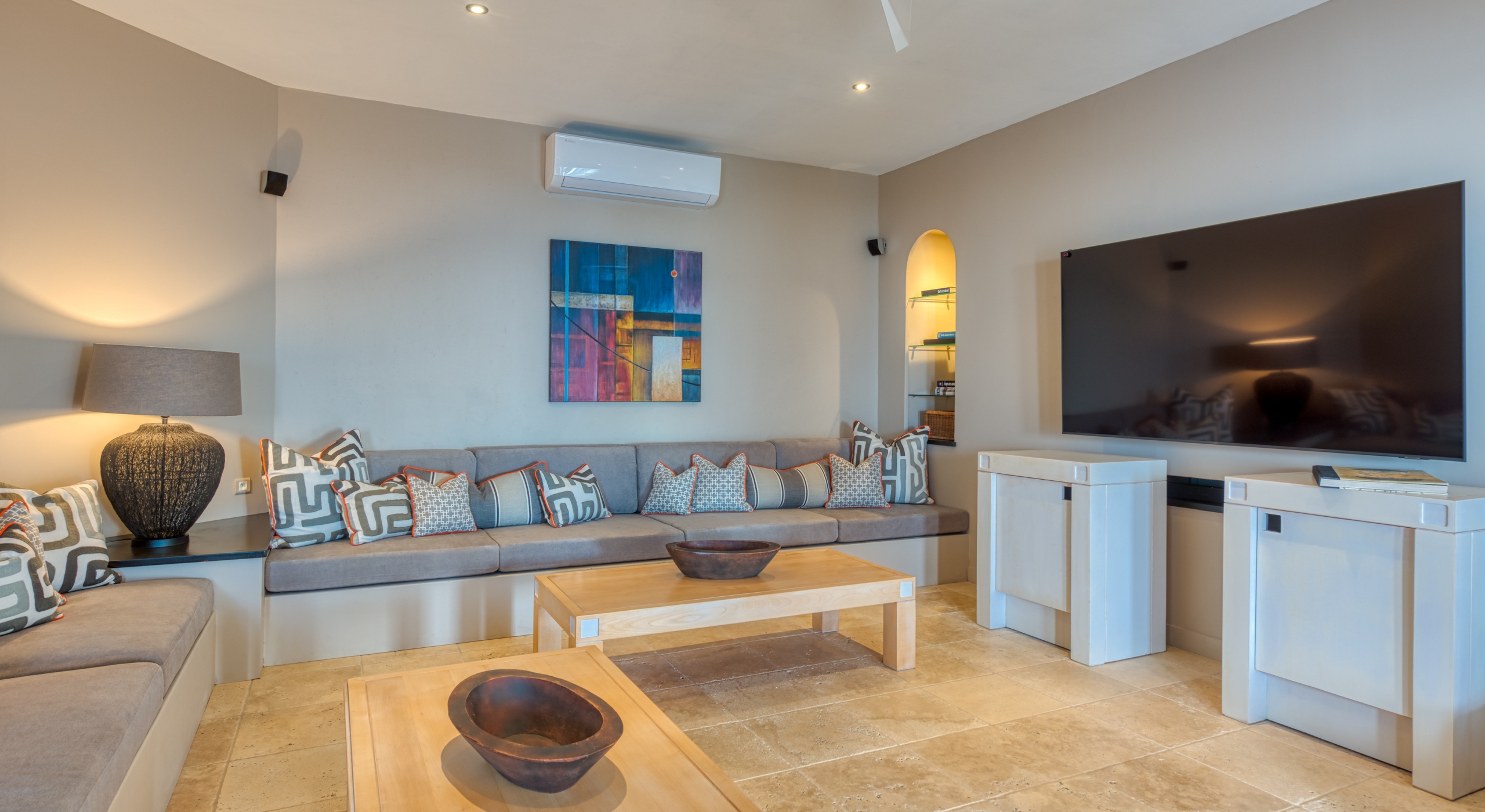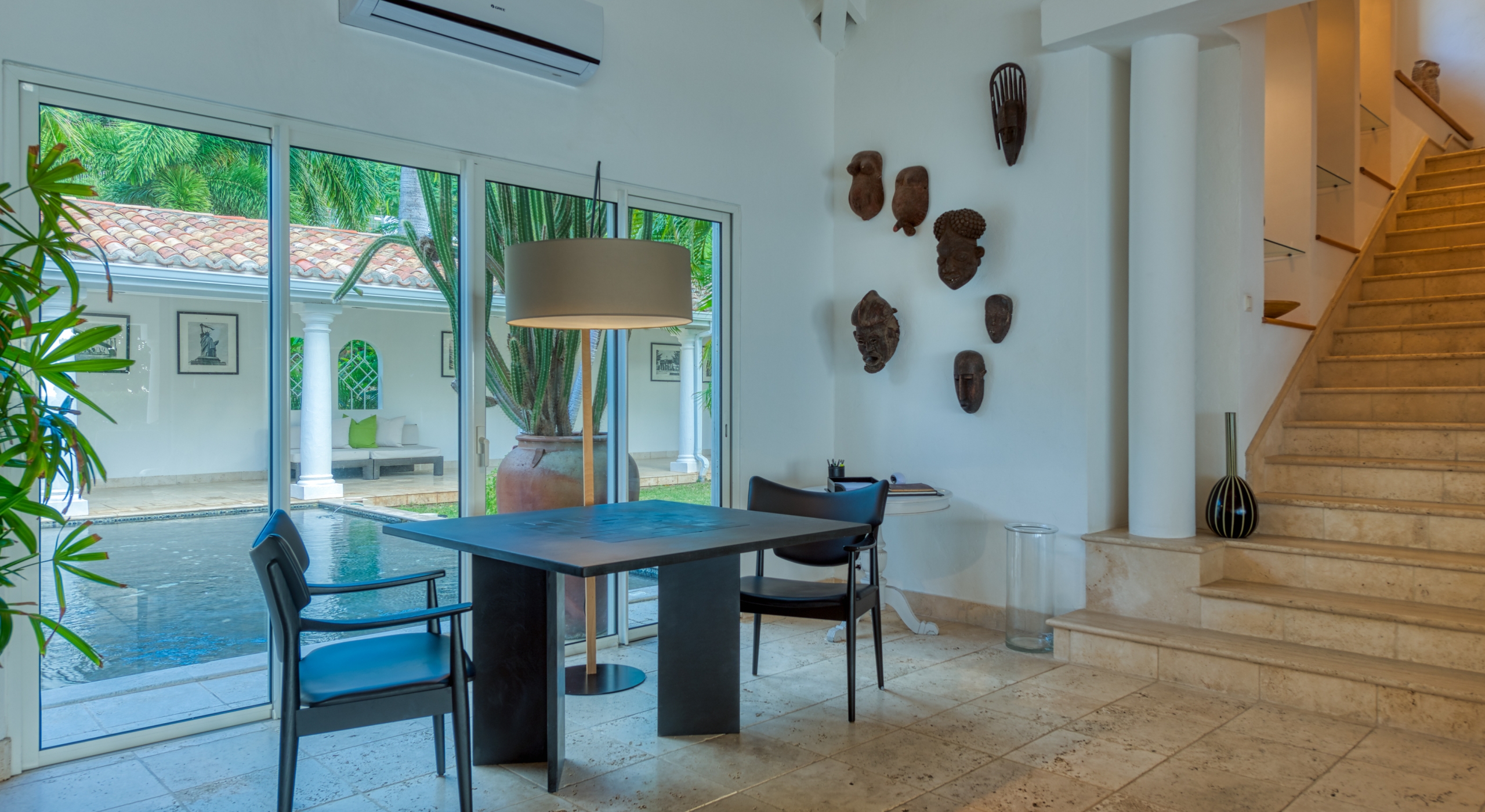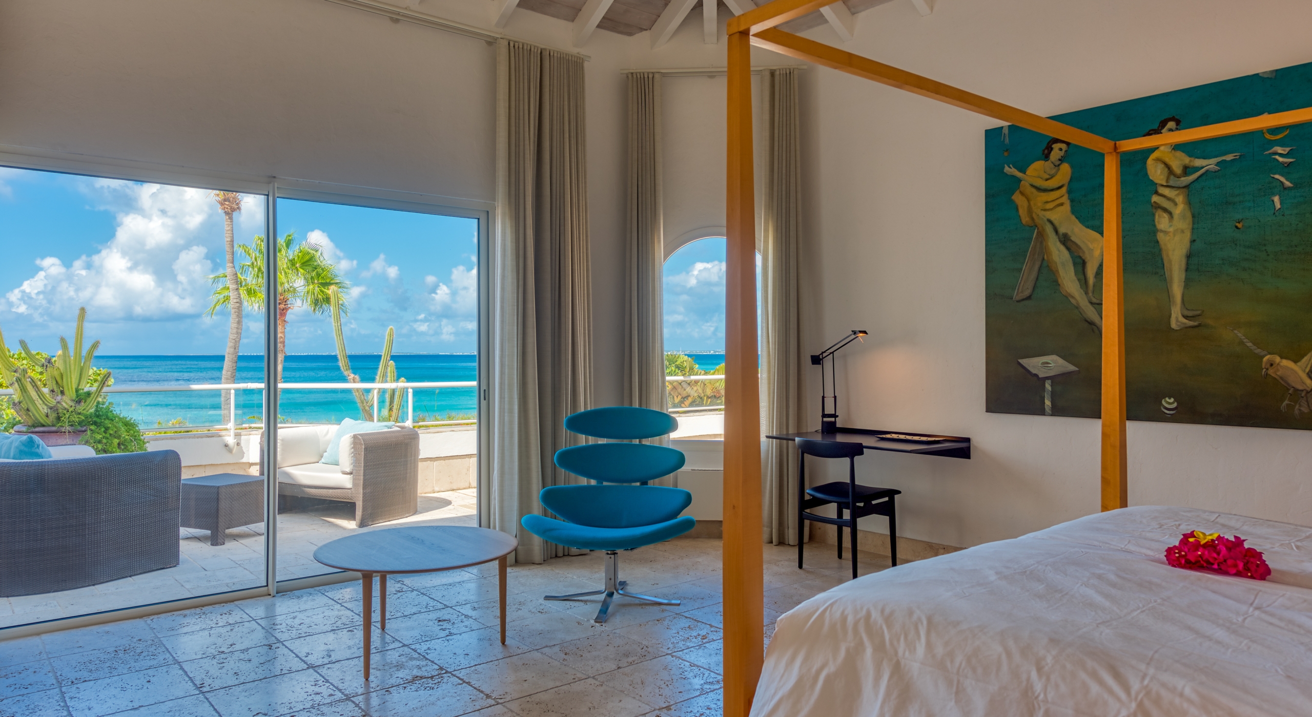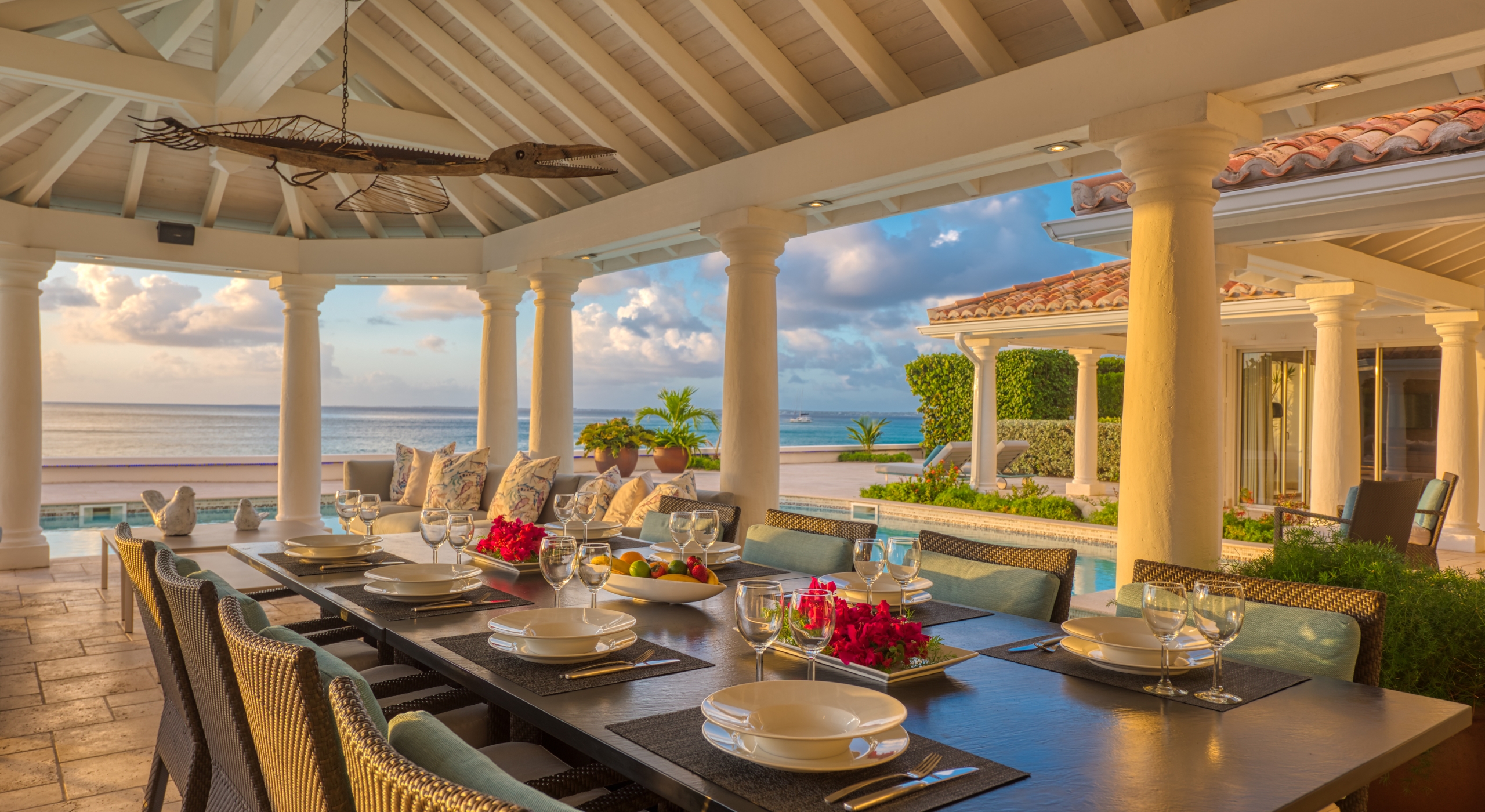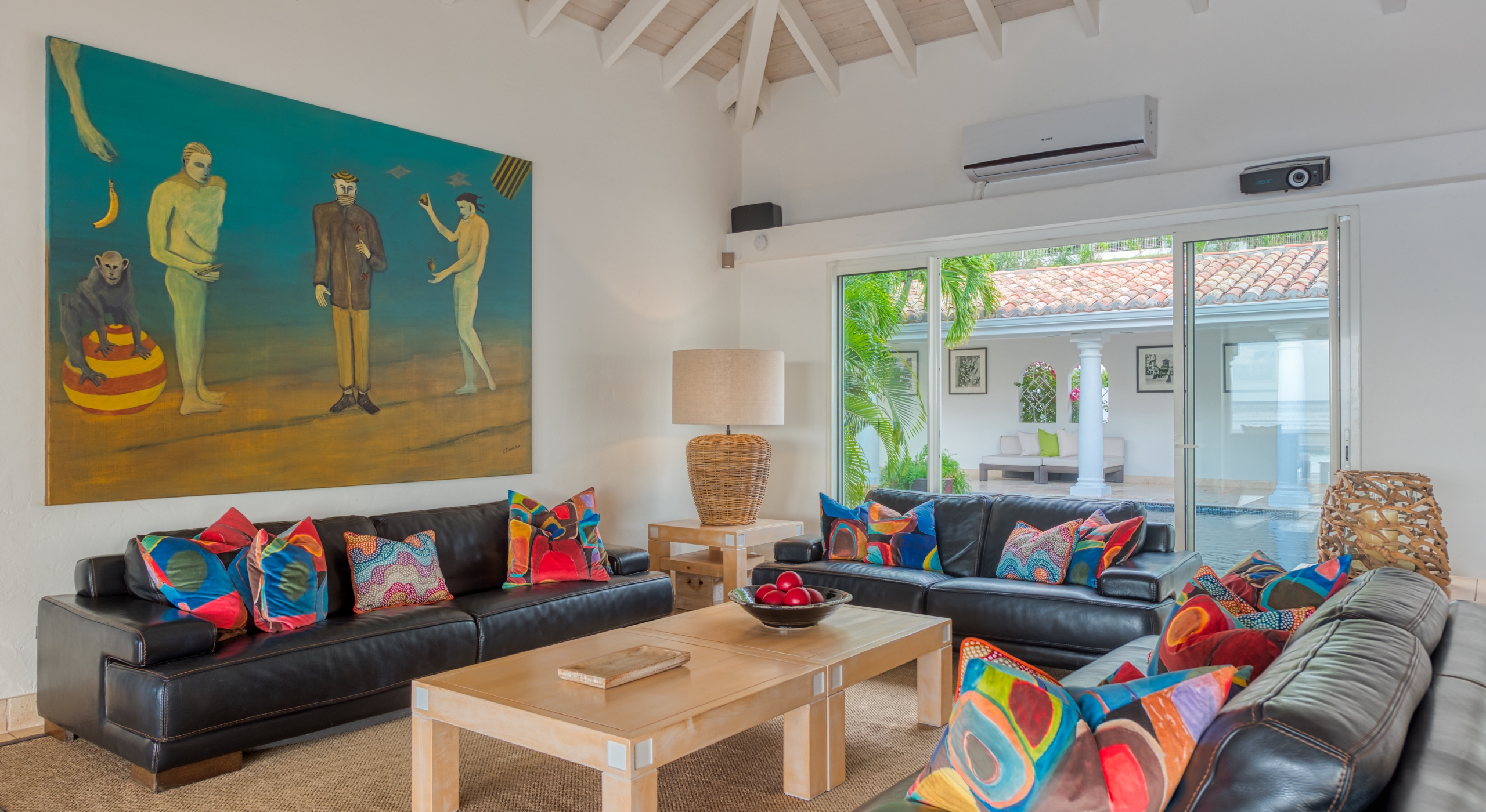 The interior spaces are spacious and airy; completely air-conditioned or fully open to the sea breeze. Travertine floors flow inside to outside. Sleek furnishings in black, white, reds, and light teak define the seating and dining areas, complemented by contemporary accessories and art. The villa has two state of the art AV/media systems; one in the living room and one in a separate media room with an adjacent private office. A superb chef's kitchen, in blond, steel, and black, opens to the sea views and both the indoor and outdoor dining areas.