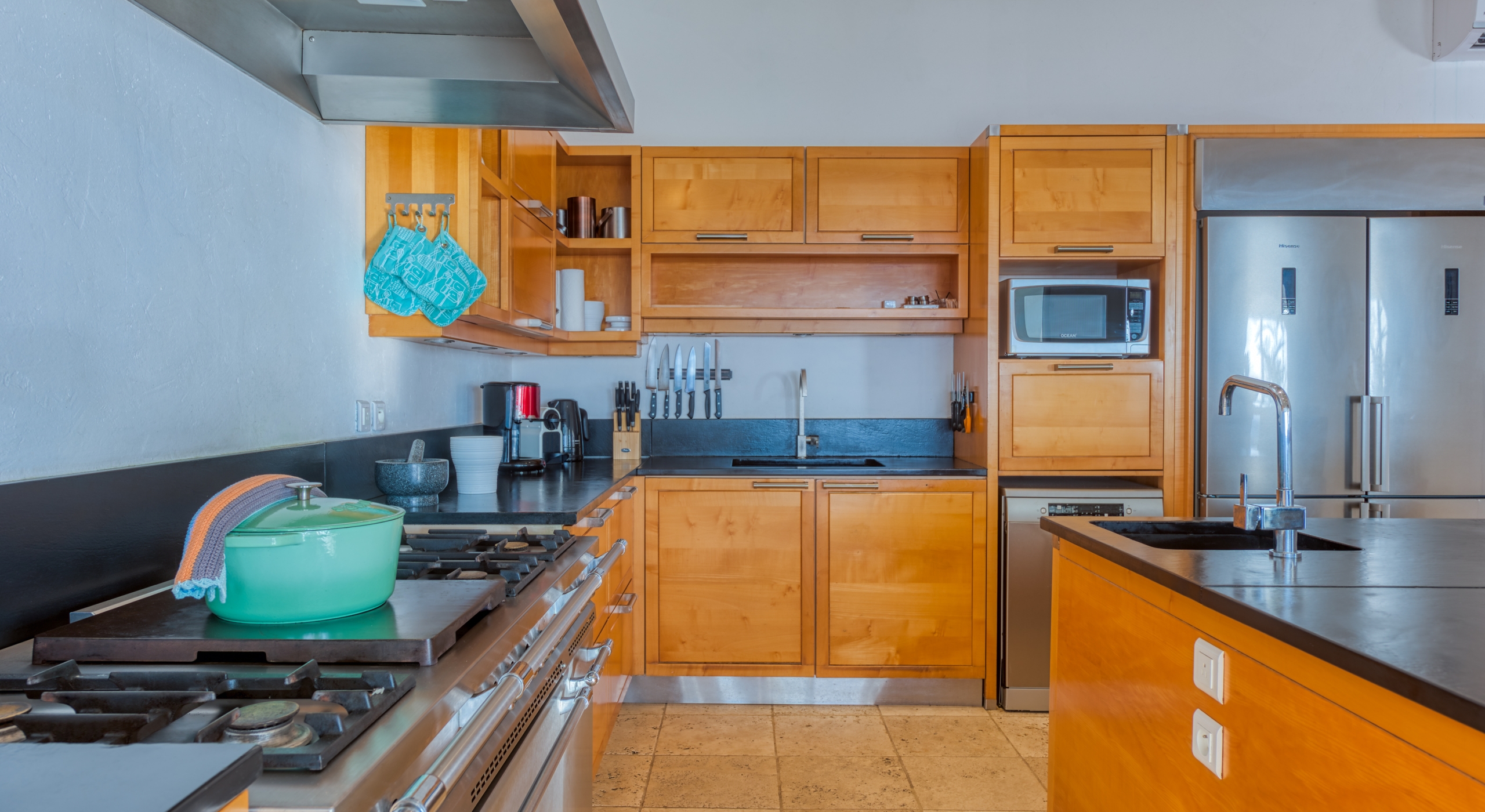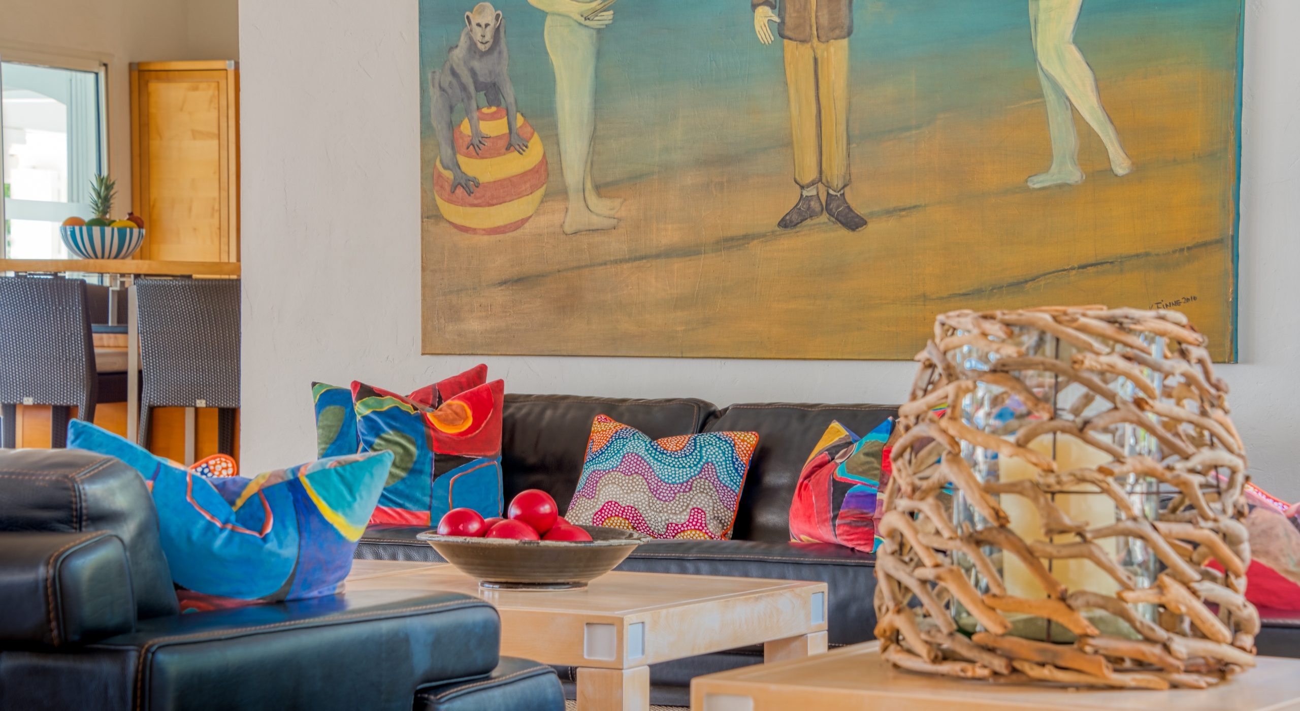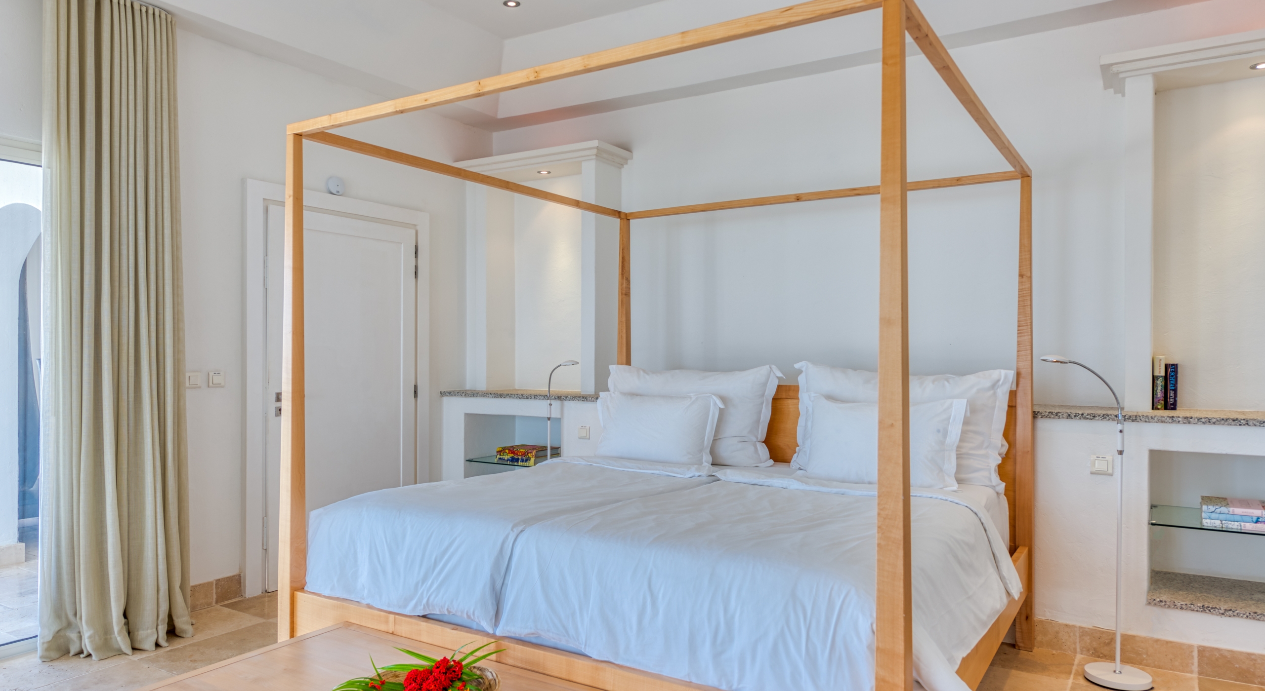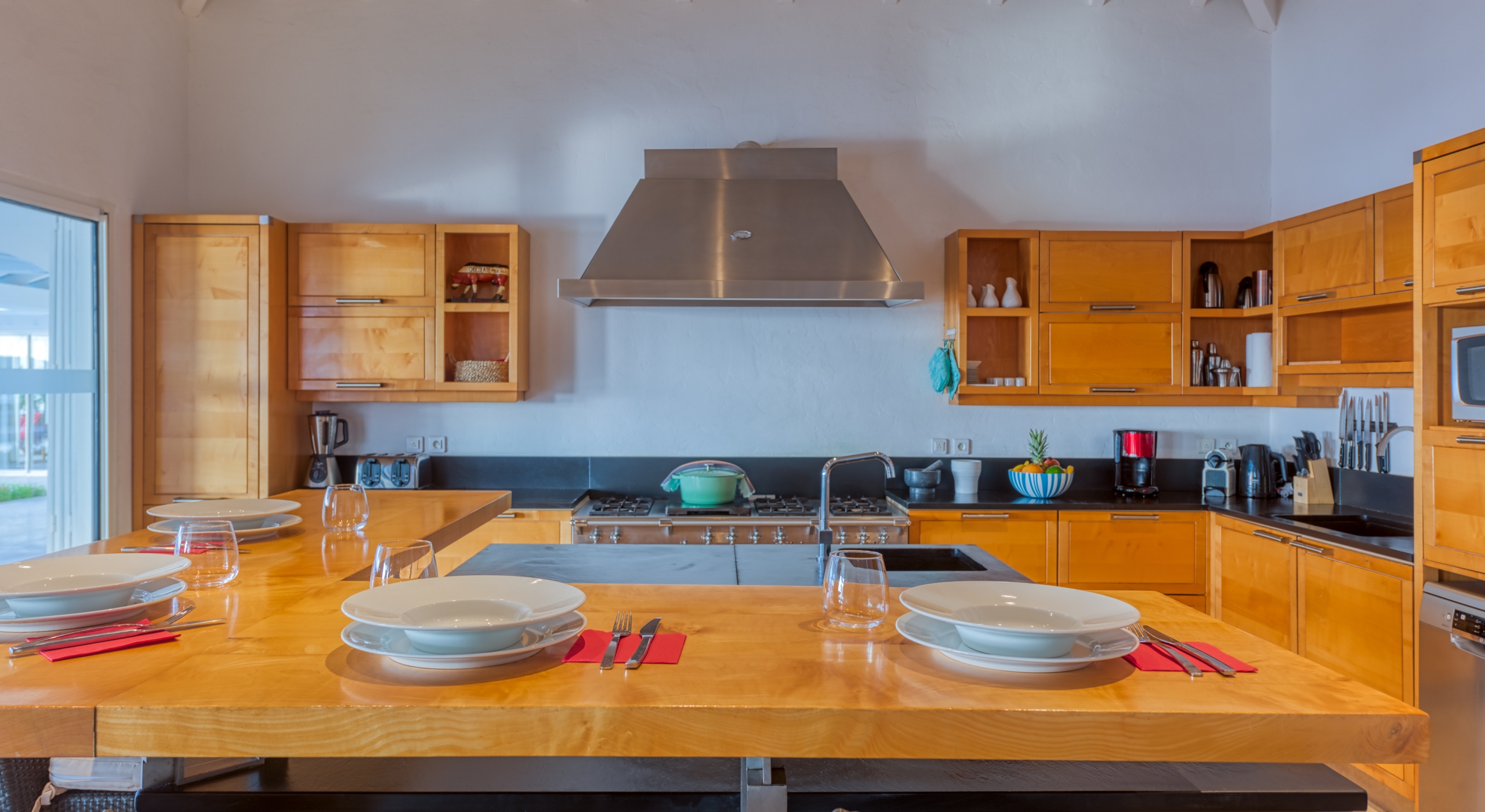 The interior spaces are spacious and airy; completely air-conditioned or fully open to the sea breeze. Travertine floors flow inside to outside. Sleek furnishings in black, white, reds, and light teak define the seating and dining areas, complemented by contemporary accessories and art. The villa has two state of the art AV/media systems; one in the living room and one in a separate media room with an adjacent private office. A superb chef's kitchen, in blond, steel, and black, opens to the sea views and both the indoor and outdoor dining areas.