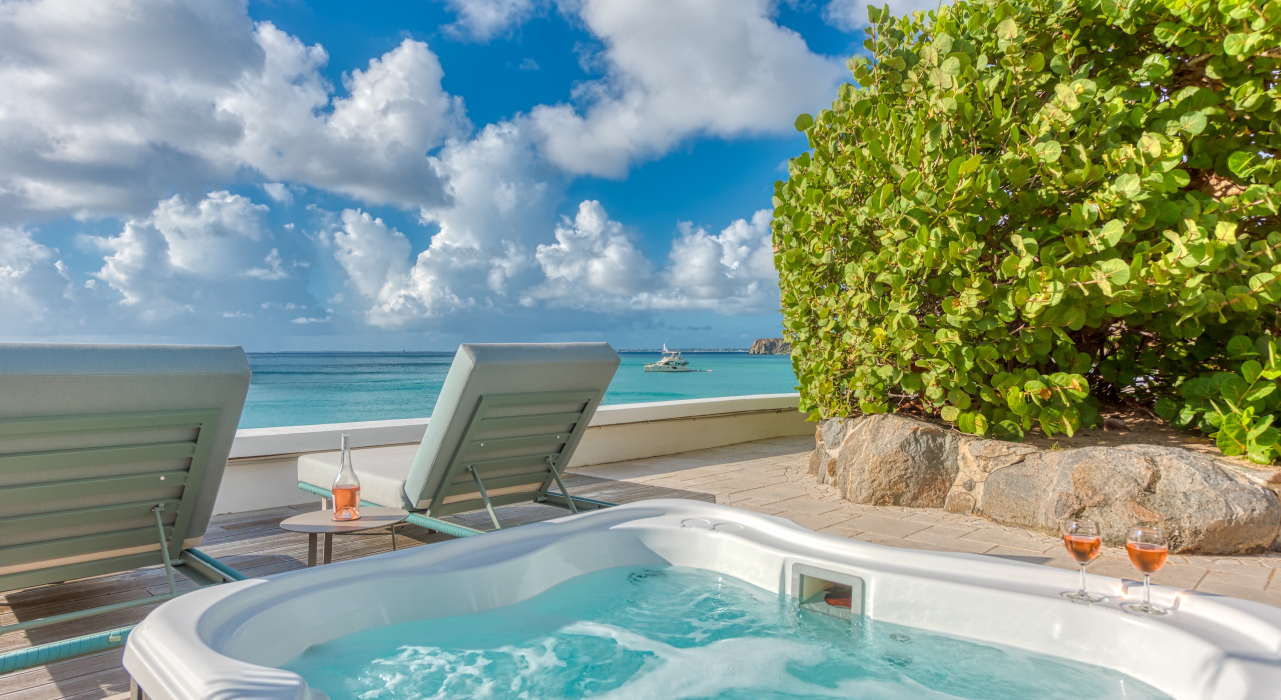 Covered and open terraces span the length of this estate villa. The large horseshoe-shaped heated pool sits at the sea's edge. In the center of the horseshoe is a covered loggia for relaxing by the pool. A hot tub sits near sits nearby for ultimate relaxation. Additionally, the villa also has an onsite manager skilled in taking care of your needs and easy access down the beach to Grand Case Beach Club restaurant and bar.